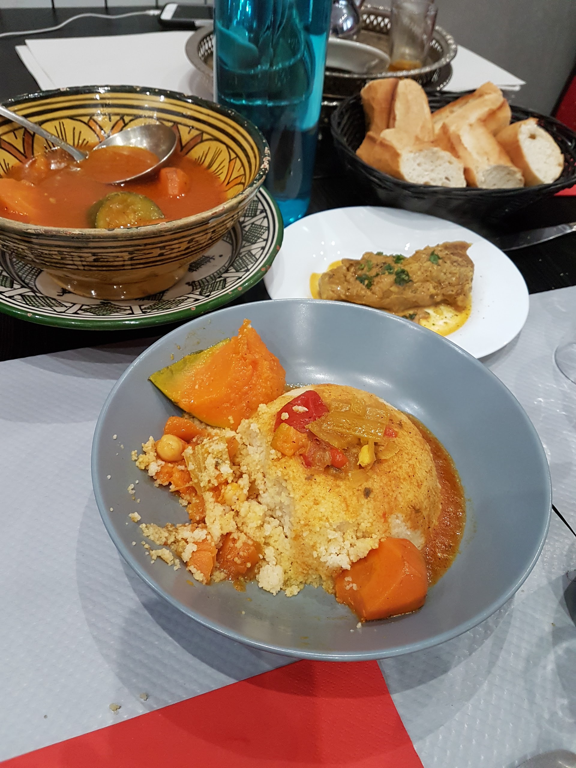 -On a commandé un couscous royal et un végétarien, car on pensait que le royal avait beaucoup de viande, mais c'était pas le cas - n'ayez pas peur à demander 2 couscous royal par personne -Possibilité de redemander de la semoule et des légumes une fois l'assiette fini !!!! (pour ne pas gaspiller) -L'endroit était calme, bonne ambiance -Comptez environ 15-25€ par personne - Le thé est très bon !