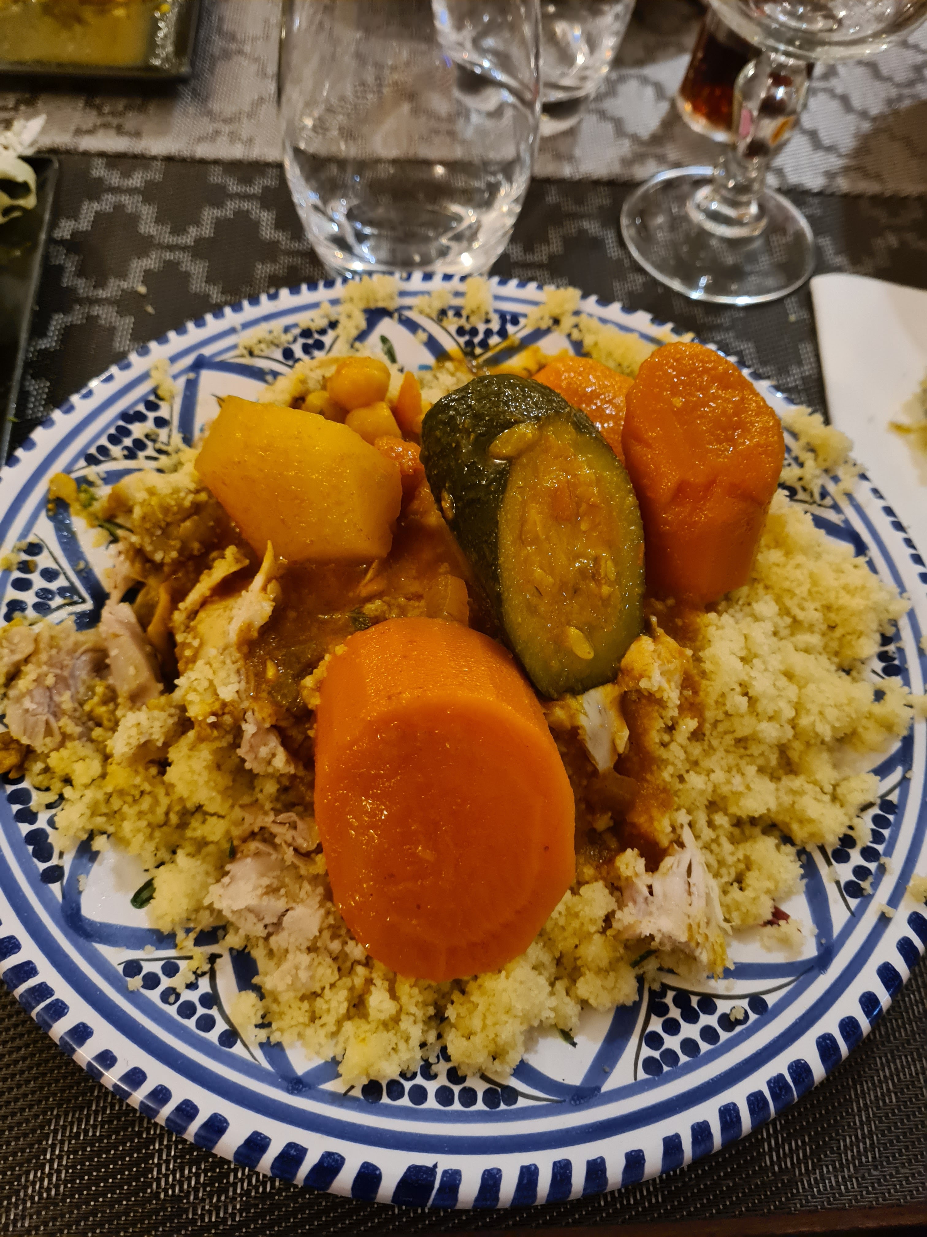 Couscous et tajines très bon. On a juste été déçu du thé gourmand : à part le thé à la menthe et le makrout, pas de dessert typique (glace, salade de fruit et fromage blanc).