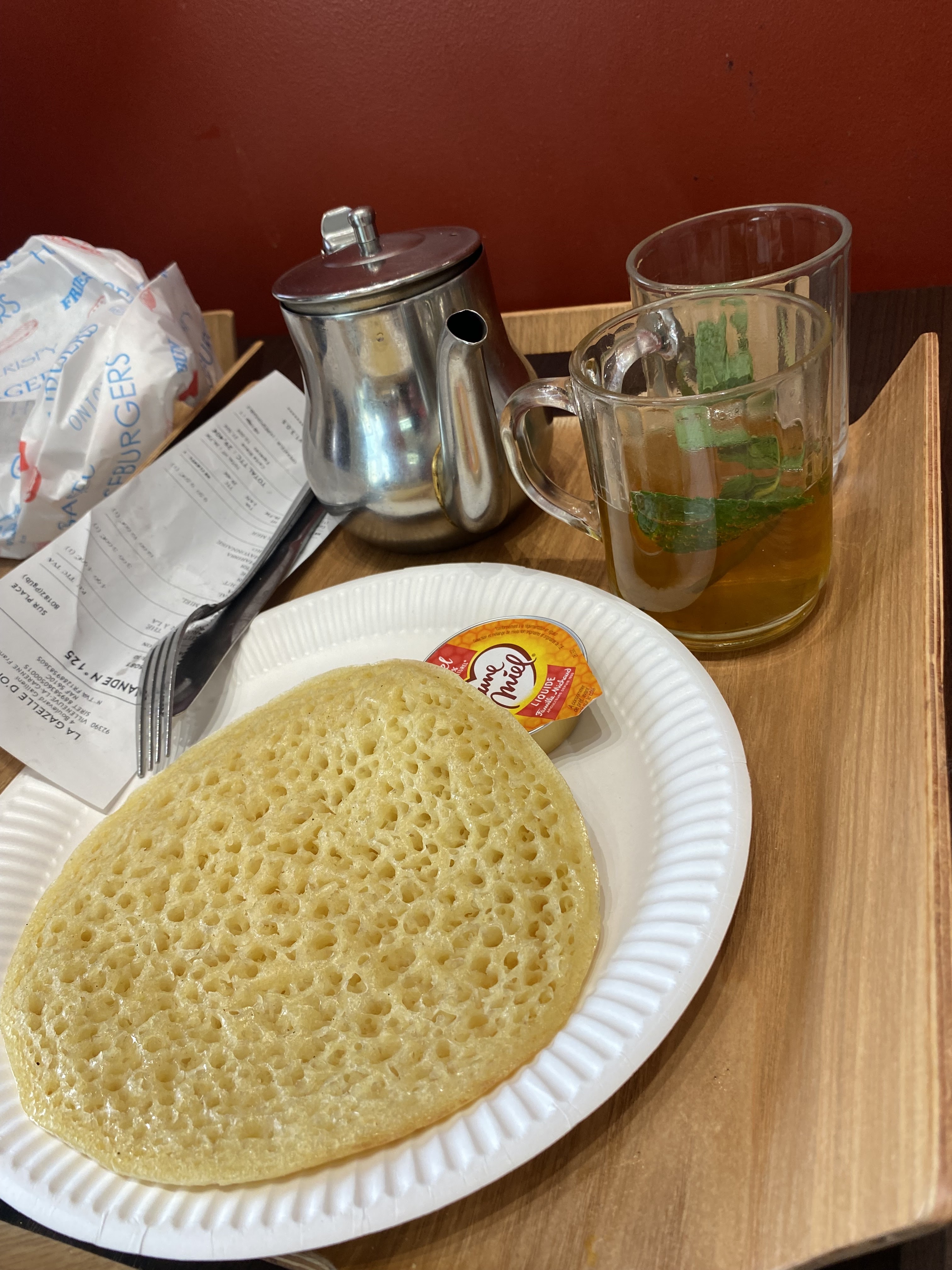 7 euros 1 msemen sans beurre ni miel avec un thé amer et un jus de grande surface. Pas ouf!!