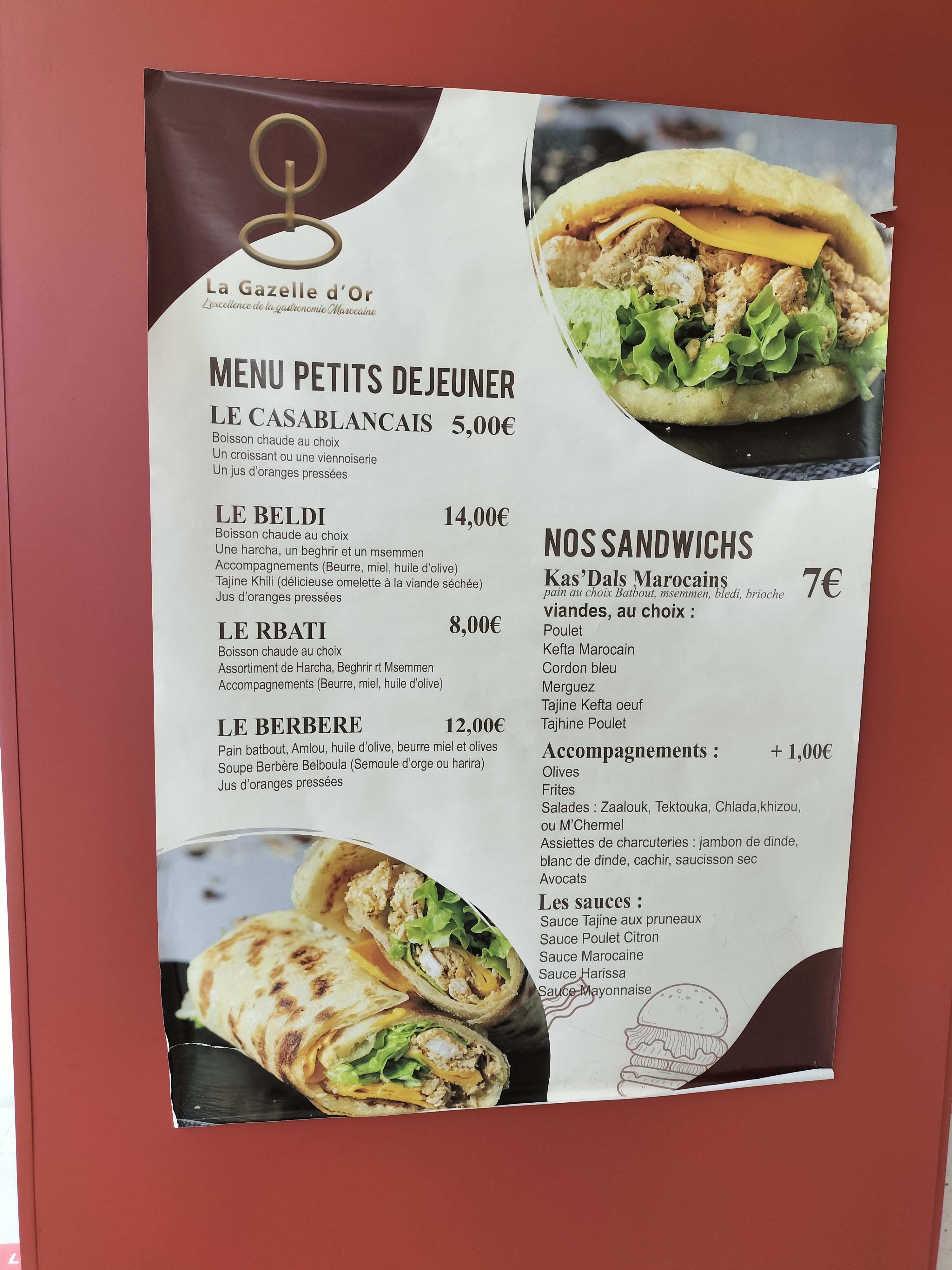 Faut revoir la carte … les petits déjeuners ne sont pas marocains … depuis quand on prend des frites au petit dej 😅 avec un coca lol 7,50€ pour une omelette sans goût avec un thé …