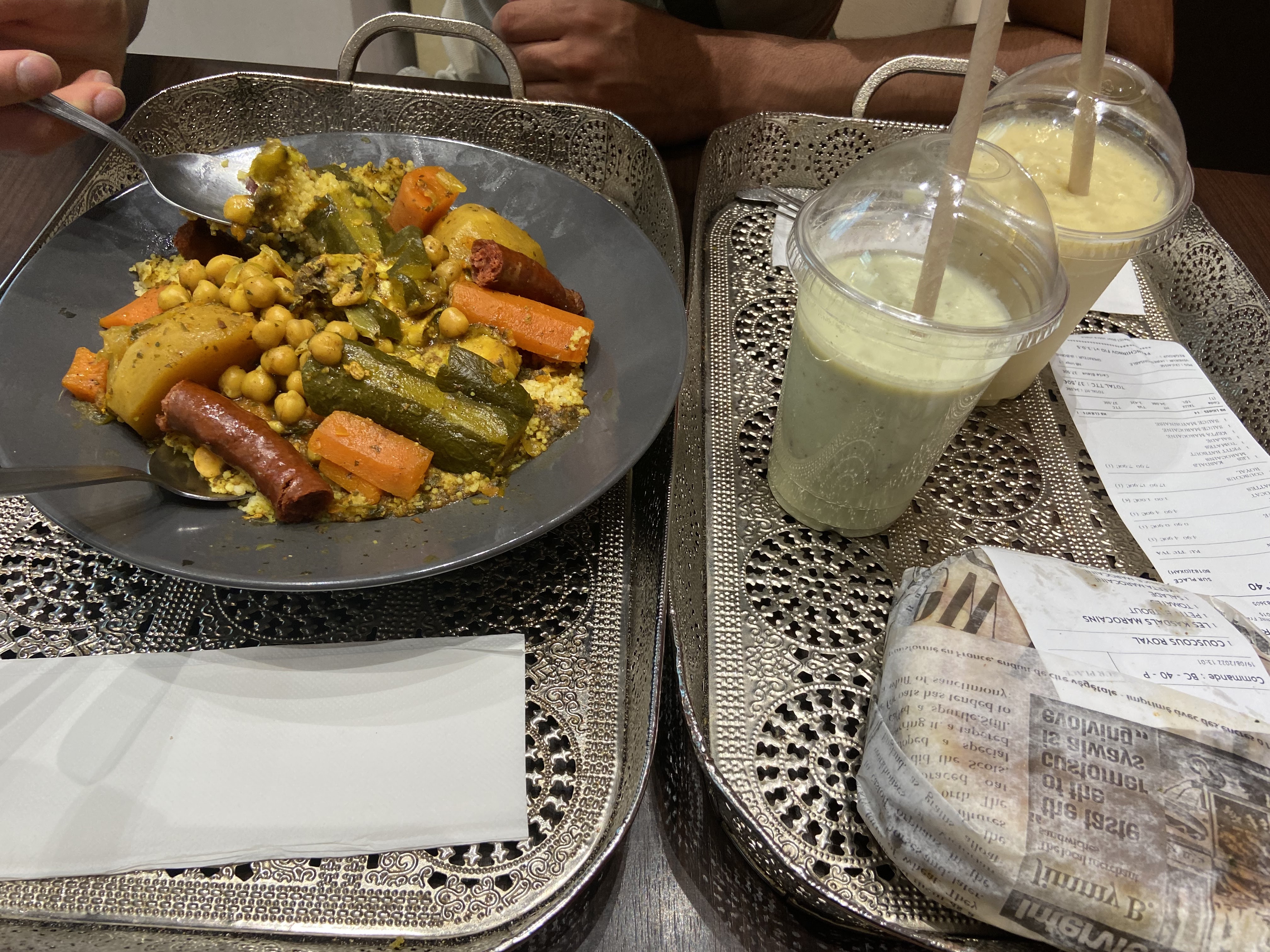 J’ai pris un couscous à emporter . Le couscous est vraiment bon . La sauce épaisse la viande aussi . Mais j’ai étais déçu de ma portion de couscous . Il y en avait très peu . Plus de sauce que de couscous . Le msemen assez fade .