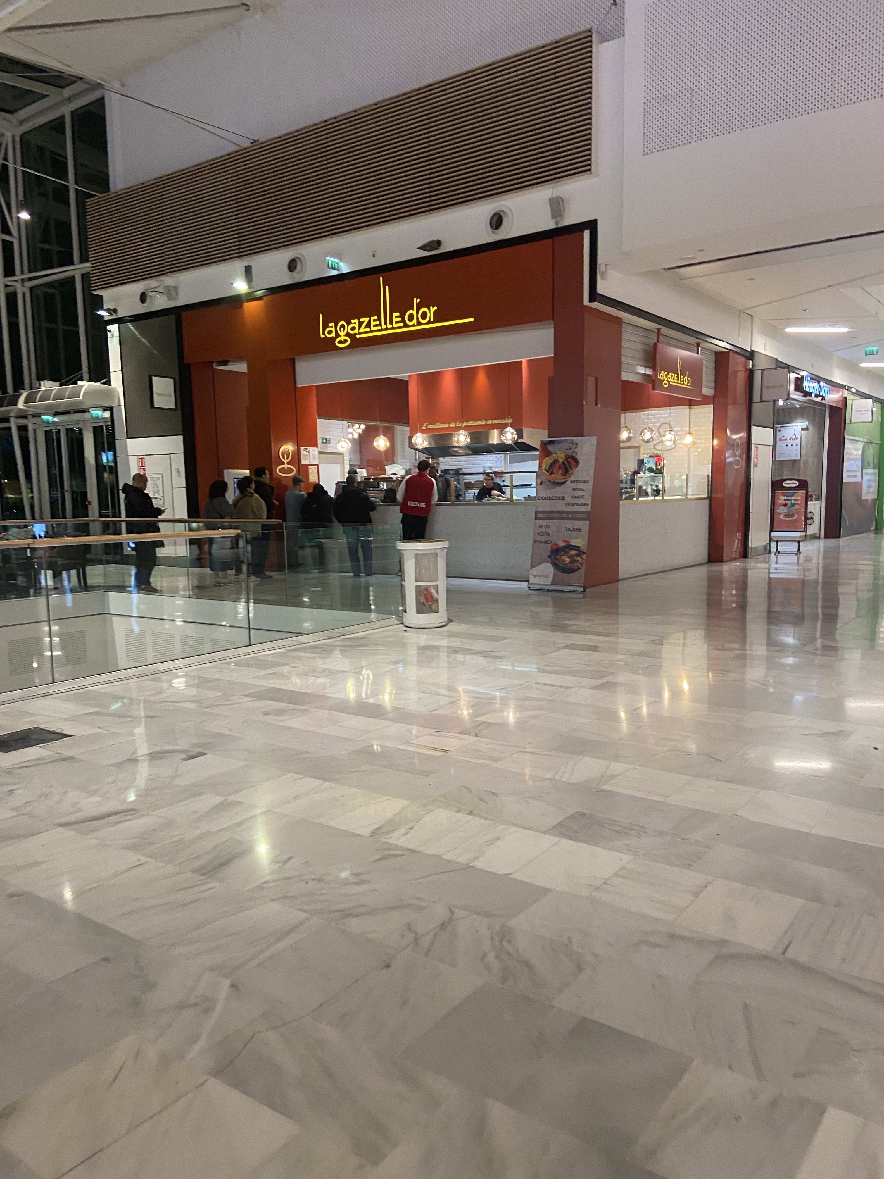 Je suis très surpris de voir de tels commentaires négatifs. Alors oui il faut être patient au moment de la prise de commande puis pour payer puis à nouveau pour récupérer sa commande. Mais c'est la rançon du succès et l'attente vaut vraiment la peine ! On se croirait dans un vulgaire fast food comme il y en a plein dans le centre commercial, et au final on déguste de la vraie cuisine marocaine faite sur place. On a pris des Koftas et des Pastillas. C'était un vrai délice ! J'y retournerai chaque fois que j'irai à Quartz, c'est clair ! Dommage qu'il n'y ait pas d'autres restaurants La Gazelle d'Or, cela cartonnerait !