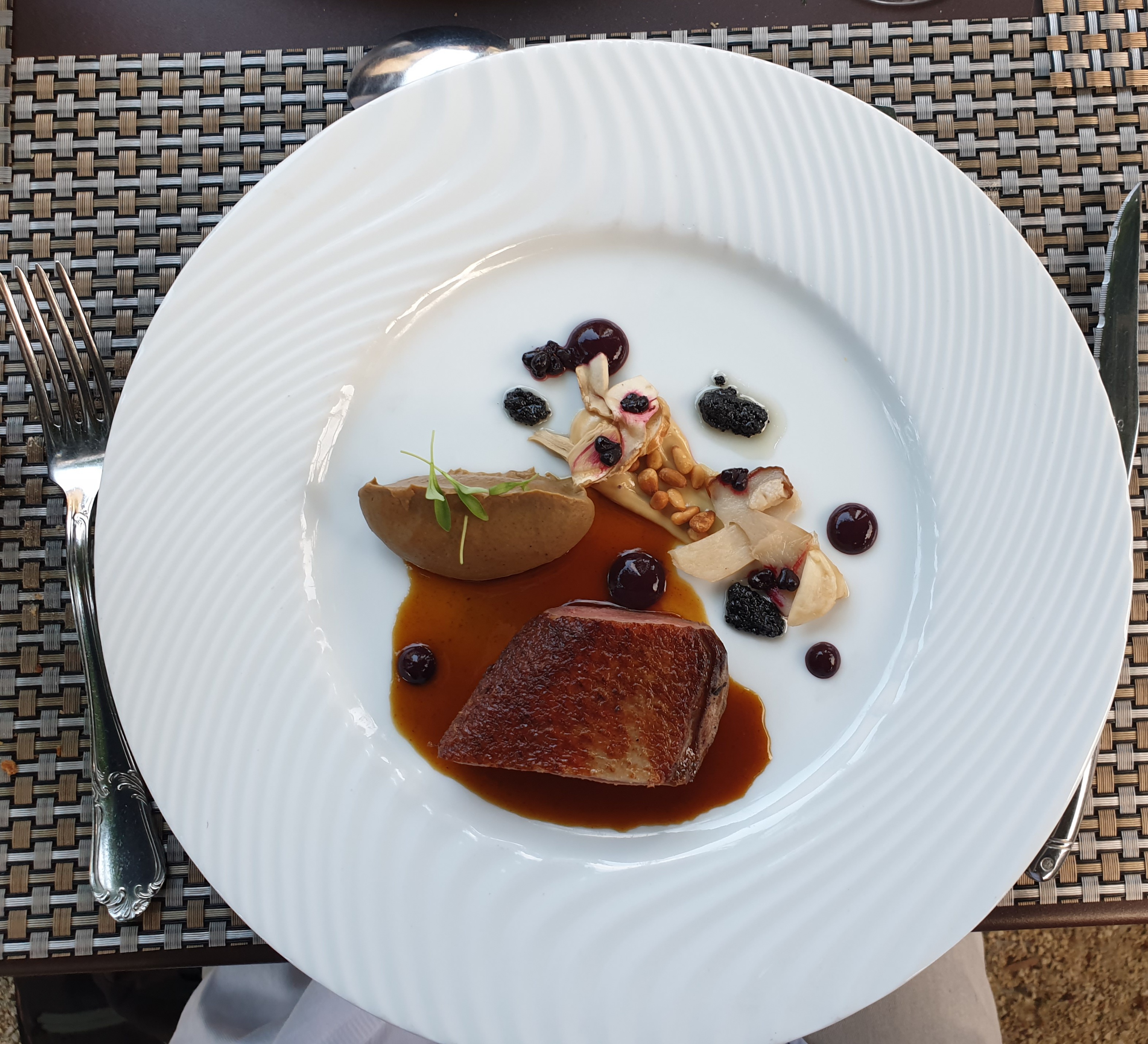 Pour les personnes qui préfèrent la qualité à la quantité très fin et gustatifs terrasse très agréable et reposante sous les arbres Service très discret et délicat je conseil aux amoureux le soir