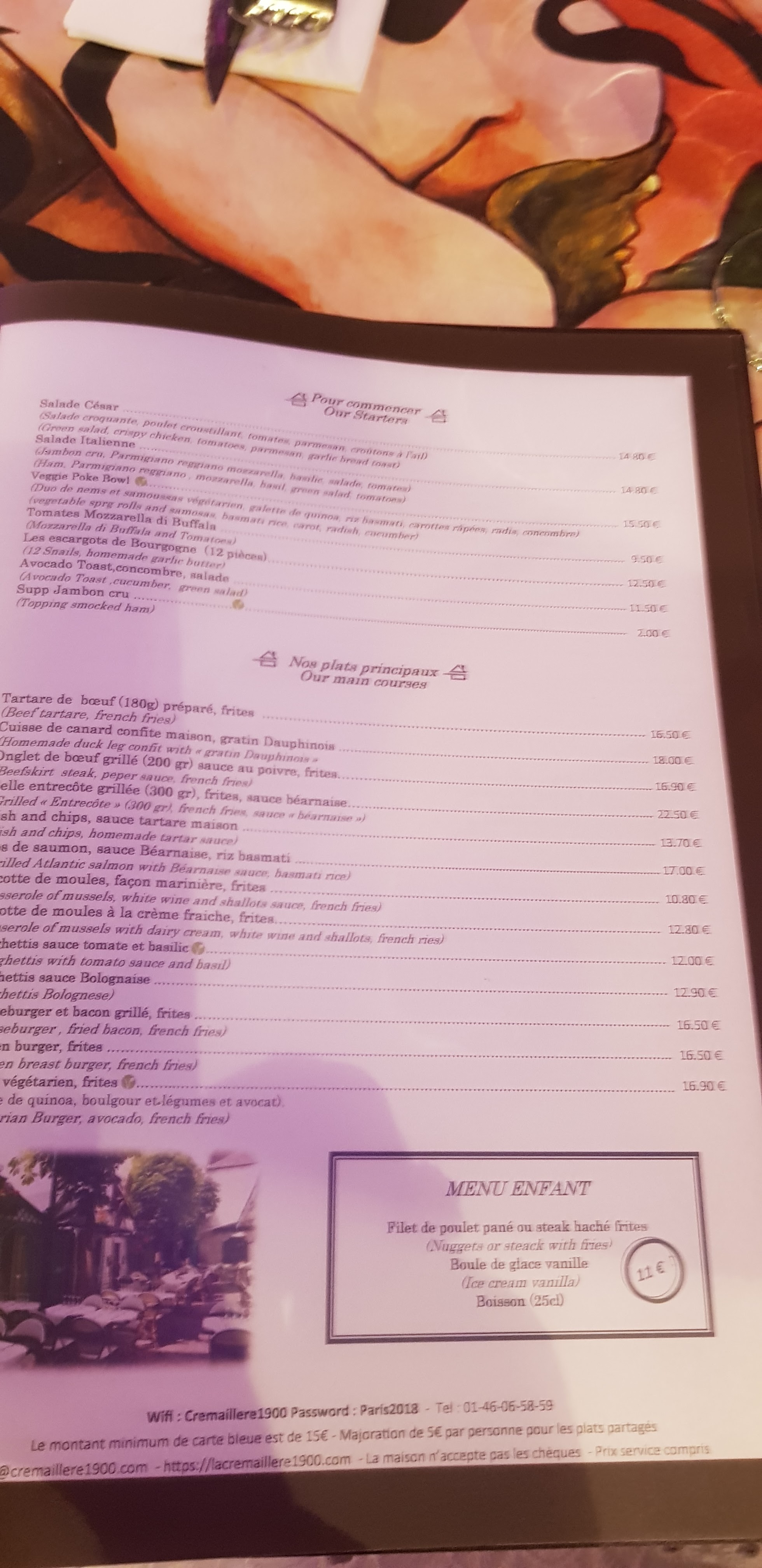 Je m'attendais à un menu à un prix exorbitant car cet endroit est niché dans les jardins de Versailles mais nous avons été ravis de constater que ce n'était pas du tout le cas. Ce n'est pas un endroit bon marché mais ce n'est pas une arnaque. Le personnel parlait anglais, ce qui était très utile. Cela vaut la peine de s'arrêter si vous avez besoin de nourriture dans les jardins et des plats à emporter sont disponibles.