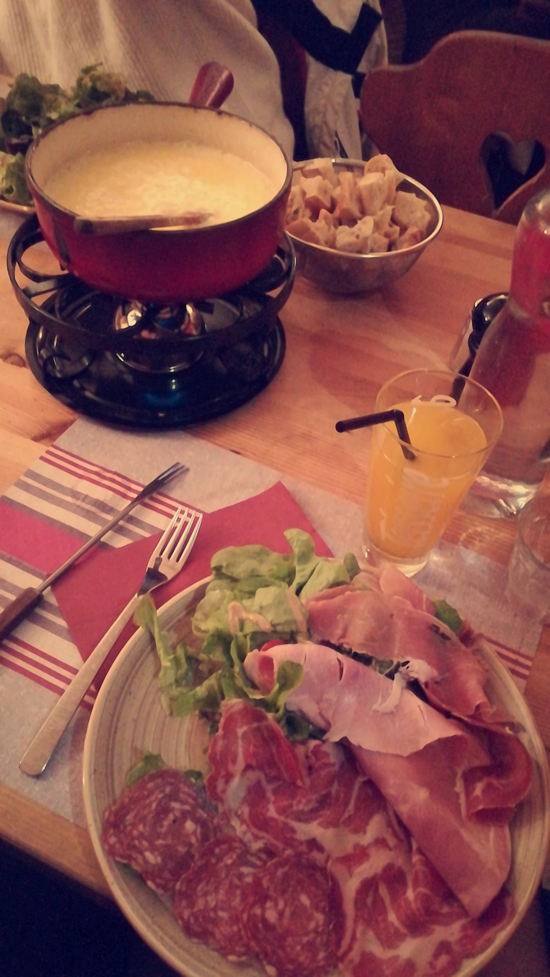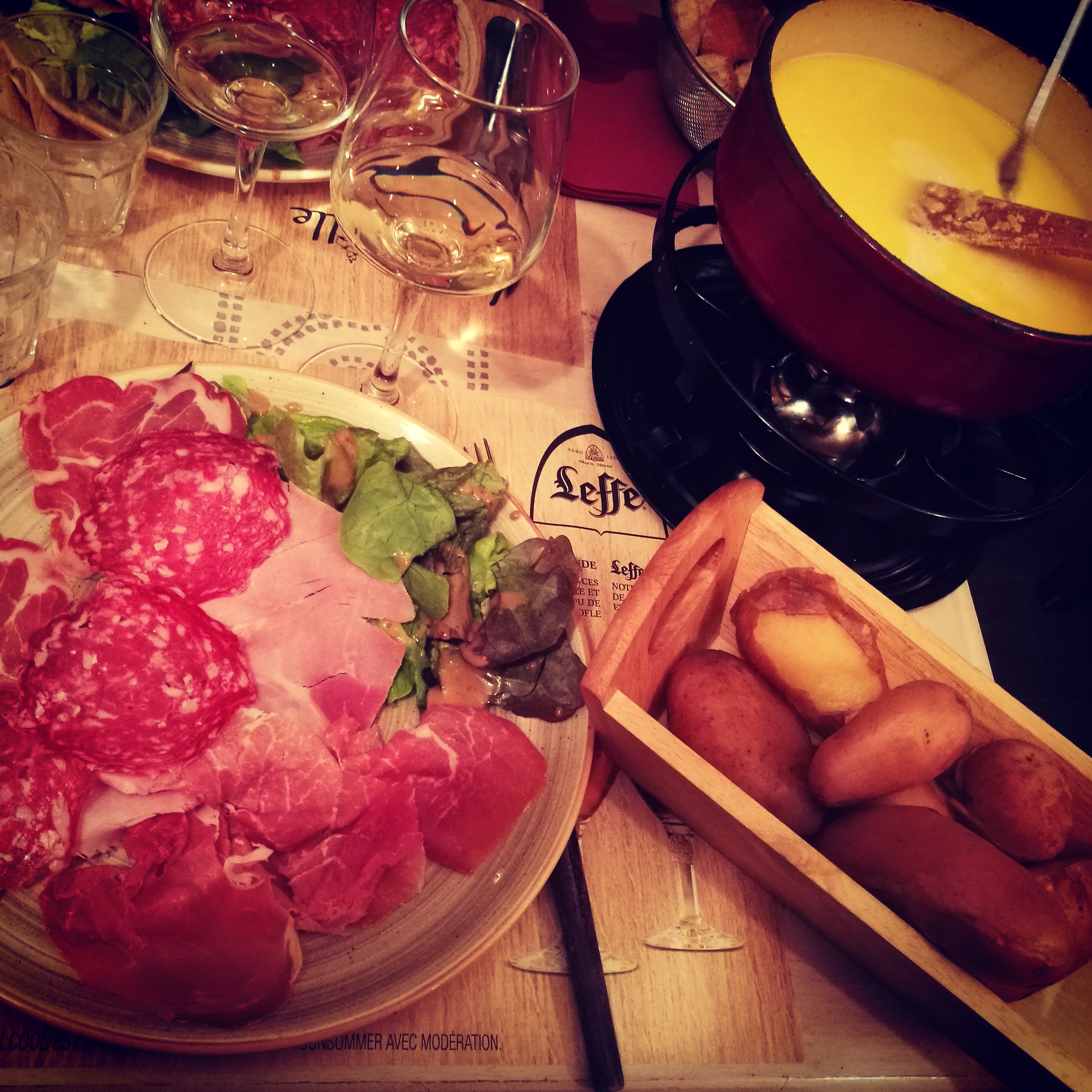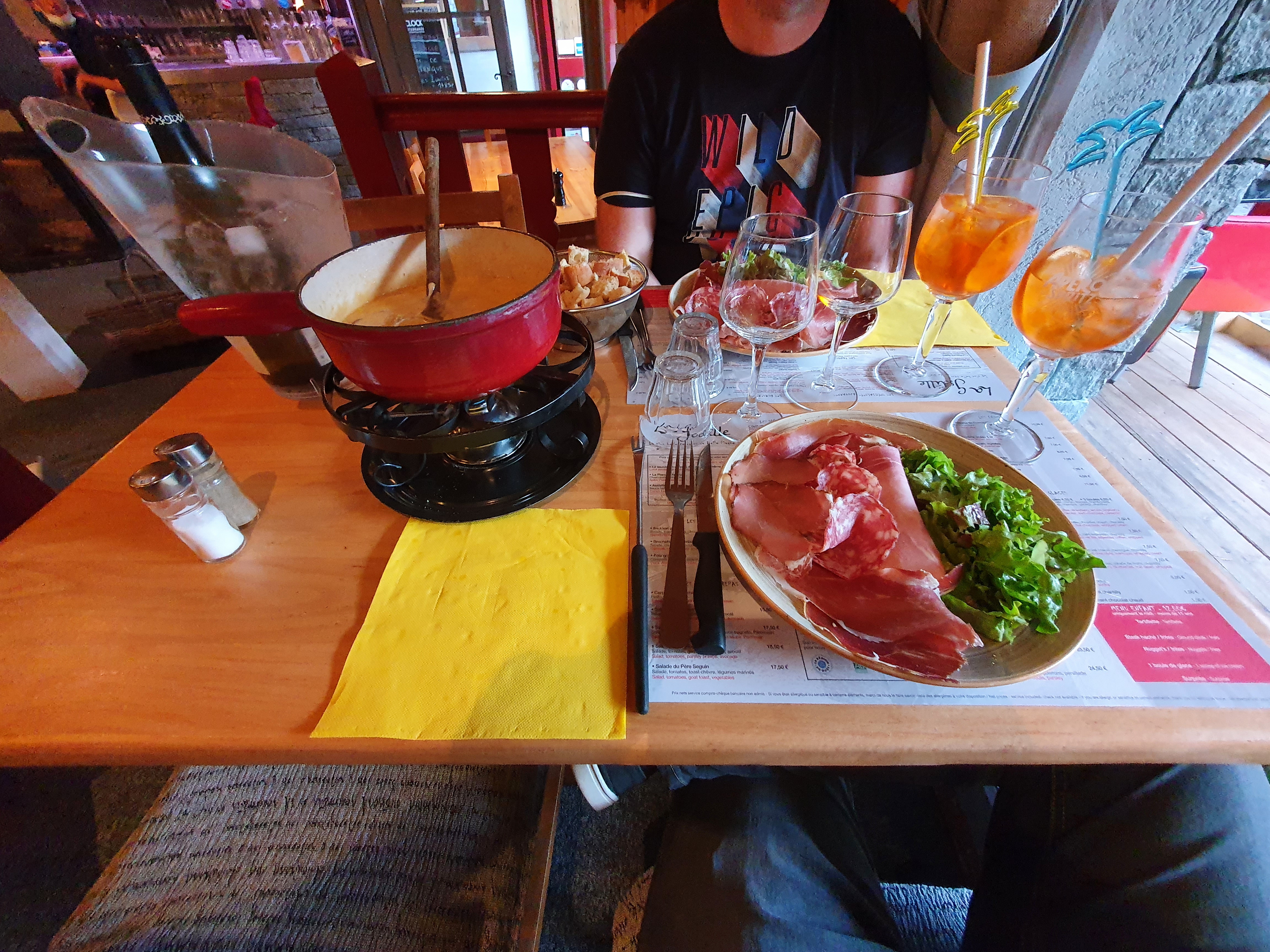 Fondue médiocre : pas de goût de vin blanc, goût très marqué d’emmental, quantité limite pour 3 personnes et pain presque raci… Et c’est encore plus gênant quand on paie ce prix-là. Plus de verre à vin donc on boit dans des flûtes de champagne. Bol de salade qui laisse à désirer. Bref, je ne recommande pas.