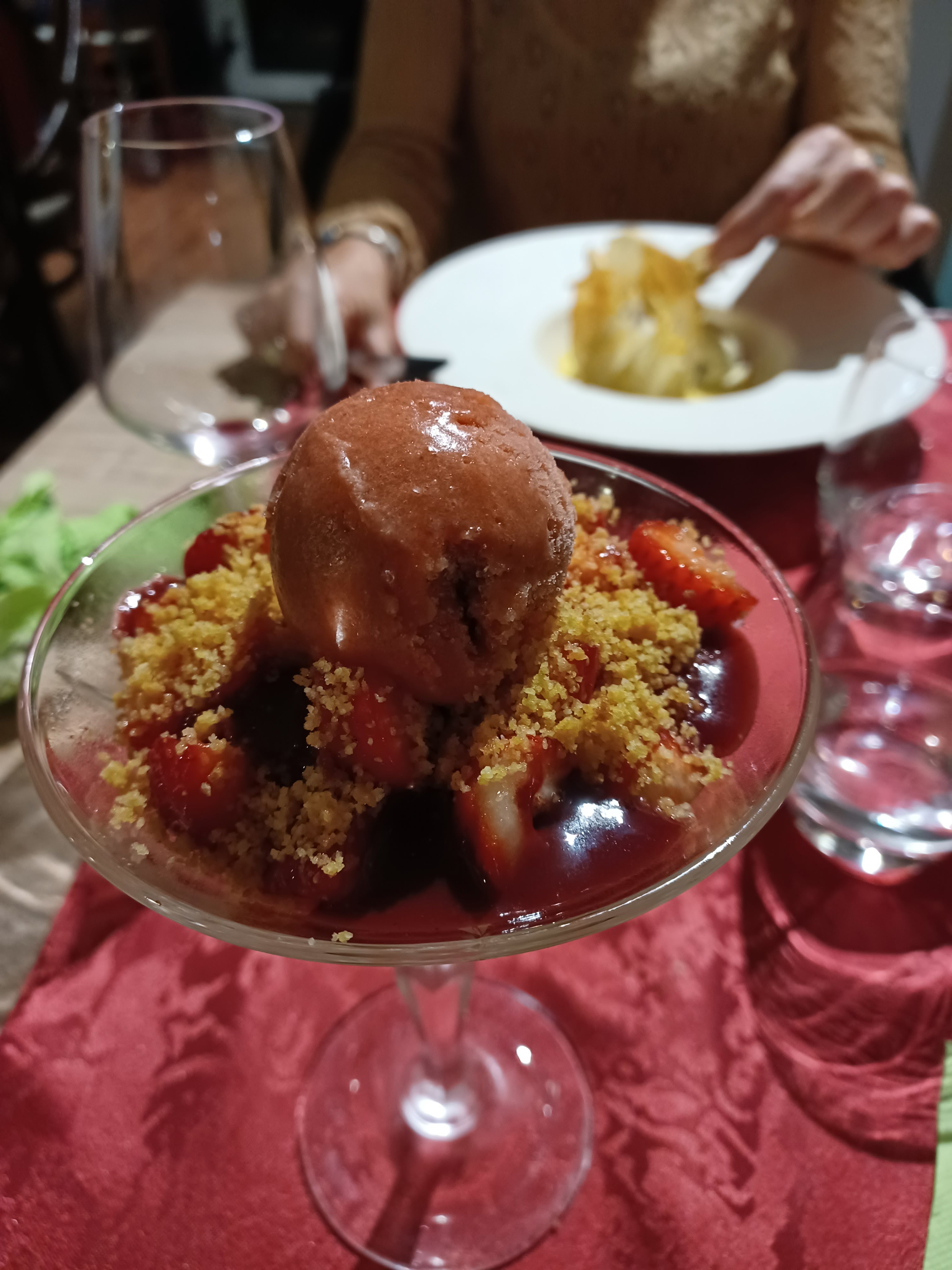 Un bon repas partagé en famille. Des plats goûteux et copieux..du vin du Tarn🤩 et de Très bons desserts... En photo la crème brûlée aux fraises et basilic 💓 Et alors le croustillant de tobleron accompagné d un sorbet de mandarine 💓💓💓💓 L équipe y est sympathique, les prix restent convenables. Une expérience à renouveler.