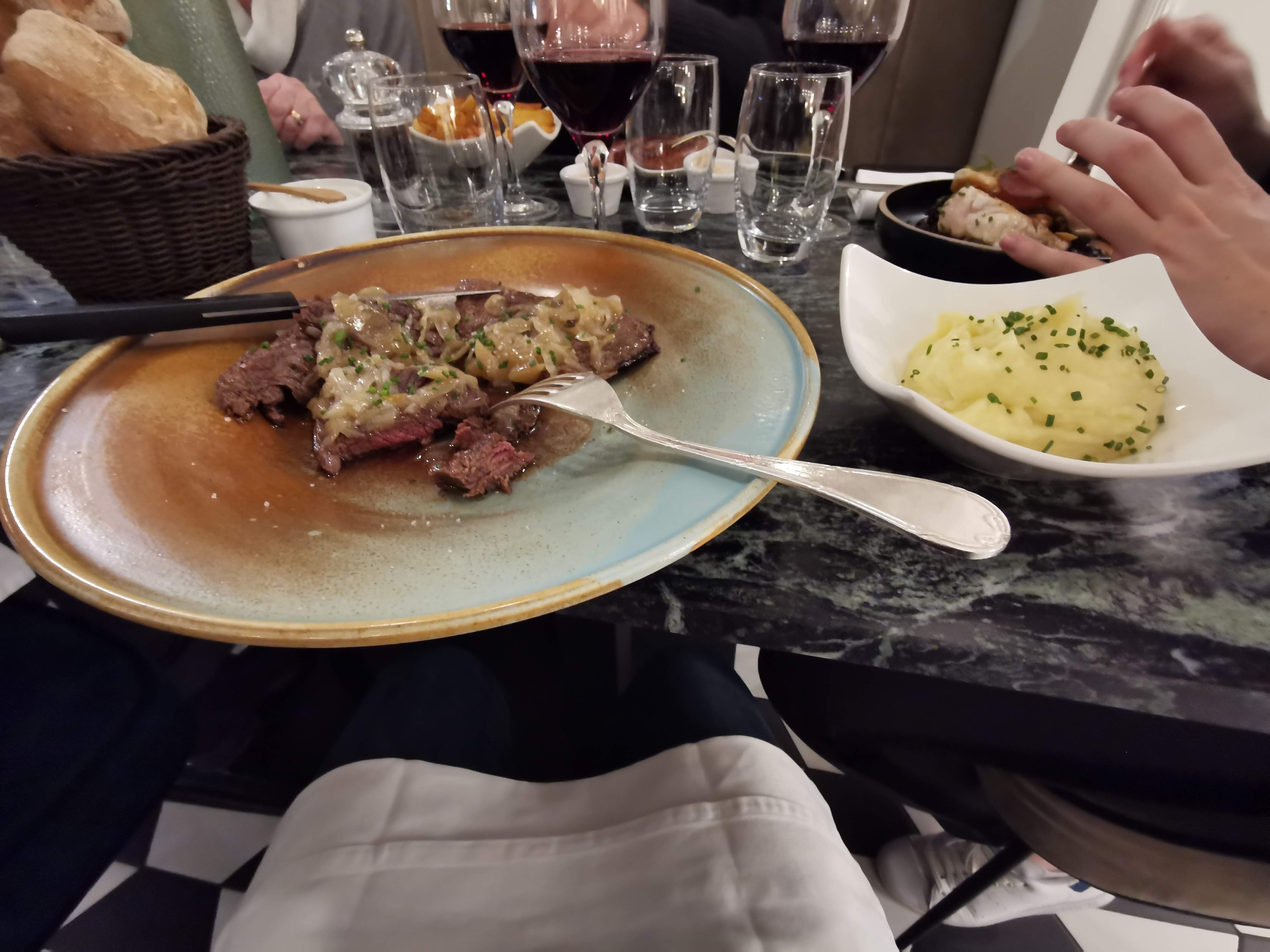 Je n’avais pas vu avant d’entrer dans la salle (sous-sol) que c’était un restaurant chic. Superbe décor design. Nous arrivions de la gare et voulions manger rapidement. Plats du jour excellent : tournedos de canard et sa purée.