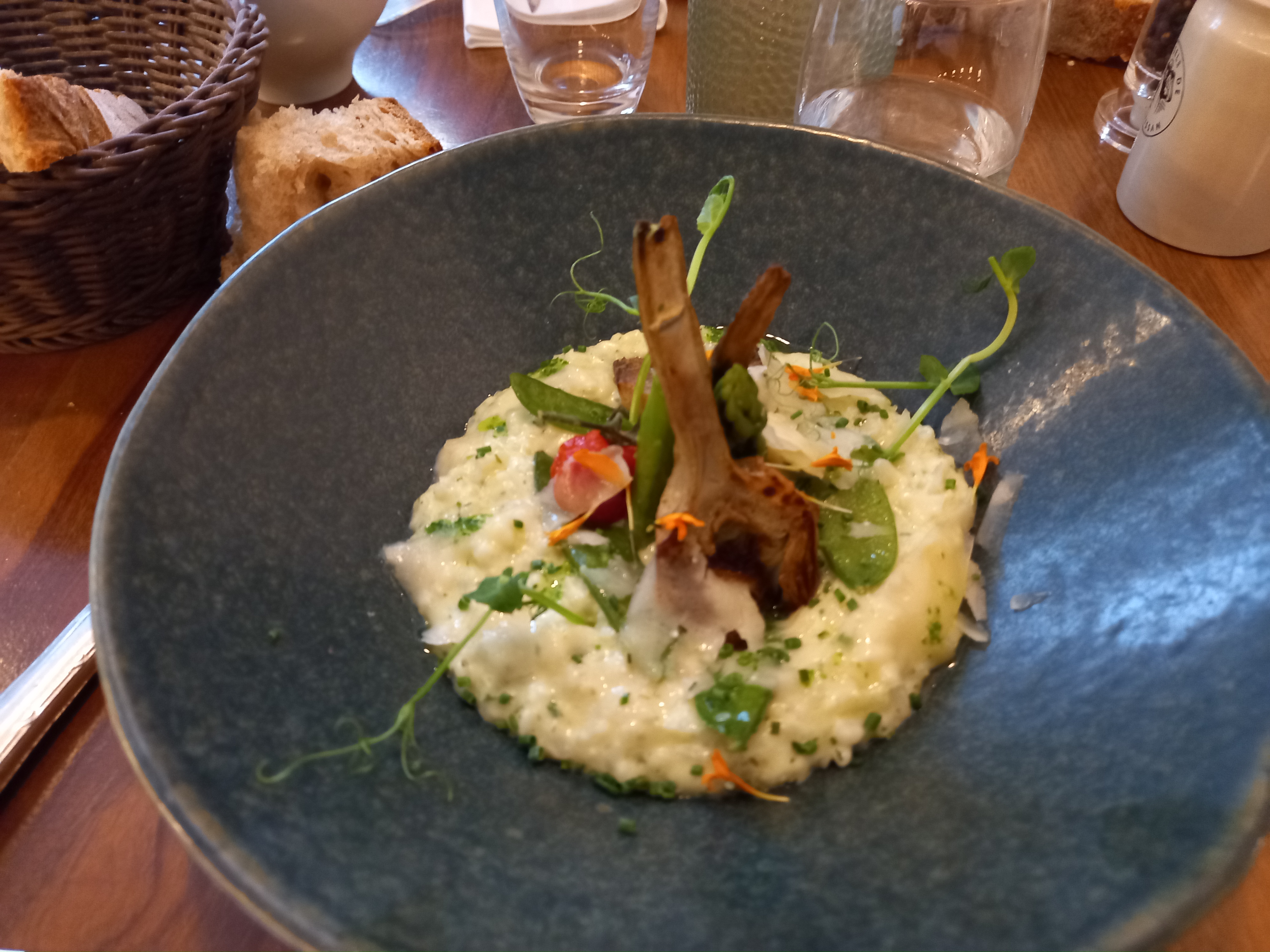 L'entrée foie gras à la pêche fut un véritable délice . Le risotto aux légumes était juste parfait (une symphonie en bouche). Le dessert 🍨était magnifique visuellement mais malheureusement je n'ai pas beaucoup apprécié car trop de menthe à mon coup. Coup du repas avec deux boissons 93 euros mais le cadre est splendide pour une soirée en amoureux.