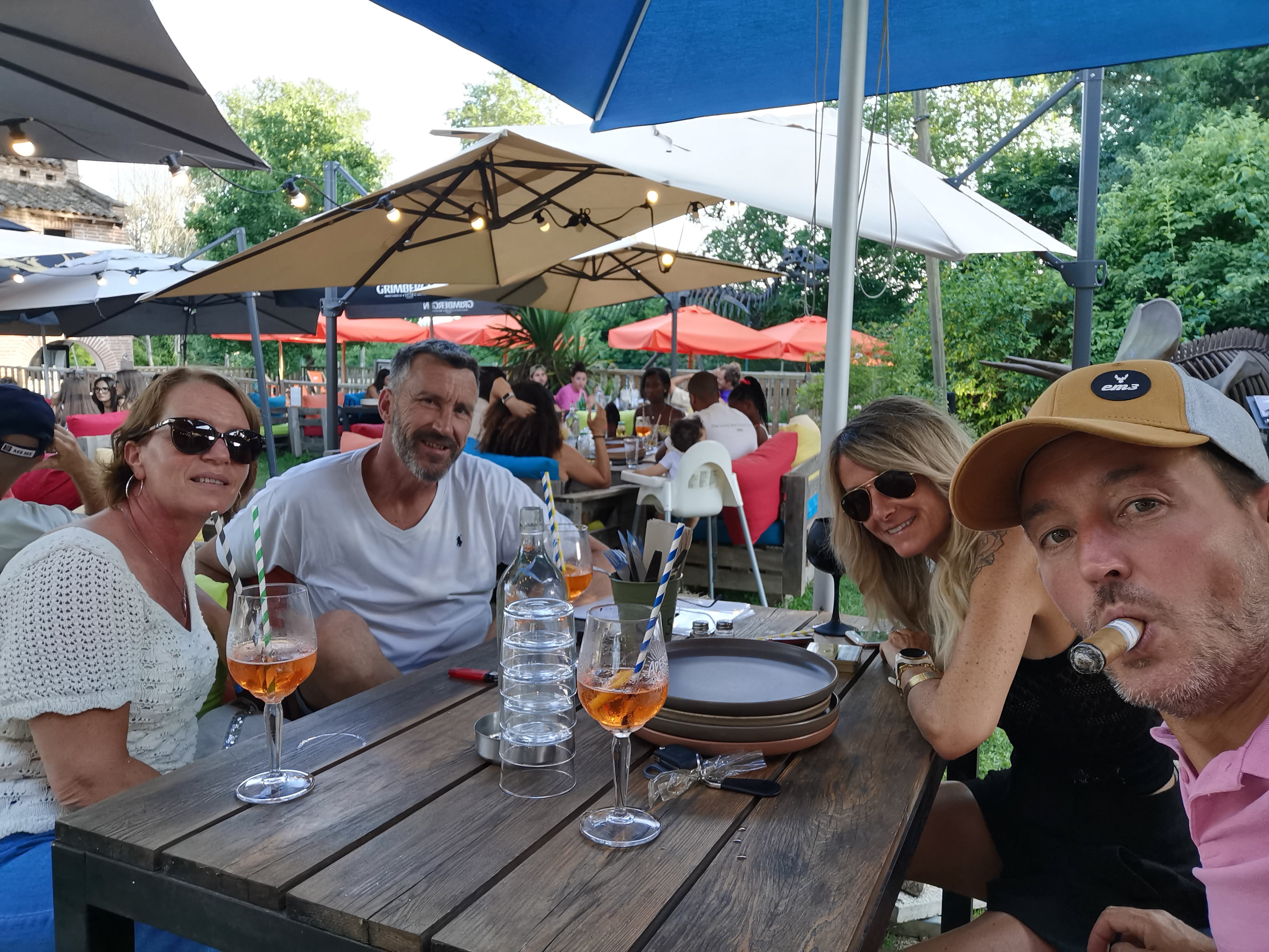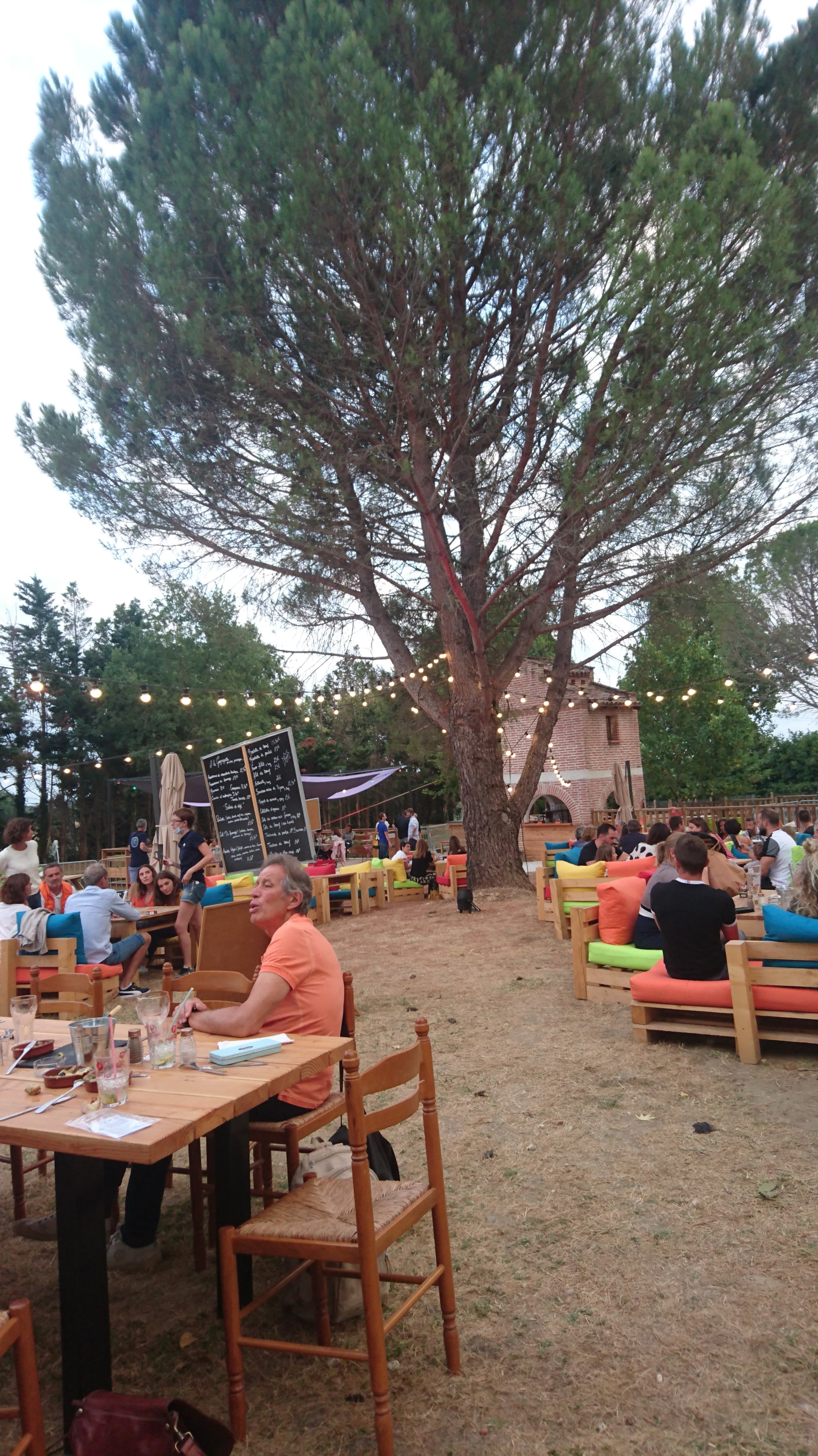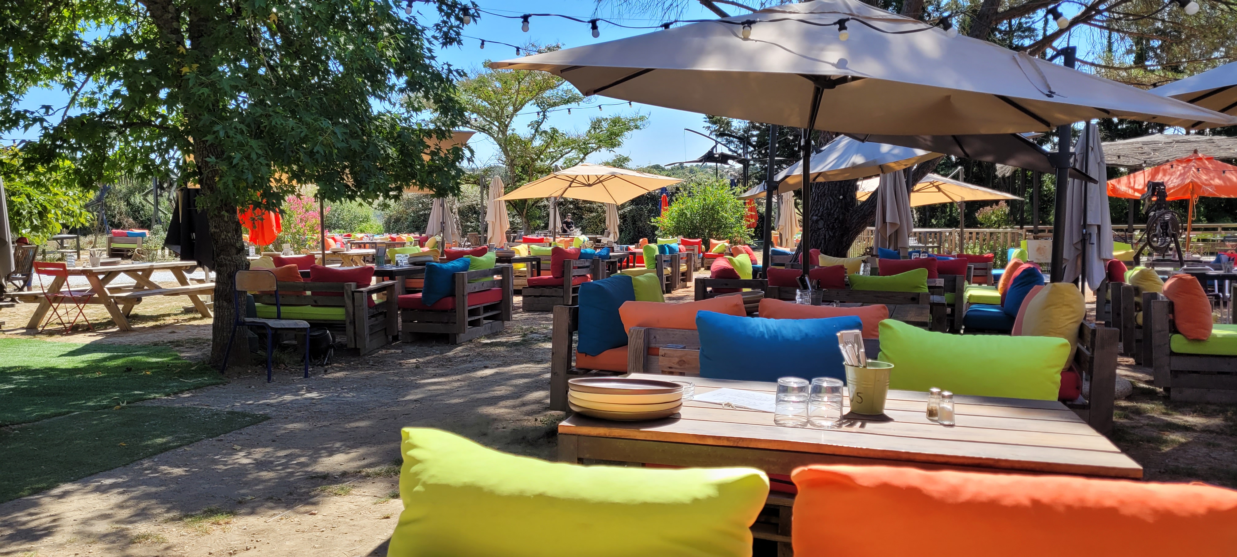 Endroit convivial et accueillant.Des espaces ombragés, banquettes style palette confortables, un bar à cocktails (avec de bons conseils). Pour se restaurer :au choix food truck (hot dog ou burger, prix allant de 10 à 15 euros) ou tapas et autres plats(saucisse, côté de porc noir, entrecôtes... Salades de 13 à 26 euros) et cabane à desserts. Un excellent concept . Testé un dimanche midi en famille, occasion pour les enfants de profiter du spectacle de cirque sous le petit chapiteau prévu à cet effet ( spectacle en juillet et août seulement cette année). On apprecie aussi l esprit local: viande du boucher de gragnague... Piscine sur place mais non ouverte cette année pour cause de la réglementation sanitaire. Petite basse cour avec dindons, oies pour la joie des plus petits.