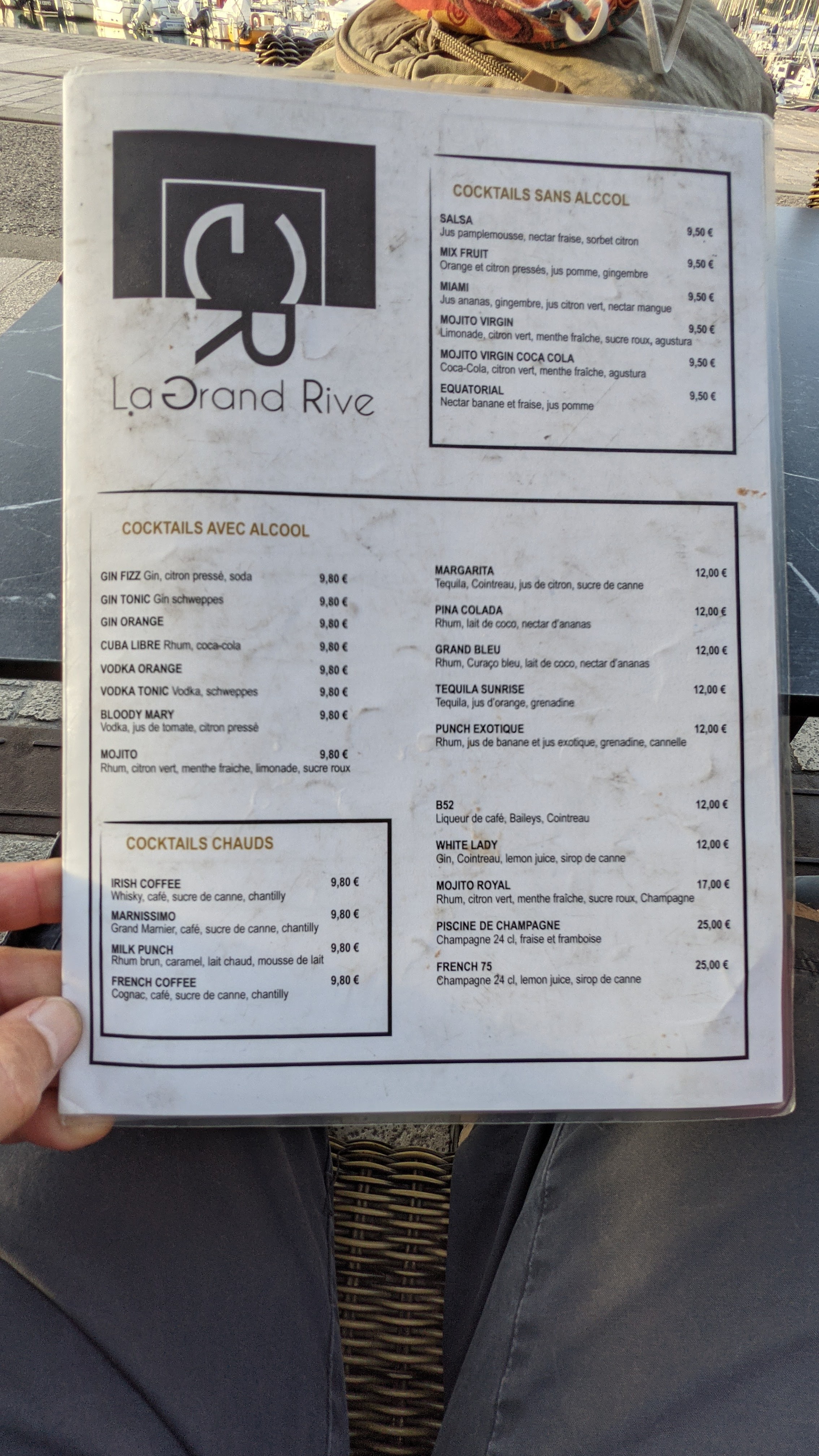 Les amis, cet après midi, temps pluvieux, je m’installe et demande un schweppes tonic, c’est vrai sans demander le prix mais j’ai l’habitude de demander cette boisson sur la côte = moins de 4 € en général, mais on m’annonce 12 balles, 5 mn après m’avoir servi et bu une bonne gorgée (?? je n’en ai pris qu’un, pas 3 !!) même à Monaco c’est moins cher 😳😂 Bravo franchement ils sont très bons les gars, mais jamais je n’y remettrai jamais les pieds !! A prendre les clients pour ce qu’ils ne sont pas, ça ne durera pas longtemps…
