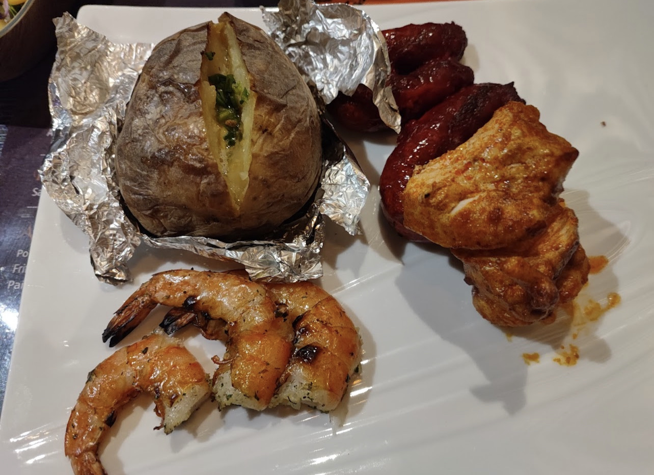 Restaurant de grillade à volonté : filet de poulet, pillon de poulet, crevettes, saumon, rumsteck, pain à l'ail et ananas caramélisé. Salade, pomme de terre au four, frites, mojito, tout est délicieux. Le service est chaleureux, les portions sont généreuses. Je suis une cliente régulière. 5 étoiles méritées.