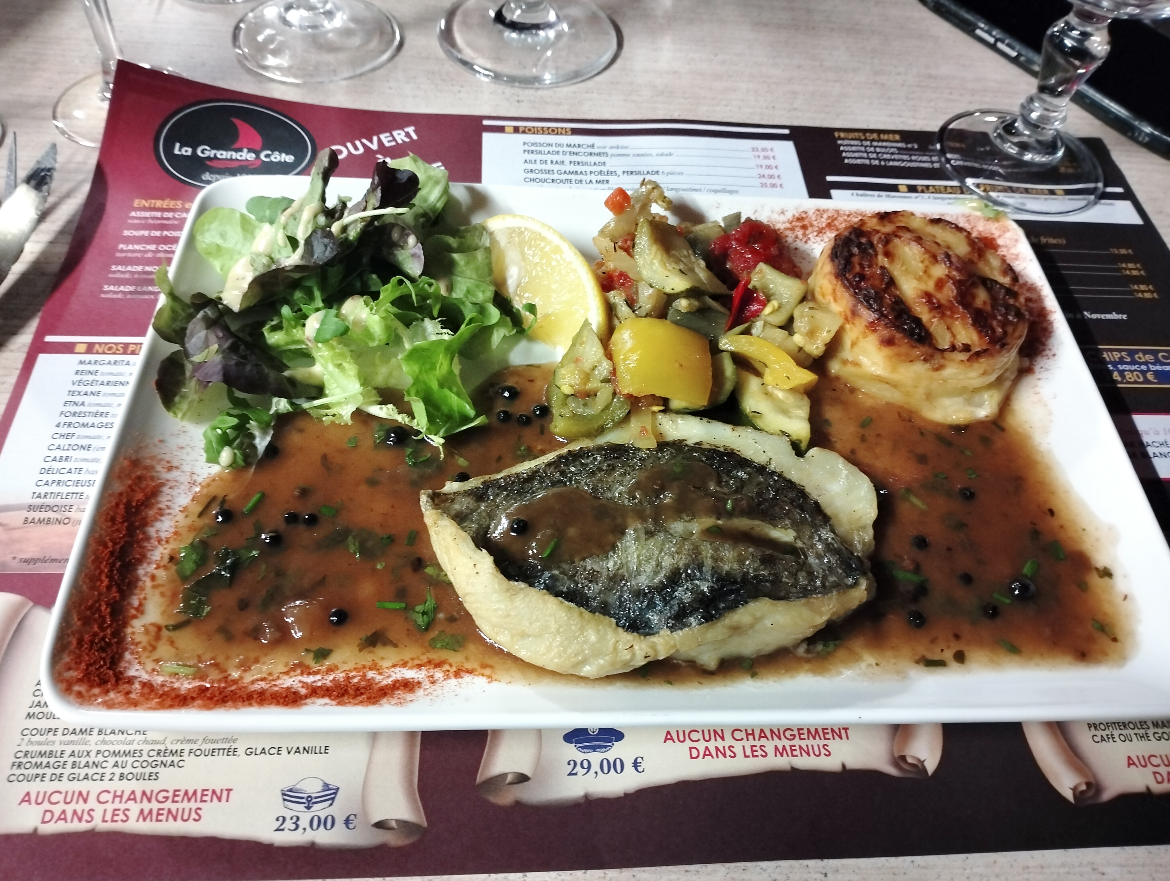 Menu avec choucroute de la mer assez léger qui permet de manger le dessert sans problème. Bon rapport qualité prix. Très belle vue sur mer malgré le froid de ce mois de juillet qui ne nous a pas permis de manger en terrasse...
