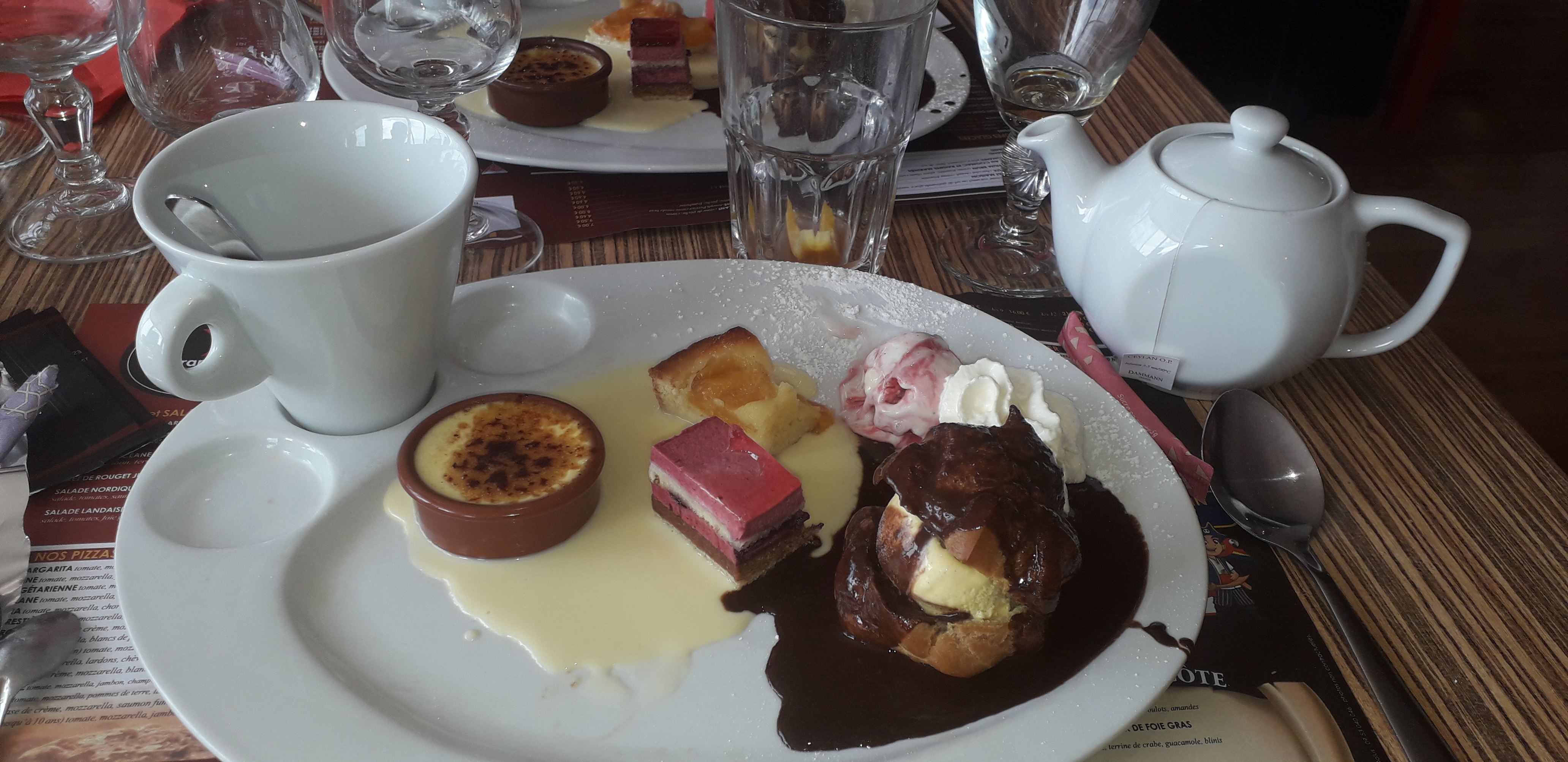 Menu Saint Valentin le nom des plats prête à confusion, l entrée filet de caille fumé pointé d asperge et toast de foie gras,pour moi salade landaise avec un œuf de caille des endives de la salade etc … ensuite gratin de sole sur fondue de poireaux etc .,, mais une crêpe fourrée et le dessert idem aucune recherche de présentation, rien ne justifie le prix, brasserie pour touriste