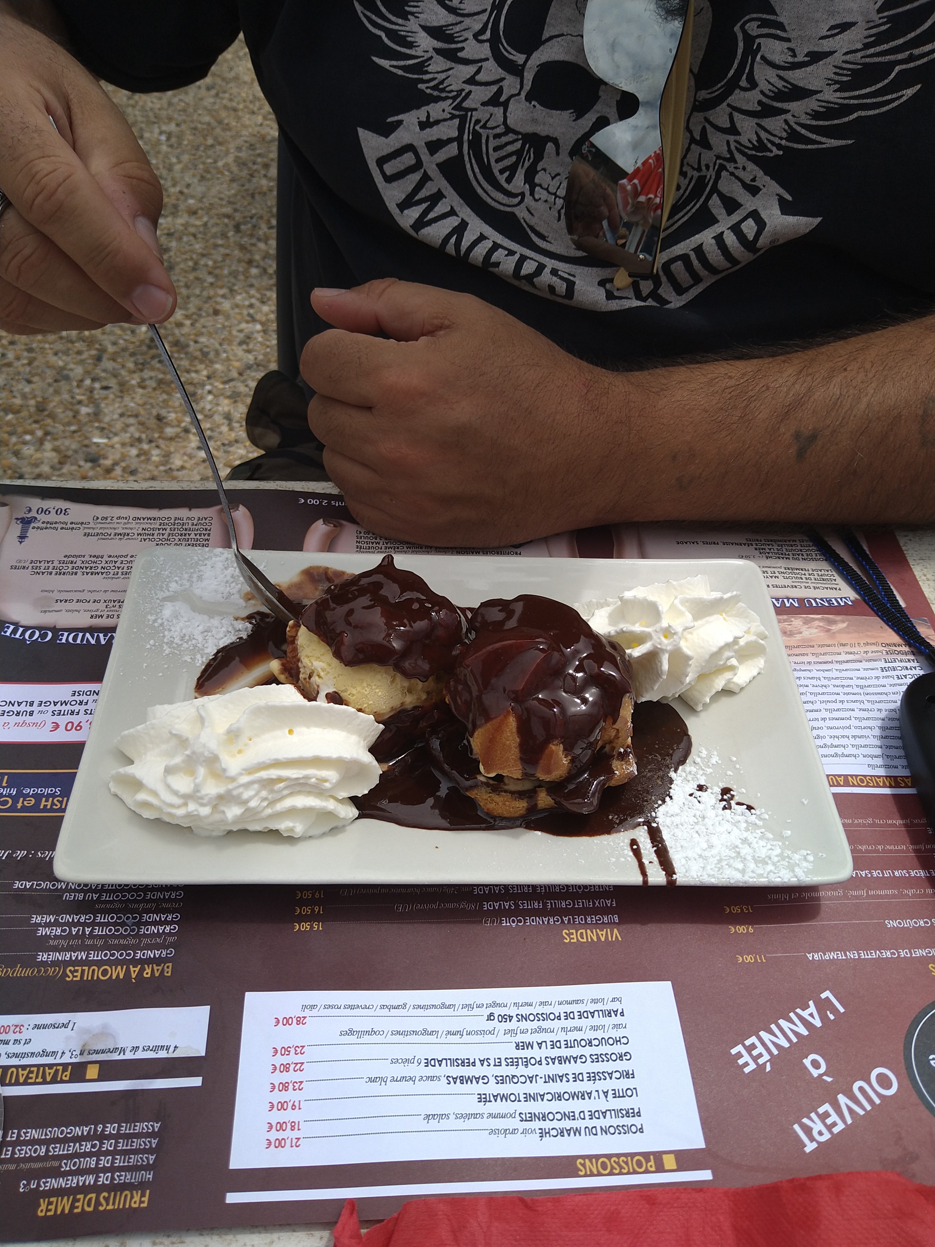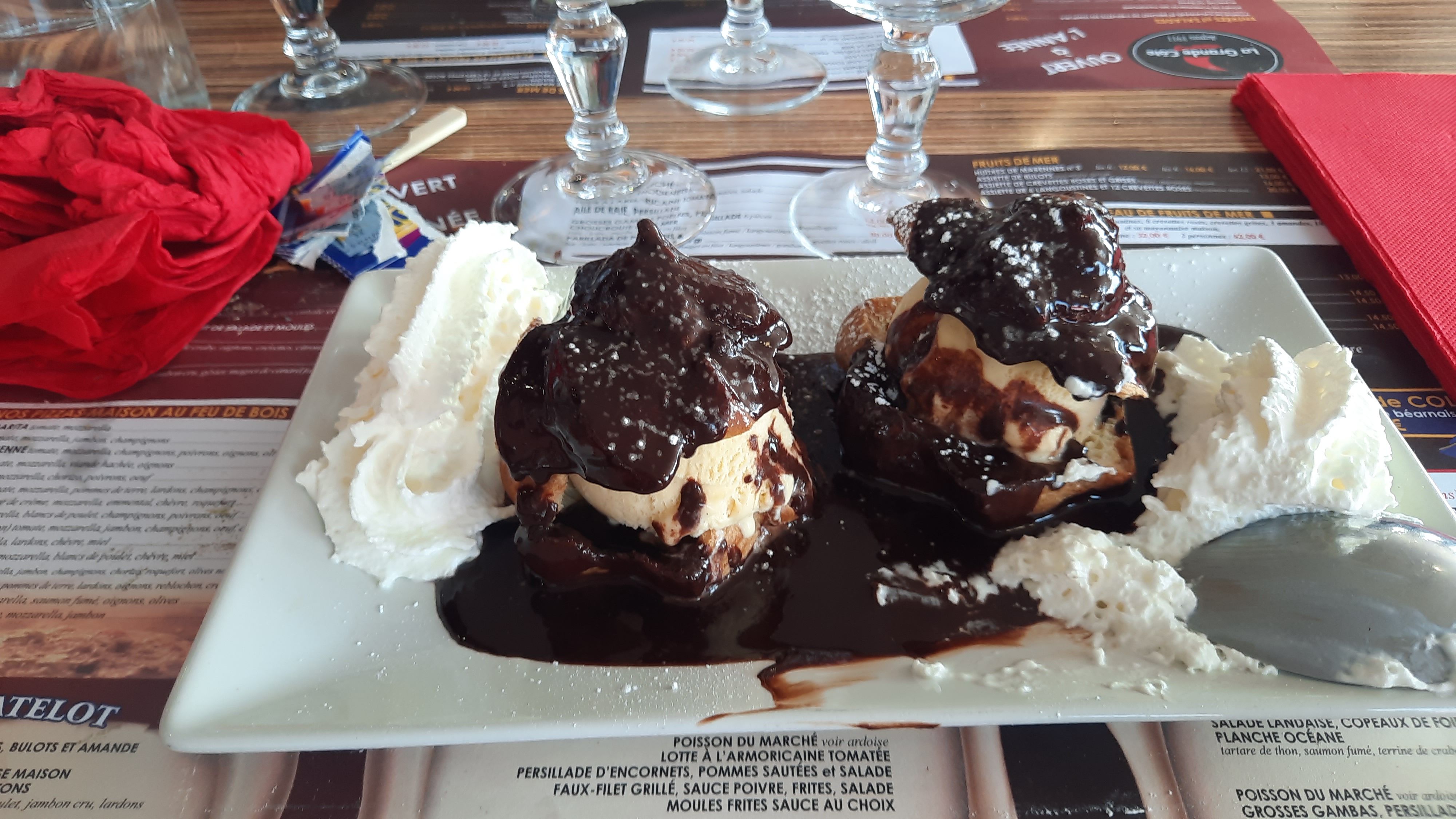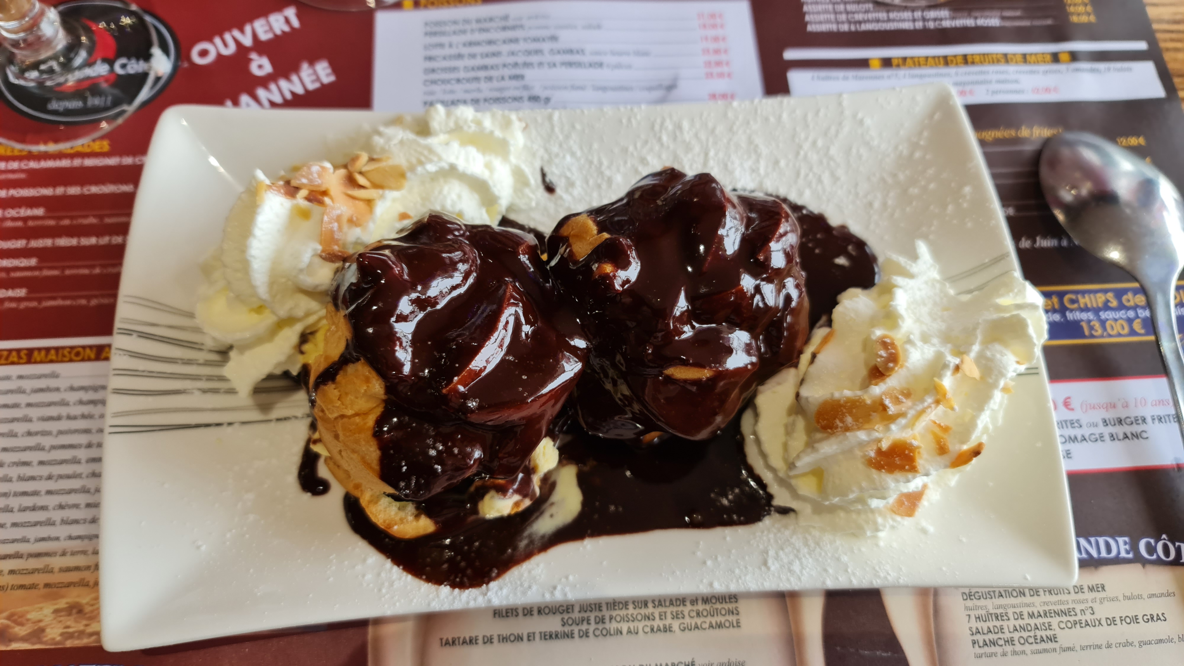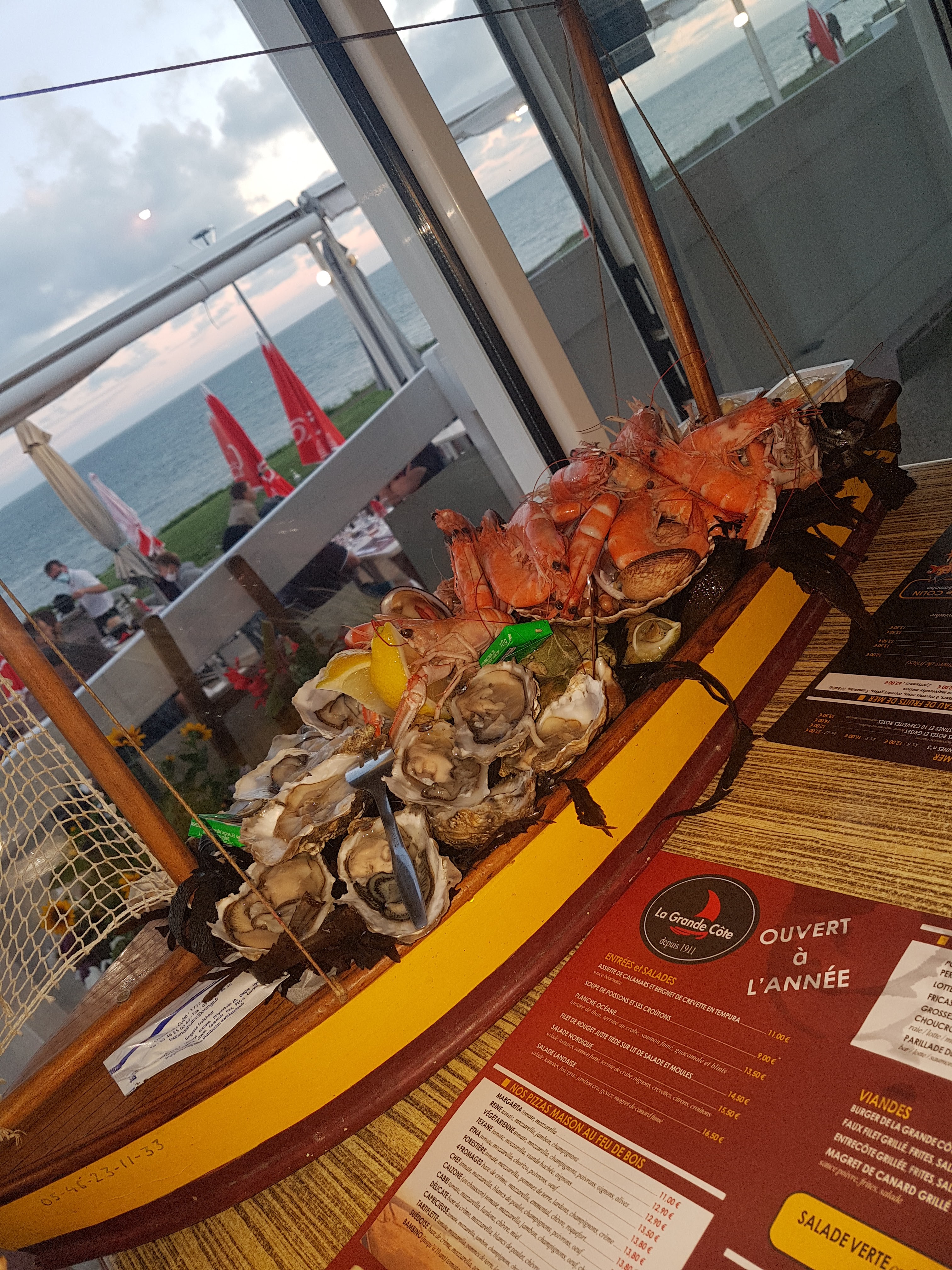 Tres bon restaurant avec une situation idéale face à cette cote sauvage magnifique à la Grande Cote. J y ai pris des huitres extra-fraiches, une blanquette de poisson très bonne mais peut-etre pas assez consistante et des profiterolles avec une sauce chocolat et une crème fouettée maoson que je vous conseille vivement. Personnel très aimable et serviable. Je regrette juste quil y ait pas une formule entree + pkat ou pkat +,dessert. Je recommande.
