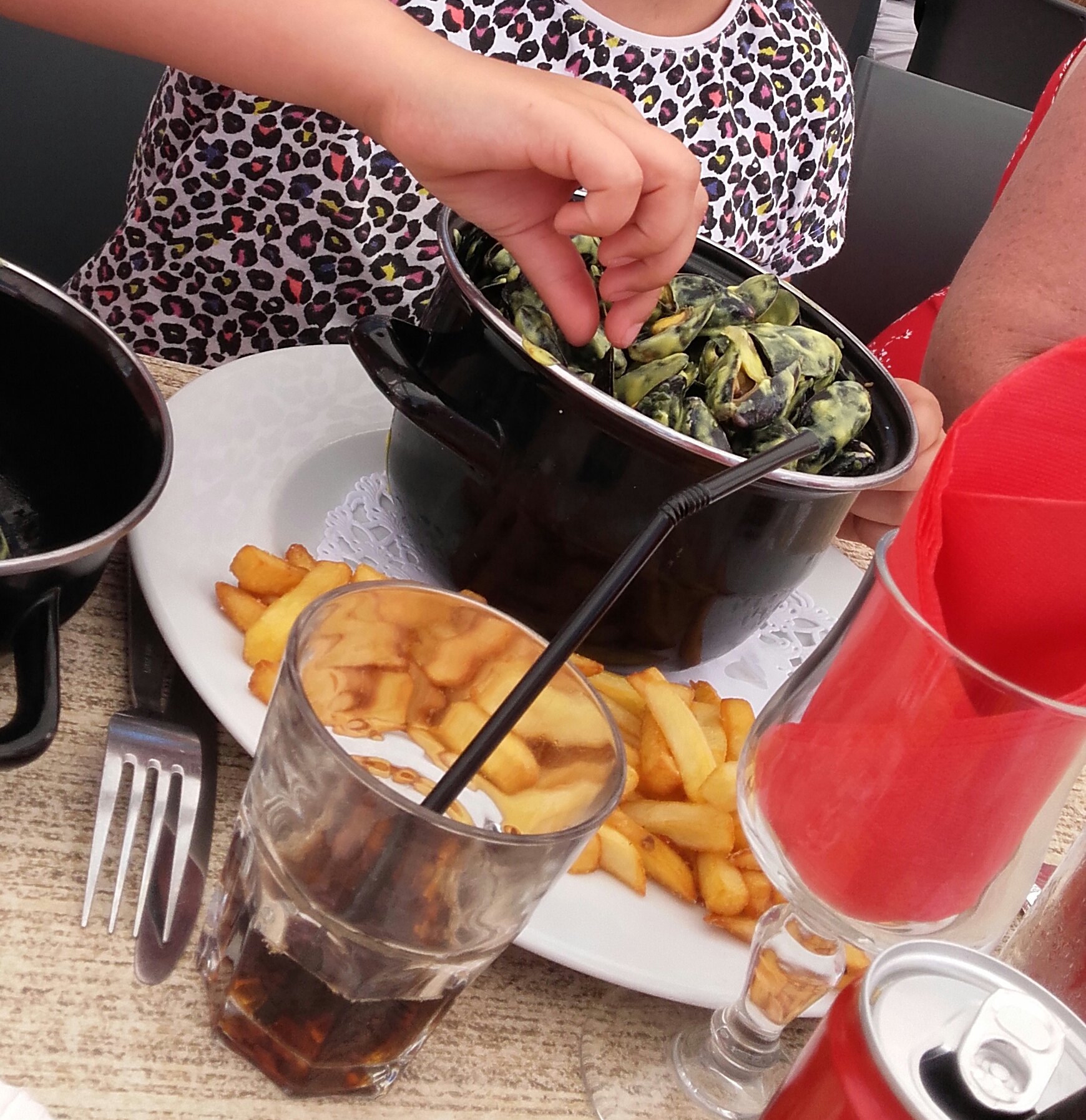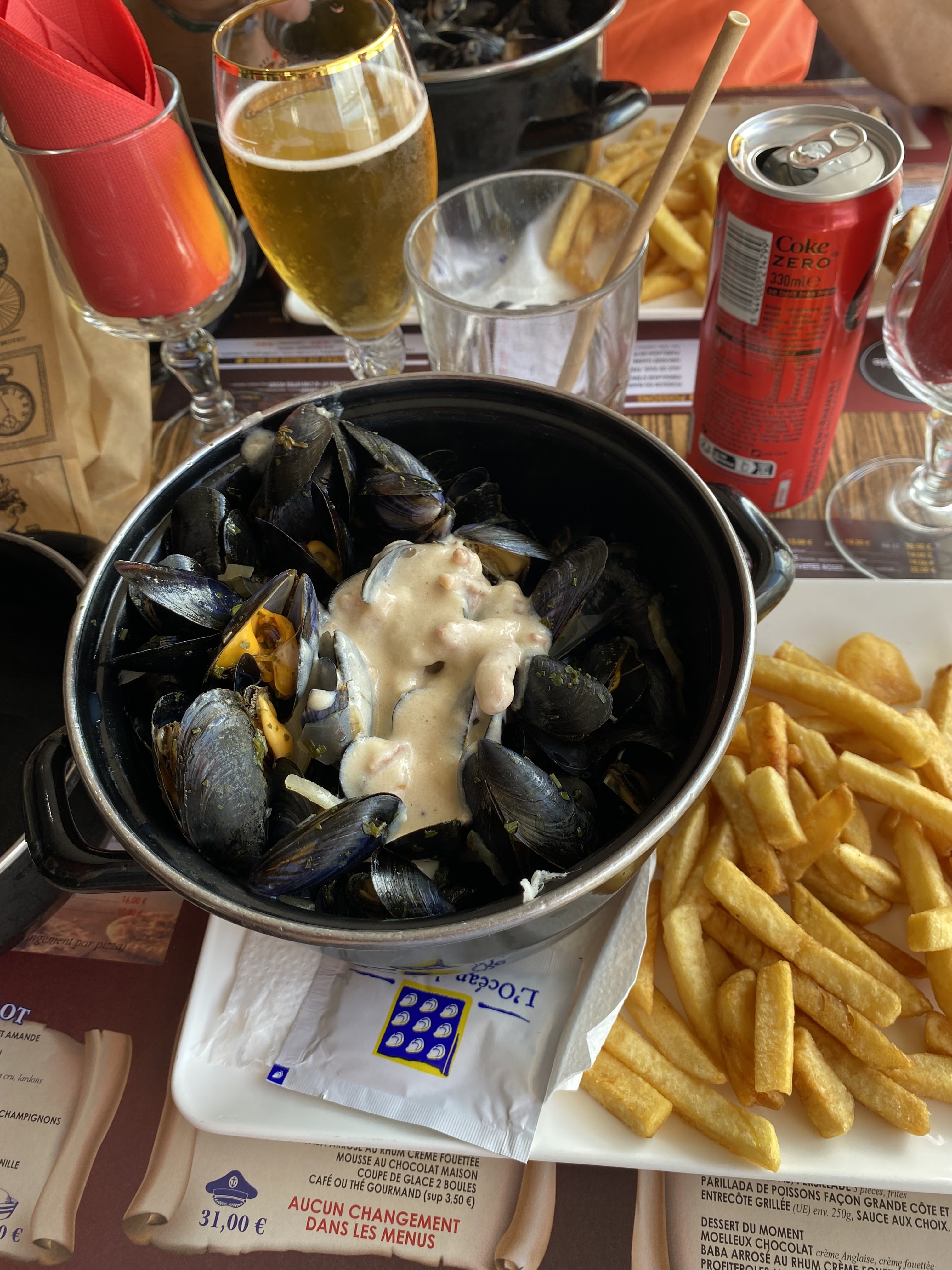 Là déception dès le début Je commande un coca zéro , tout de même 4€50 mais j’aime me faire un petit plaisir au restaurant , et on m’apporte quoi ! Une canette alors que je déteste le coca en canette ! Pour un resto on sattend a un bon coca en bouteille en verre Après je commande moule grand mère donc crème , oignons et lardons Je cherche encore les lardons qui étaient d’ailleurs des allumettes En parlons pas de la crème ! Franchement moules à la crème et à peine 10 cl de crème Donc espérez pas tremper vos frites dans la creme en fin de marmite car il y a que du jus Les moules étaient petites et beaucoup étaient fermés Dommage pour le seul restaurant de nos vacances où on veut se faire plaisir