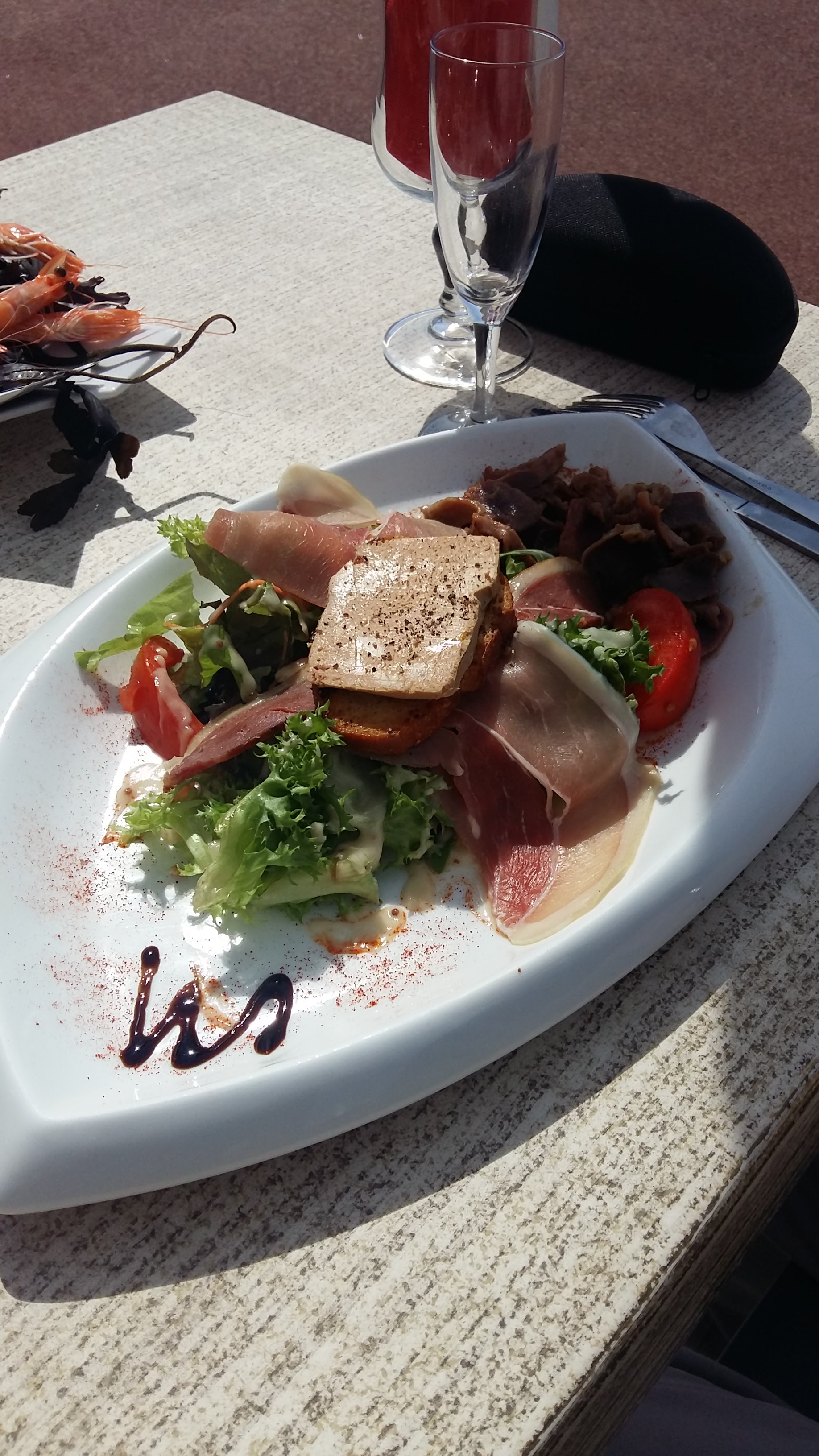 Une salade landaise avec un carré de foie gras sur un taost destiné à la soupe de poisson puisque archi grillé et bien ailé, un oignon rouge entier coupé grossièrement bref, salade plutôt fraîche, beaucoup de jambon, 2 morceaux de magret fumé enfin bref une vraie déception. Par contre vous pouvez demander aux serveuses et serveurs si les bières sont bonnes, puisque Ils sont collés au bar à faire une dégustation... profiteroles plutôt bon. Perrier en canette 4,50€, un demi 5,30€, mieux vaut picoler du coup. En gros, fuire ce restaurant