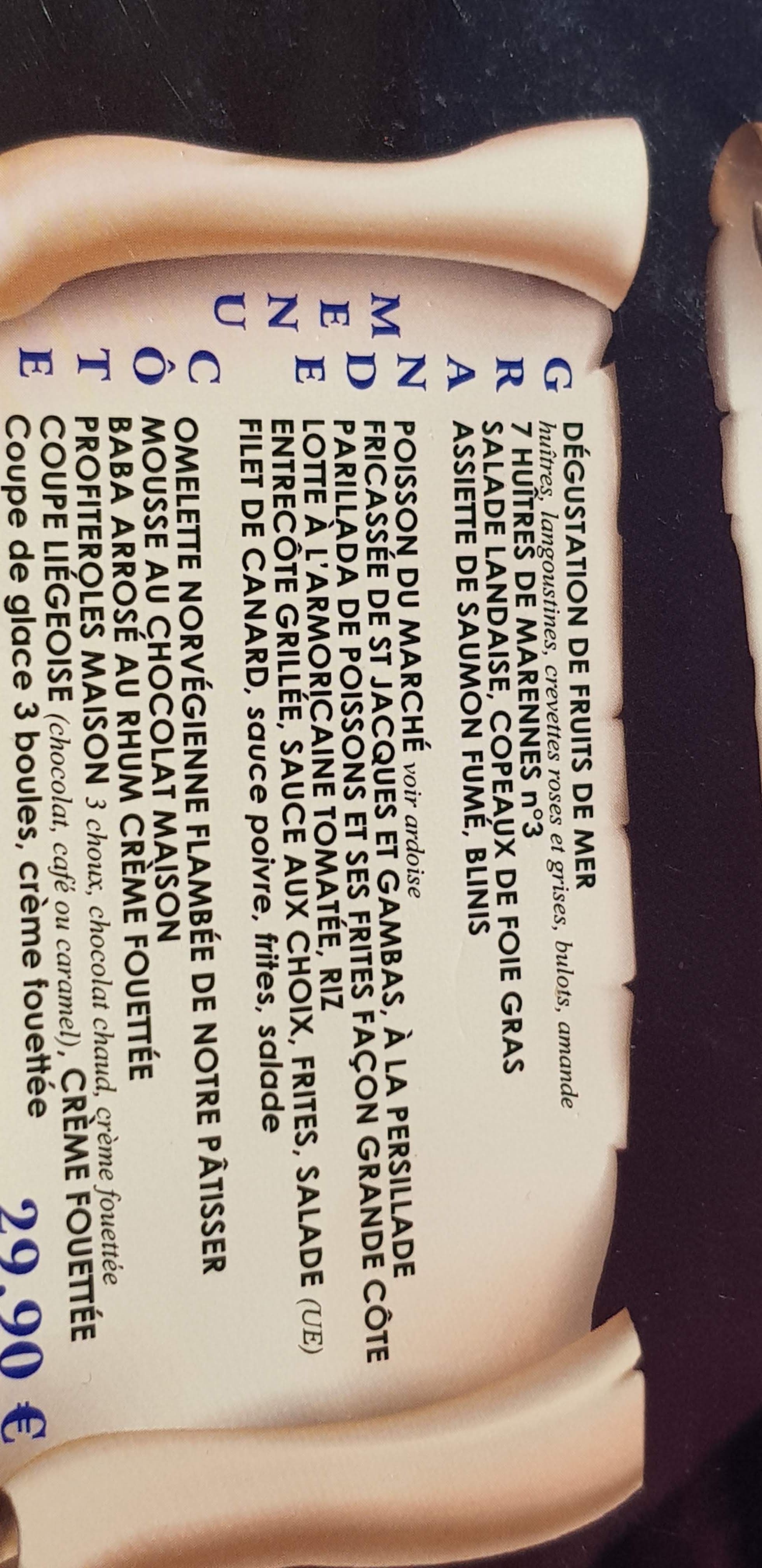 Nous avions réservé pour le dîner du 31 décembre 2022. Le menu était très appréciable. Bien copieux avec un bon rapport qualité prix. Nous avions également réservé une table pour le déjeuner du 01 janvier. Les propositions de plats ont répondu à nos attentes (plateau de fruits de mer et produits de la mer). Le tout dans une ambiance conviviale. Nous avons passé un excellent week-end.