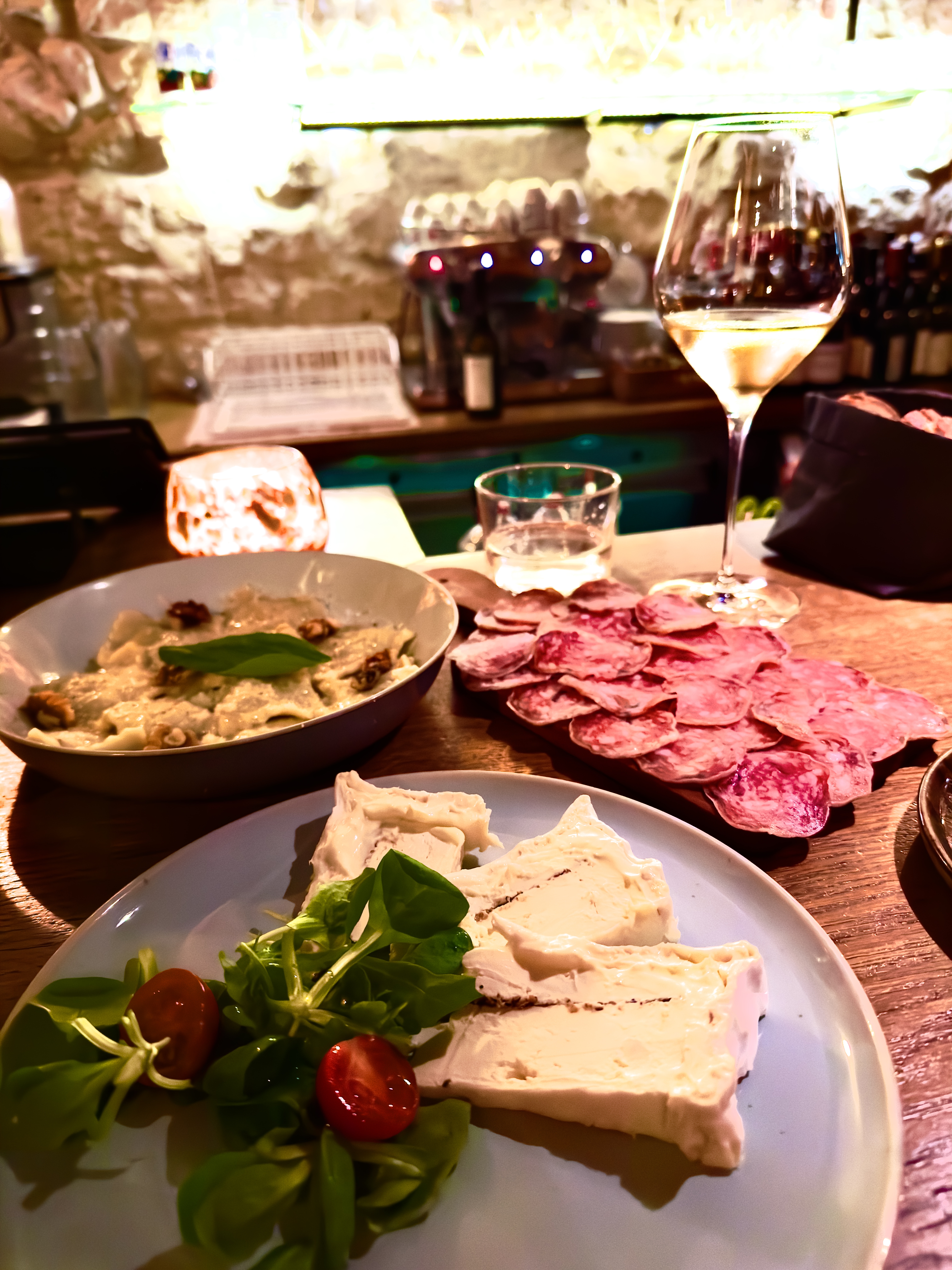 Ce restaurant de charme niché parmi des vieilles pierres offre une ambiance chaleureuse et intimiste. Les tables en bois brut ajoutent une touche rustique à l'atmosphère. Les vins fins accompagnent à merveille les plats à partager superbement exécutés, tels que les raviolis frais, le tartare de bœuf et la burrata exquise. Le patron, attentif aux moindres détails, et le personnel sympathique contribuent à une expérience culinaire mémorable.