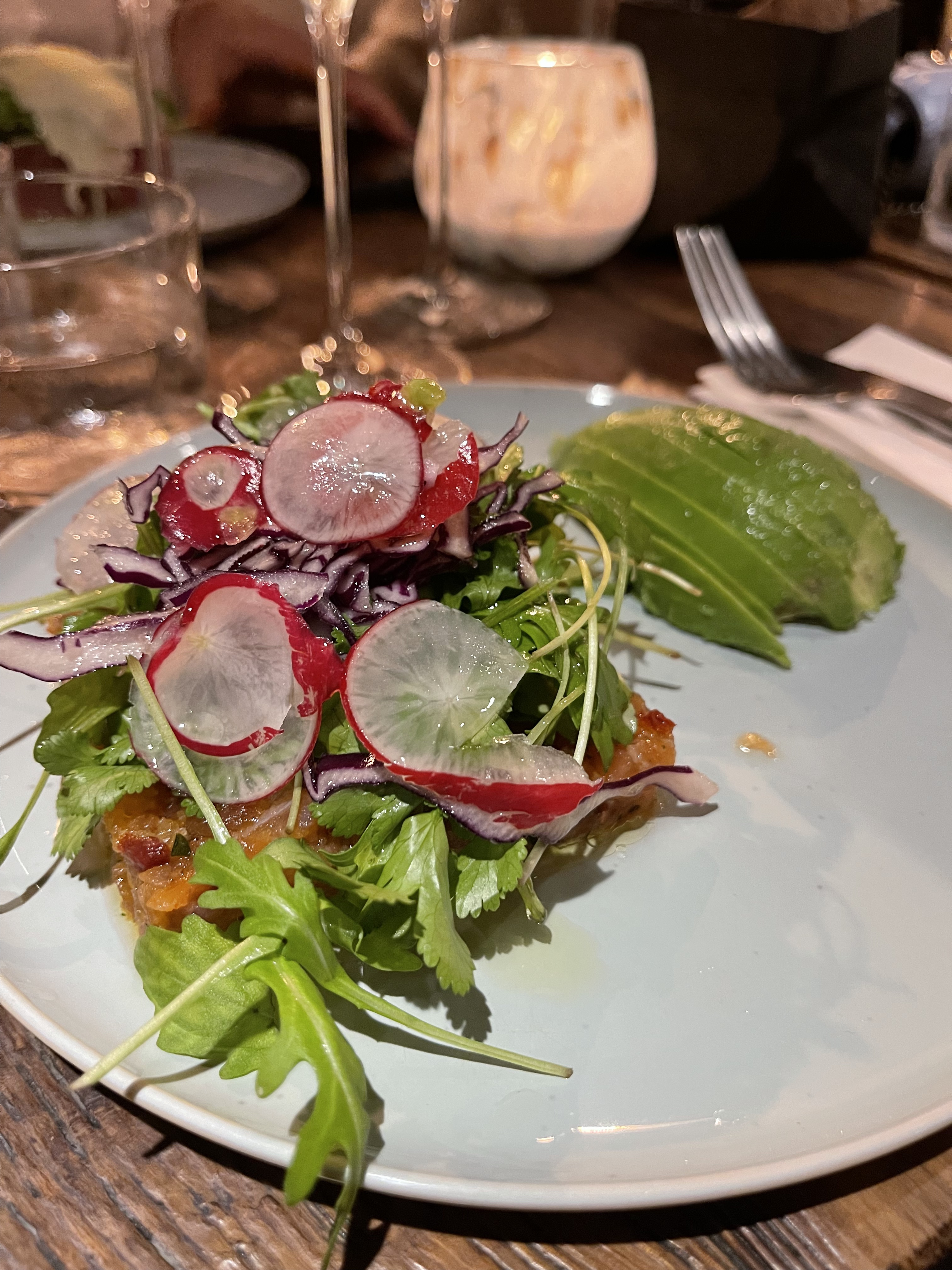 Excellent service et excellente nourriture. La première chose que je voudrais remarquer est le service. Tous les gars qui y travaillaient ont fait le meilleur travail possible, en prêtant attention aux besoins de chaque client. Félicitations pour cela ! La nourriture incroyable, le fromage de chèvre d'un autre niveau. Le tartare de saumon était moelleux et se mariait parfaitement avec la salade. Merci pour cette nuit incroyable que nous avons eue