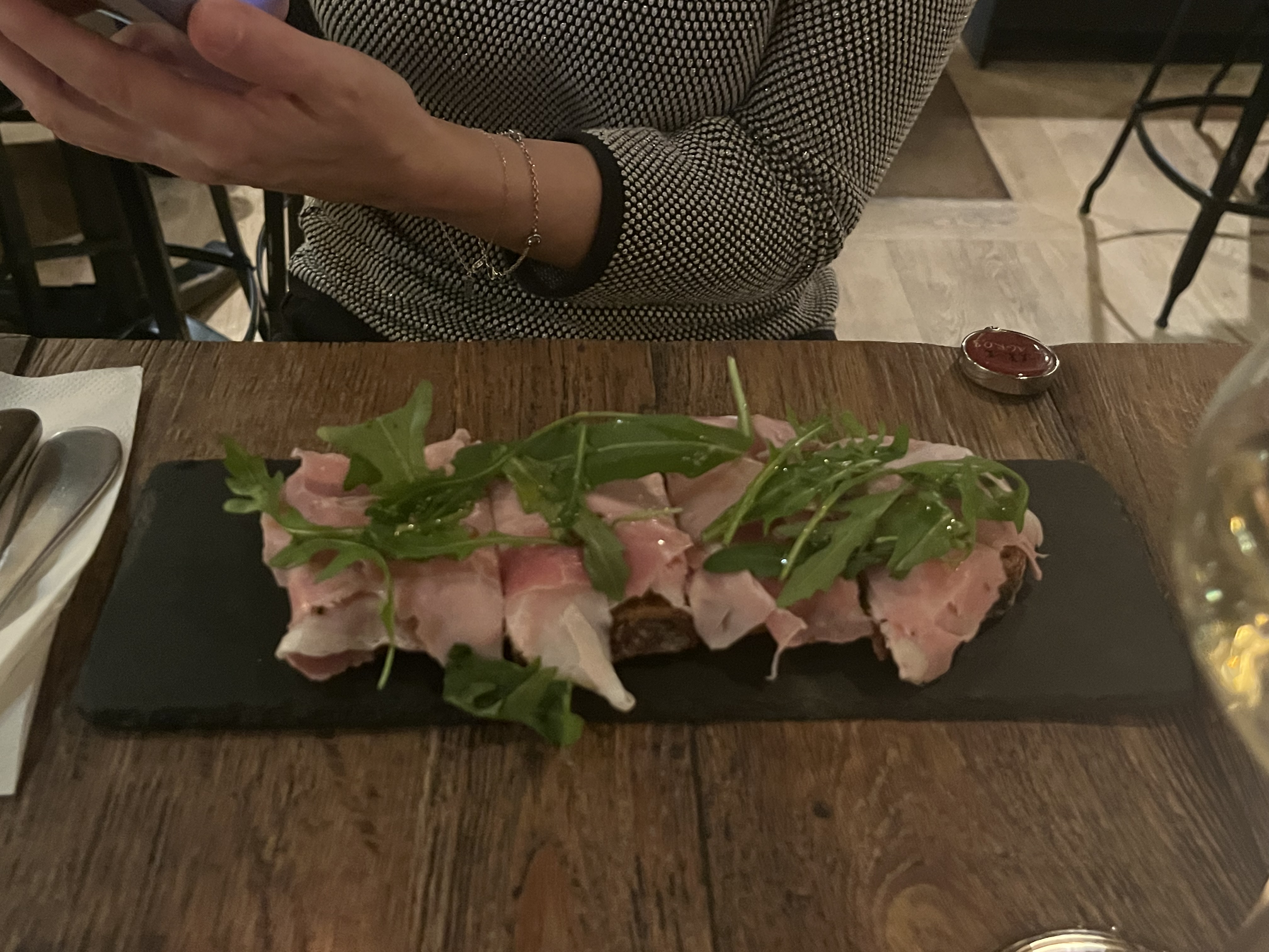 Le restaurant présente un design intérieur unique offrant une atmosphère très décontractée, une excellente sélection de vins et une belle liste de menus. Je recommande vivement le plateau de charcuterie car il accompagne le salume à la truffe, nous avons également apprécié notre dîner avec tartare de bœuf et tartare de saumon, heureusement nous avions encore de la place dans l'estomac pour les desserts car ce sont définitivement des plats à ne pas manquer !