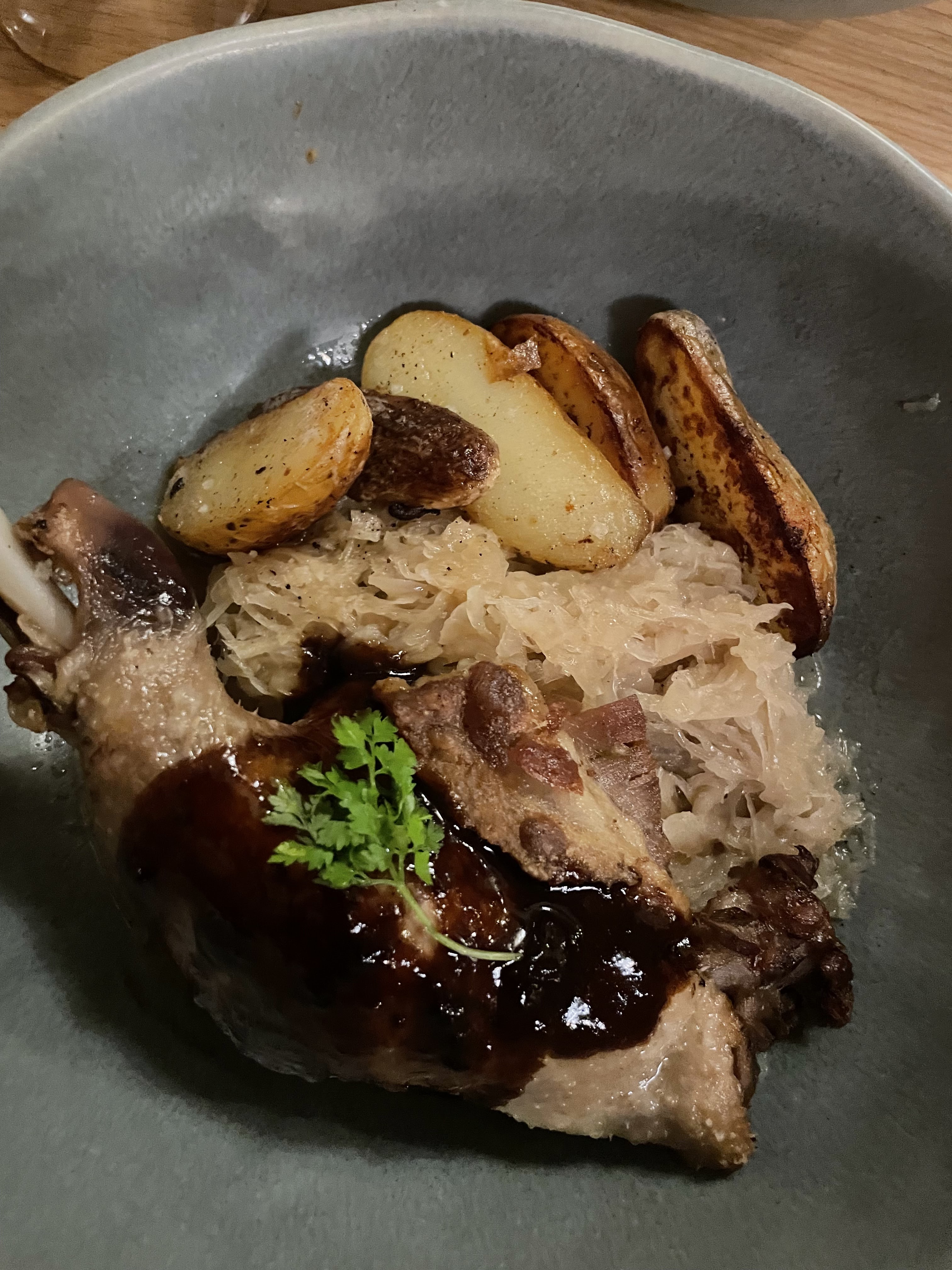 Au plat du jour une poitrine de cochon confite exquise, à côté, une rillette de lapin fermier maison du même acabit. Le personnel est très sympathique, le cadre cosy pour un moment convivial et un super rapport qualité prix, tout particulièrement pour l'emplacement. Je recommande.