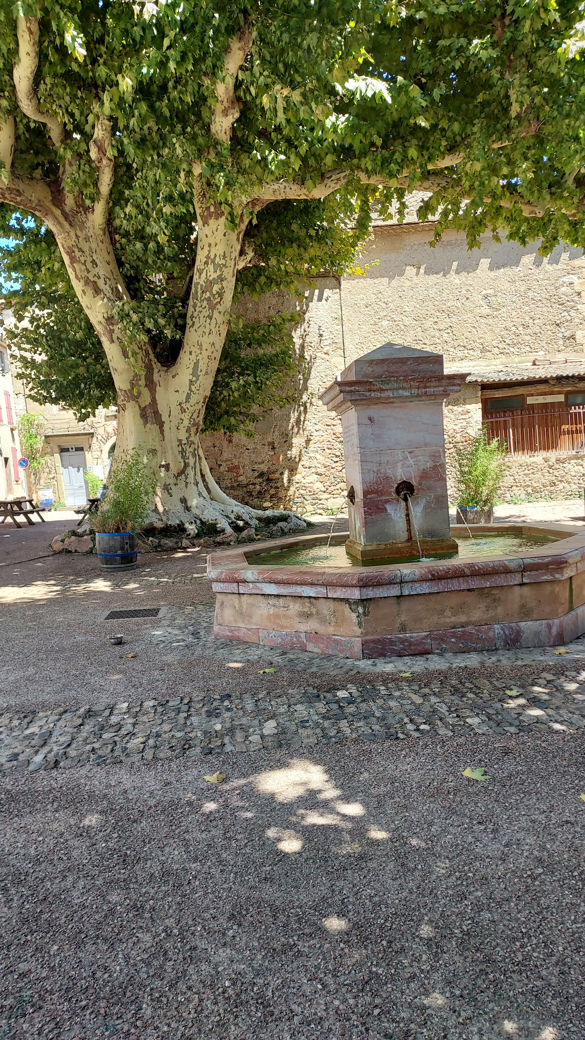 Ce n'est pas le lieu le plus pittoresque, mais néanmoins une halte populaire et un point d'eau. Fréquenté par les locaux et les touristes en saison, c'est un endroit agréable pour s'asseoir et regarder passer les gens sous les platanes et près de la fontaine d'où il tire son nom. Gestion sympathique et bien situé au coeur du village. La nourriture est meilleure que ce à quoi on pourrait s'attendre, surtout le menu du jour. Bel endroit où s'arrêter pour une pinte, un rosé ou un pastis l'après-midi ;)