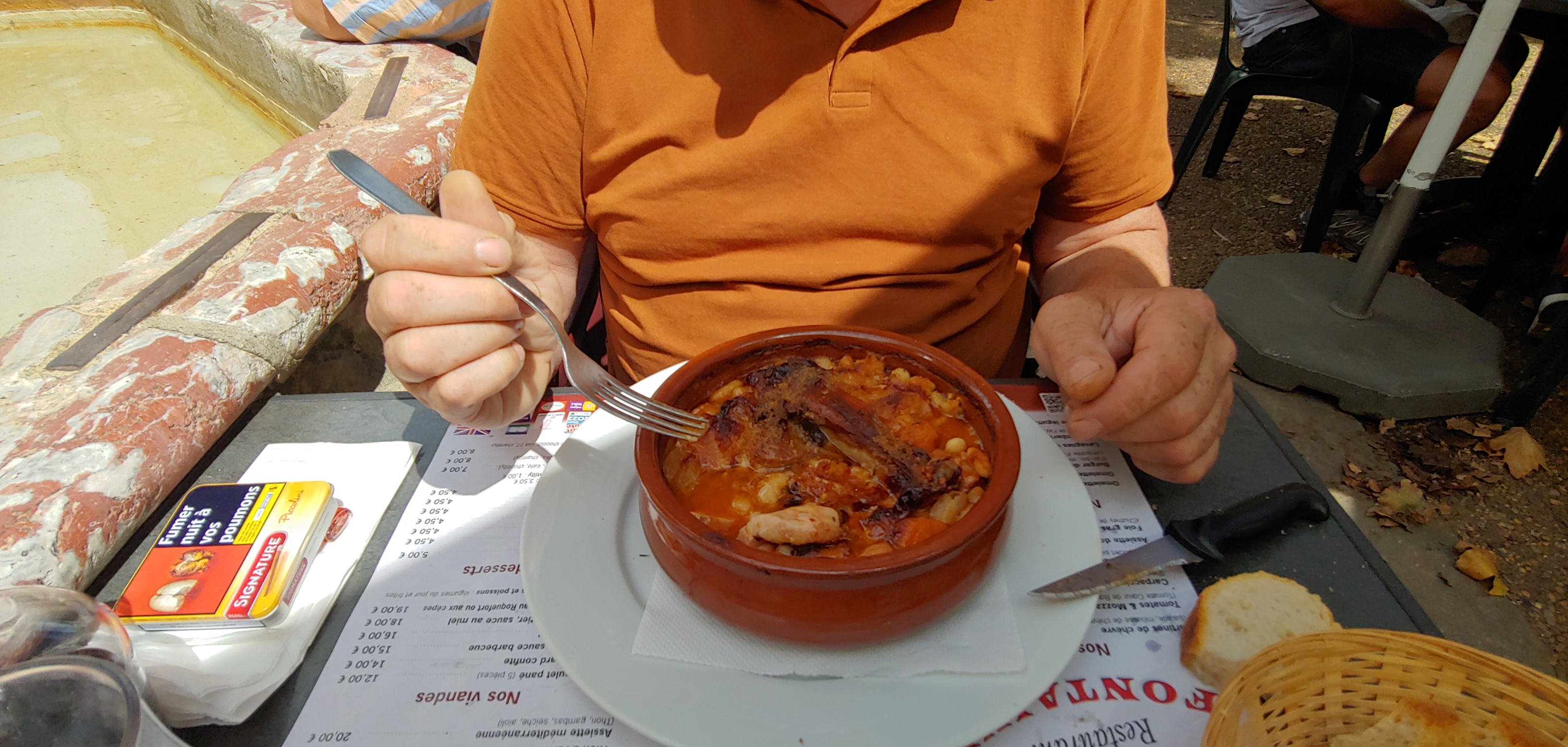 J'ai eu le cassoulet Maison même si c'était une chaude journée d'été. Que puis-je dire ? La nourriture était absolument délicieuse. Les haricots étaient parfaits et les saveurs du cassoulet étaient superbes. Ok, cet endroit n'est pas une cuisine raffinée mais s'asseoir dehors sous les parasols avec la fontaine qui chante en fond sonore pendant que vous mangez de la nourriture de bonne qualité, c'est comme on dit, parfait !
