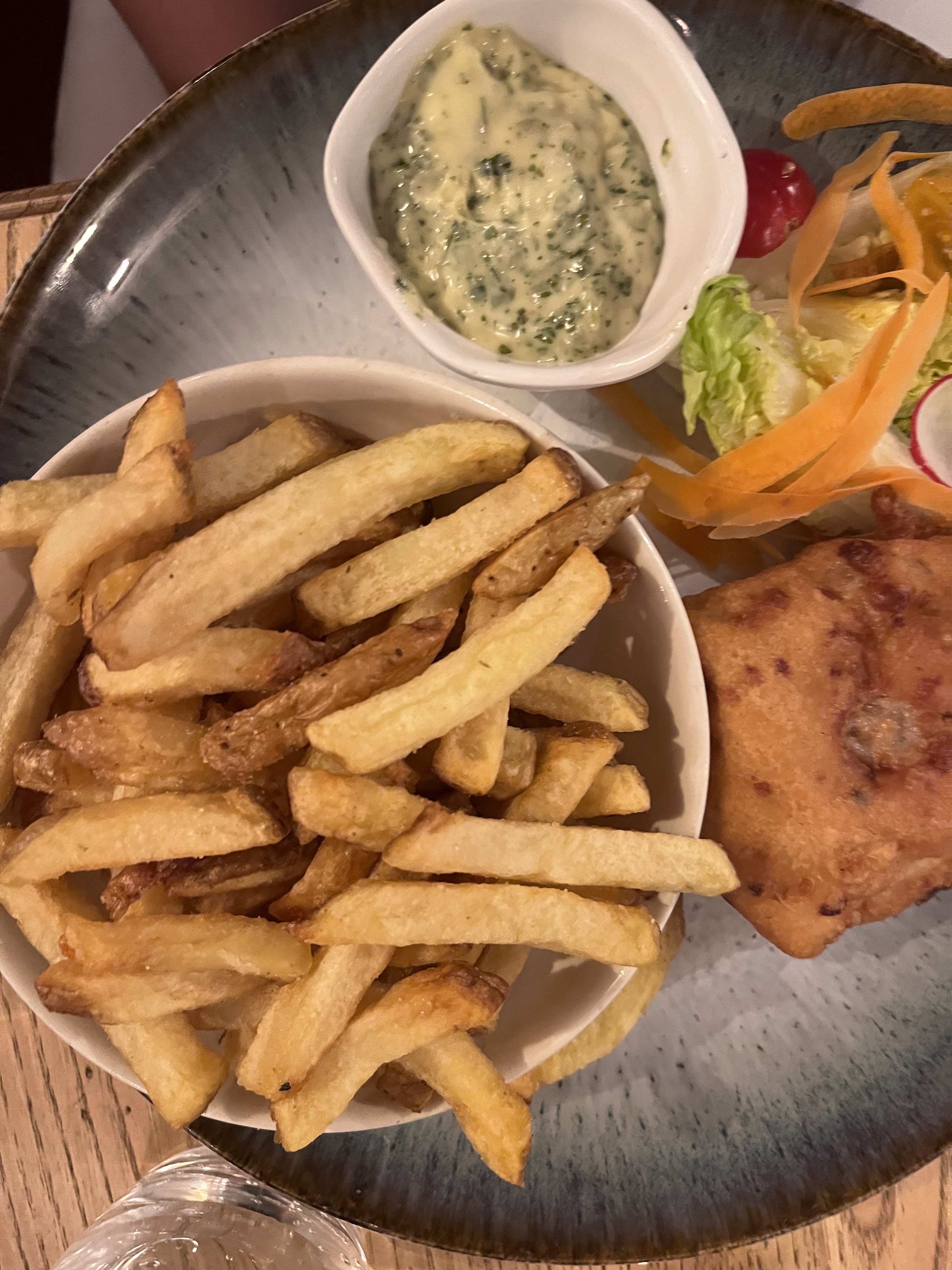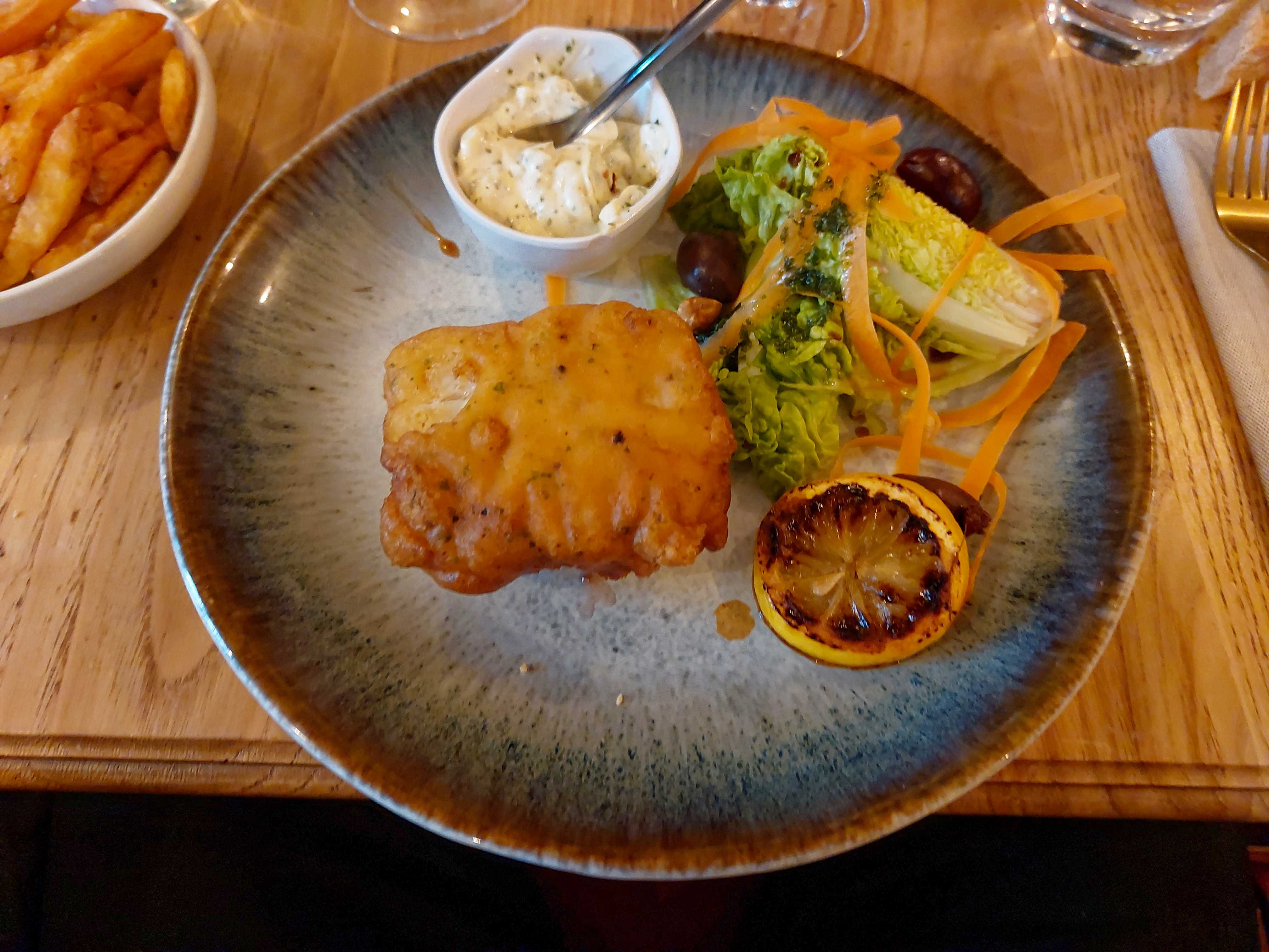 Petite déception, cela faisait longtemps que nous voulions essayer ce restaurant et nous sommes un peu resté sur notre faim. Tous les avis sont très positifs donc j'espère que c'est un accident de parcours, mais notre repas n'était pas si exceptionnel. Le service est le premier point négatif, l'accueil est très chaleureux mais après c'est assez bancal, long et balbutiant, c'est dommage. Le cadre est quant à lui super, la déco est très jolie et chaleureuse. Au niveau de la cuisine, c'est également une petite déception, les ravioles étaient très sèches et au final sans énormément de goût, le fish n chips était très simple et également peu savoureux, enfin le filet de bœuf était excellent bien qu'un peu nerveux, en revanche les légumes croquants en accompagnement étaient certes croquants mais assez gras et fades. Les desserts sont simples mais bons et les parts de chaque plats sont plus que généreuses ! C'est donc mitigé, les tarifs sont élevés et les attentes aussi, nous avons cru comprendre qu'il y avait ponctuellement un manque de personnel, c'est peut être la raison, dommage en tout cas...