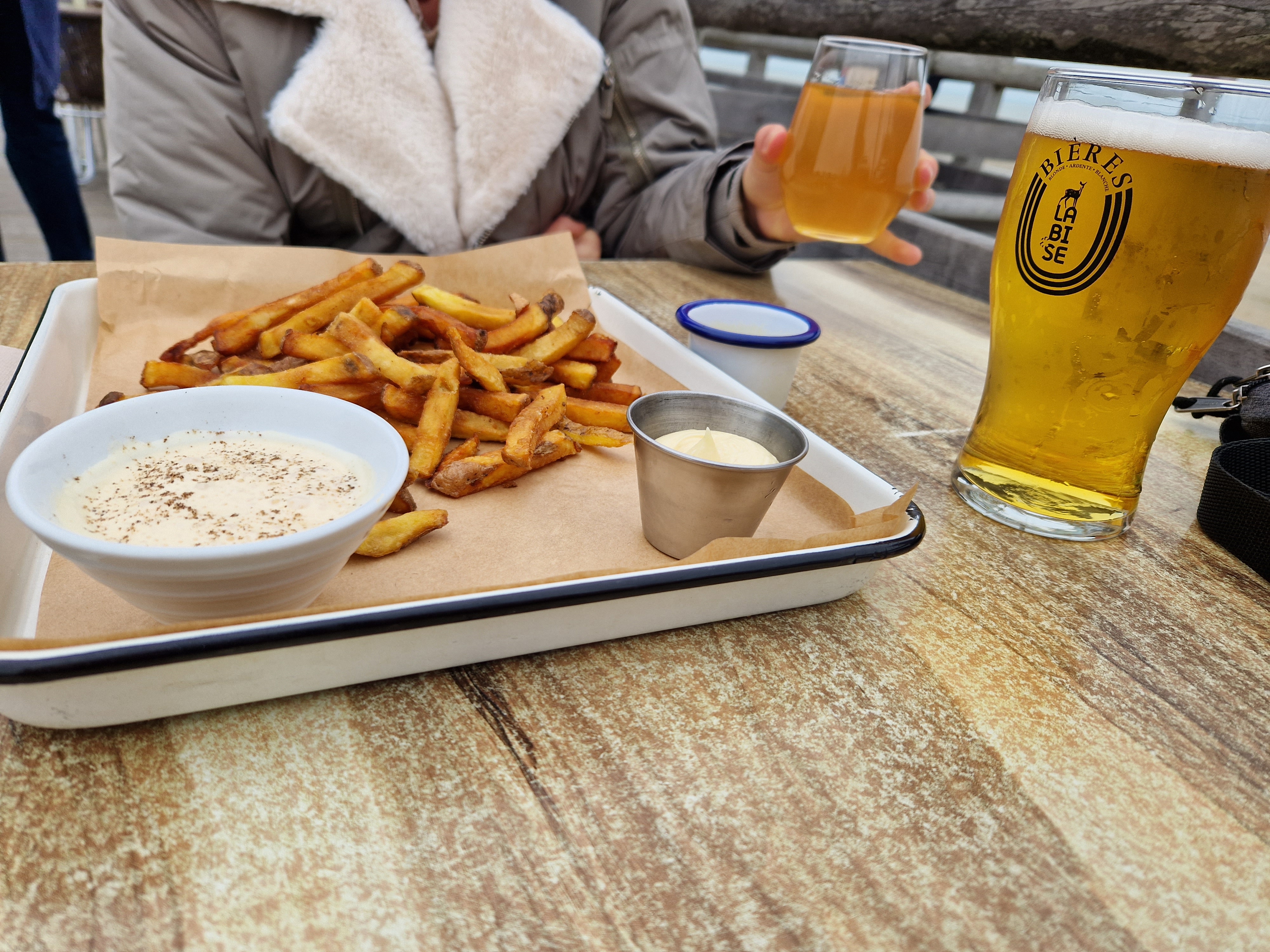 Accueil chaleureux. Petite carte avec des produits locaux et de qualités. Perso, on a prit des croquettes aux crevettes et le ceviche à partager, c'était parfait !! (la petite sauce au maroilles avec les frites 🥰🥰) Le cadre est magnifique, on peut y manger en regardant le coucher de soleil