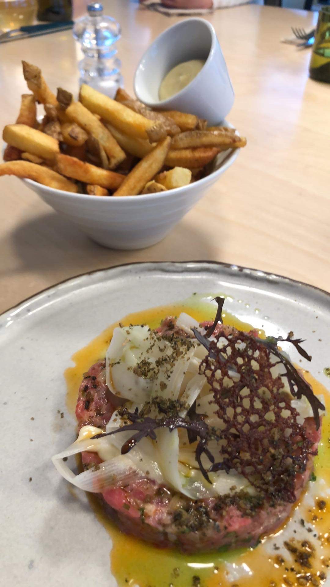 Dans cette petite station balnéaire du nord, un établissement jeune et dynamique, une vue à couper le souffle, soyons clair il est préférable de réserver, nous ne l'avions pas fait et avons été installé à l'îlot, table et tabouret haut qui ne sont pas super confortables MAIS la cuisine et le choix de boissons régionales nous ont séduit, un picon pour commencer et un vin orange pour moi (c'est bien uniquement du raisins de grenache à découvrir), ensuite des fish and chips de qualité avec une bonne sauce et des frites, par gourmandise j'ai pris un dessert et une fois de plus pas de déception, prunes et meringue délicieux quasiment sans sucre, bref un très bon moment,...