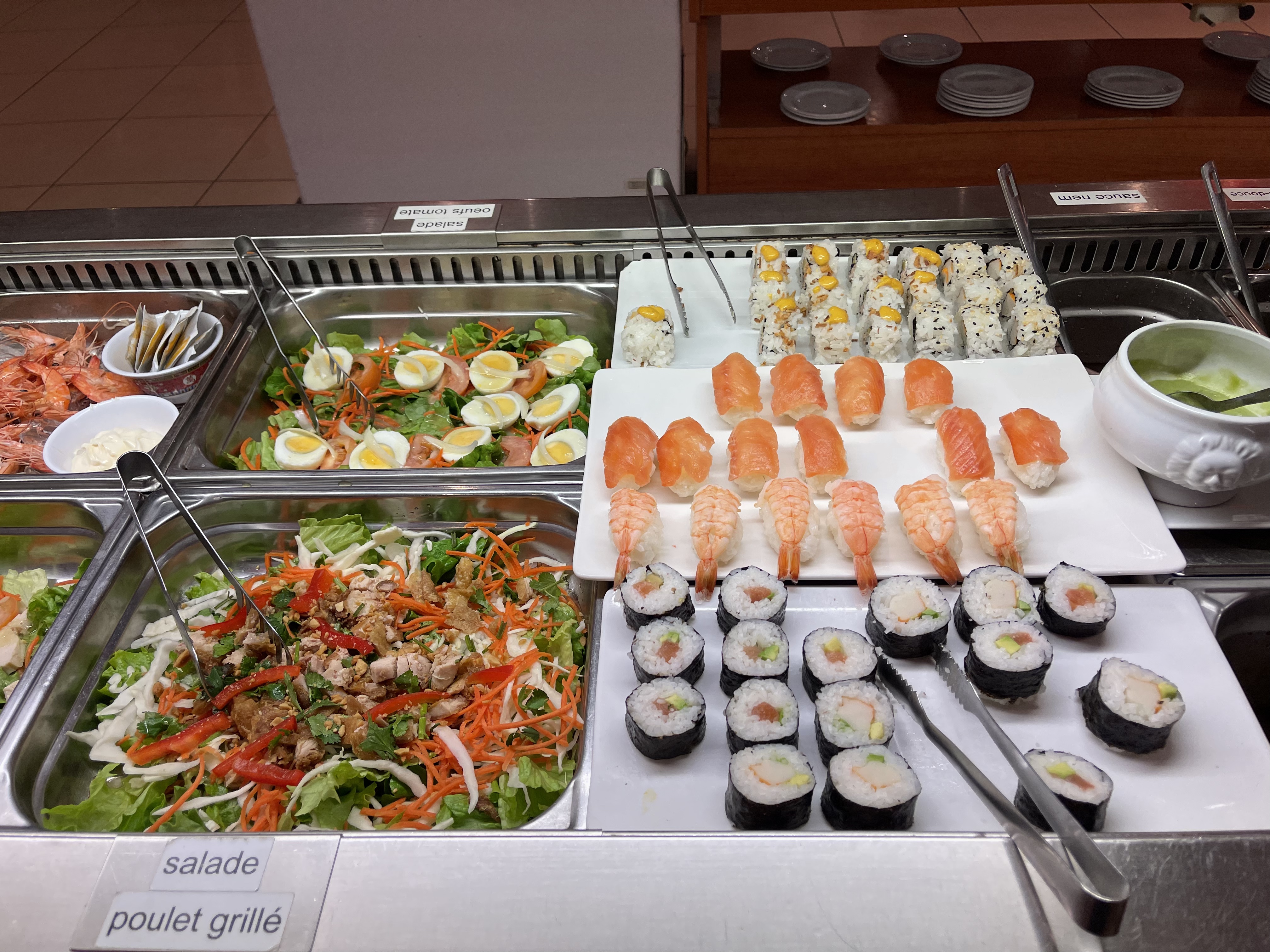 Pas assez de choix (sushis surtout), fermeture à 14h30 trop tôt, du bon et du moins bon