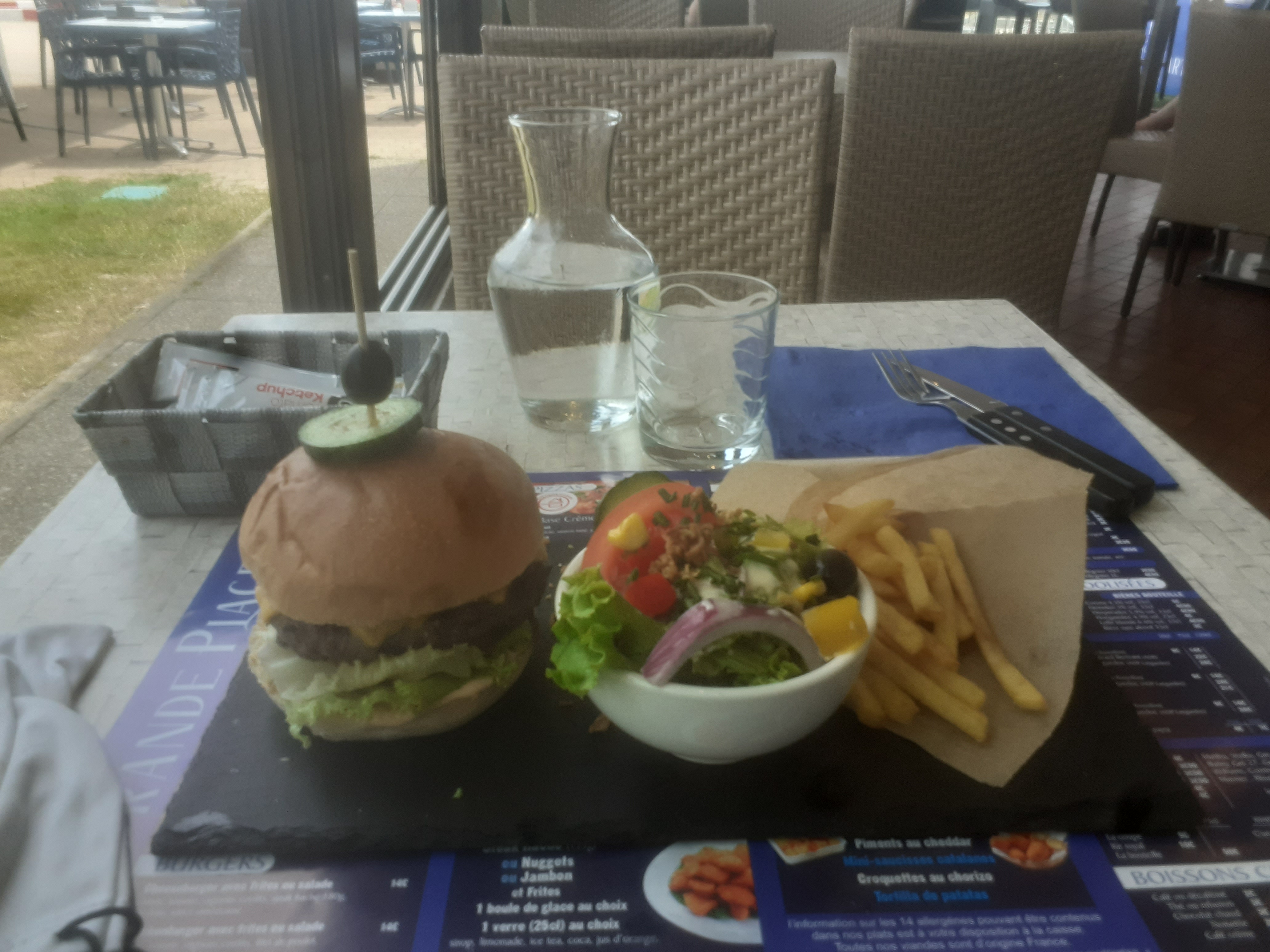 Ce n'est pas de la grande cuisine, nous avons pris une salade et un burger qui était vraiment banales les ingrédients ne sont pas de qualité Service rapide avec un peu de musique et un serveur agréable dans un cadre qui reste beau. 2.5/5 je mets 3 pour être sympa.