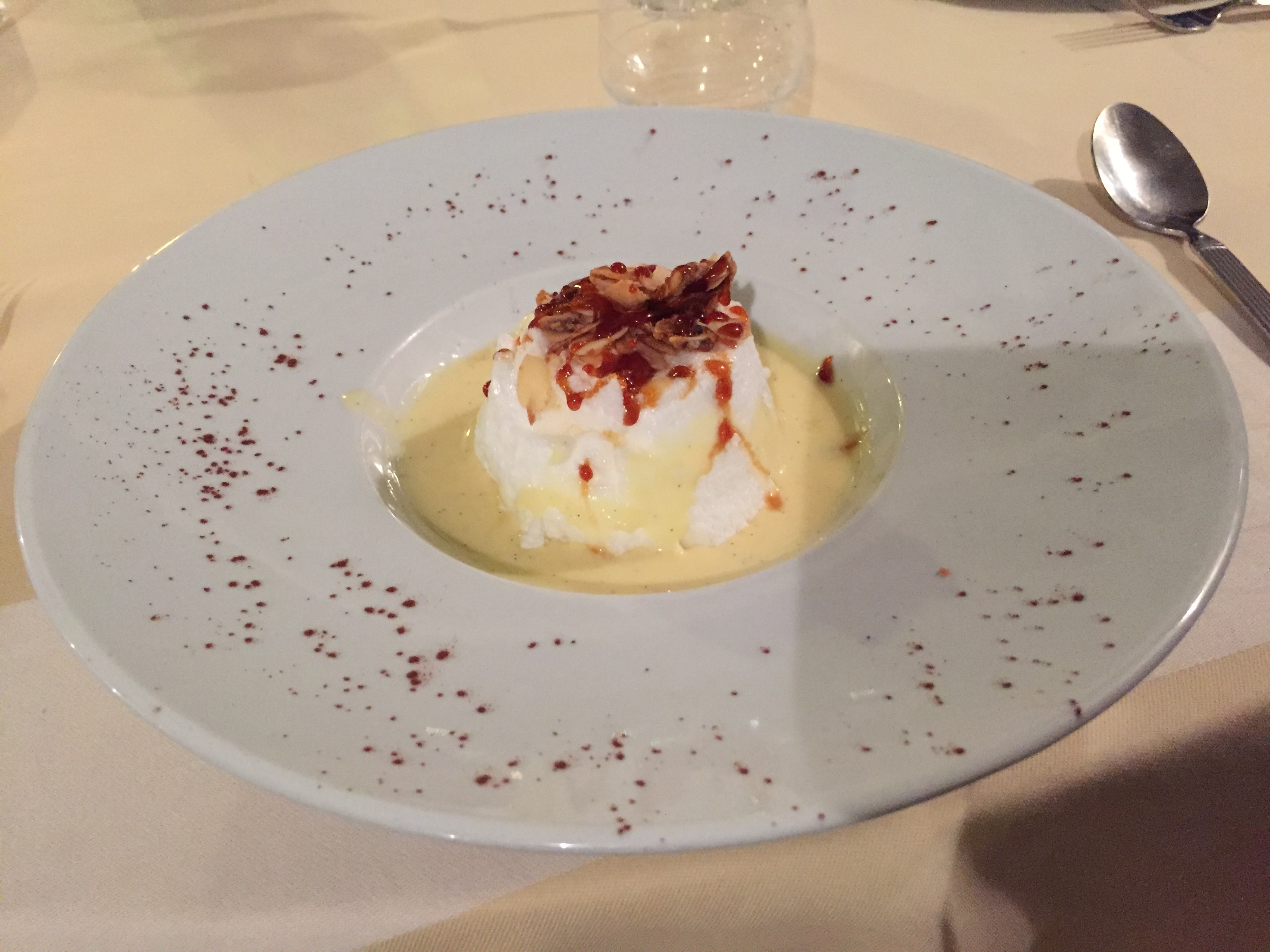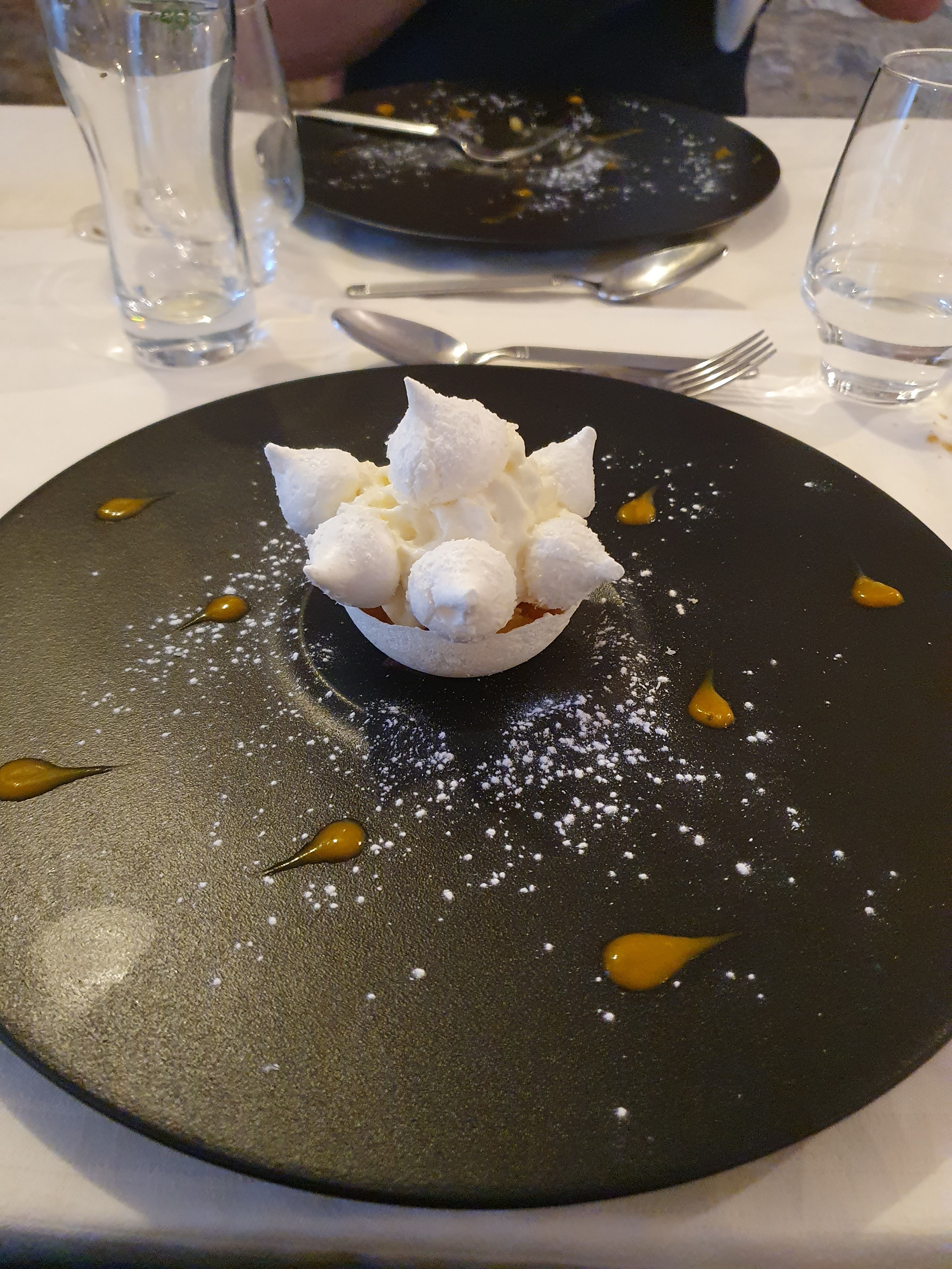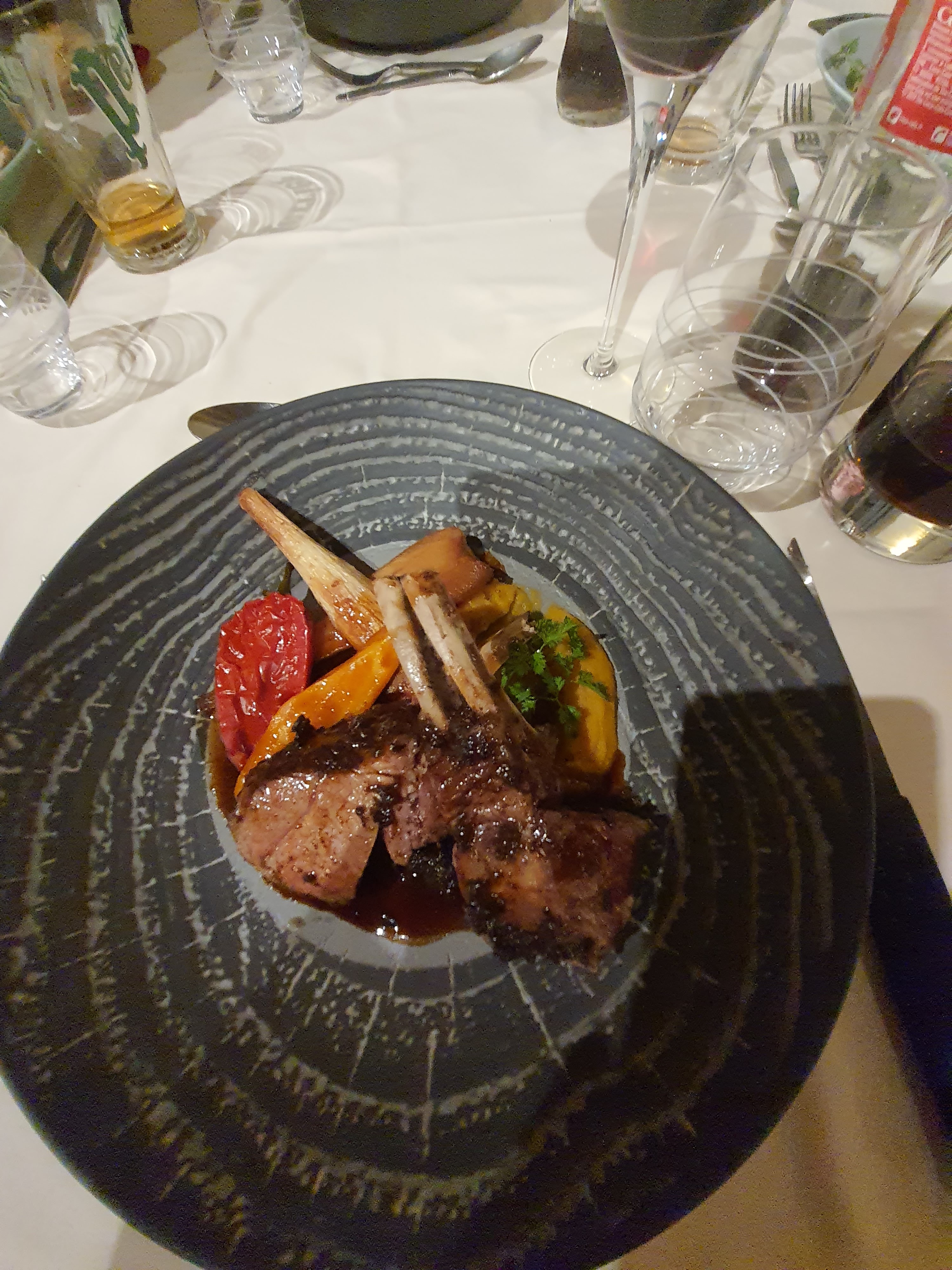 Dîner très agréable sur la terrasse avec des plats exquis dont une escalope de foie gras poêlée suivie du bœuf Angus avec de délicieux petits légumes, le jus de bœuf et un condiment à l’orange. Un régal ! Les desserts furent à l’avenant : île flottante au pralin et croquant glacé pain d’épices et framboises conclurent ce repas avec bonheur.