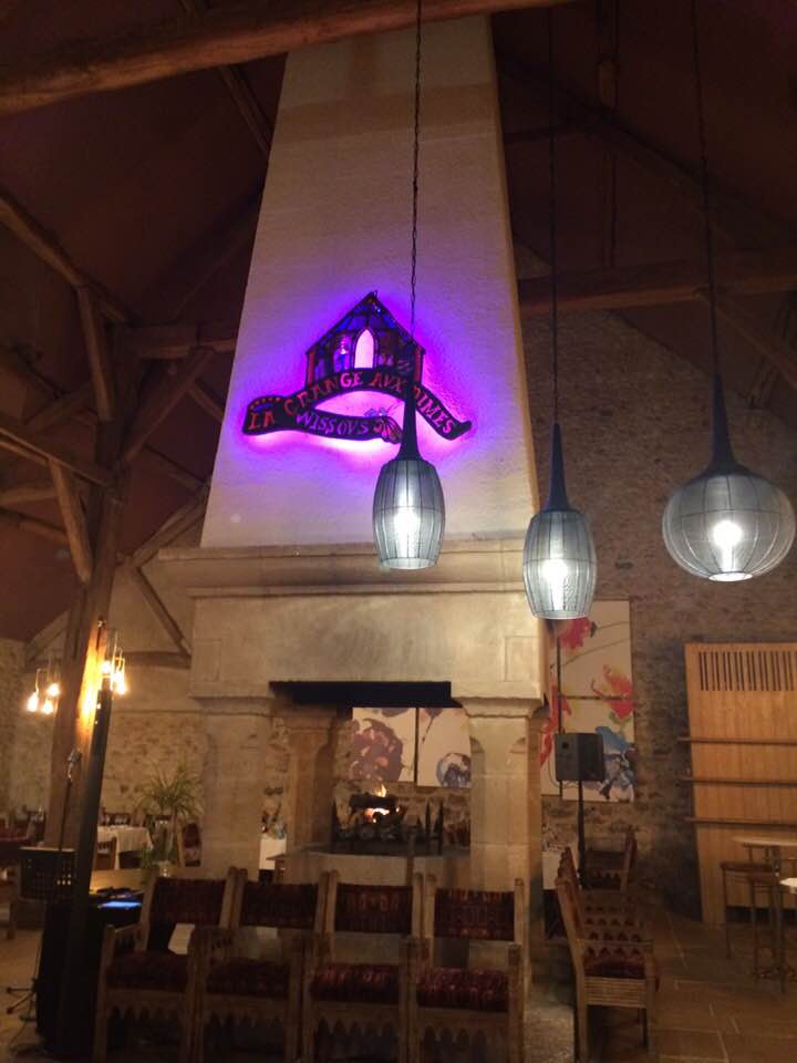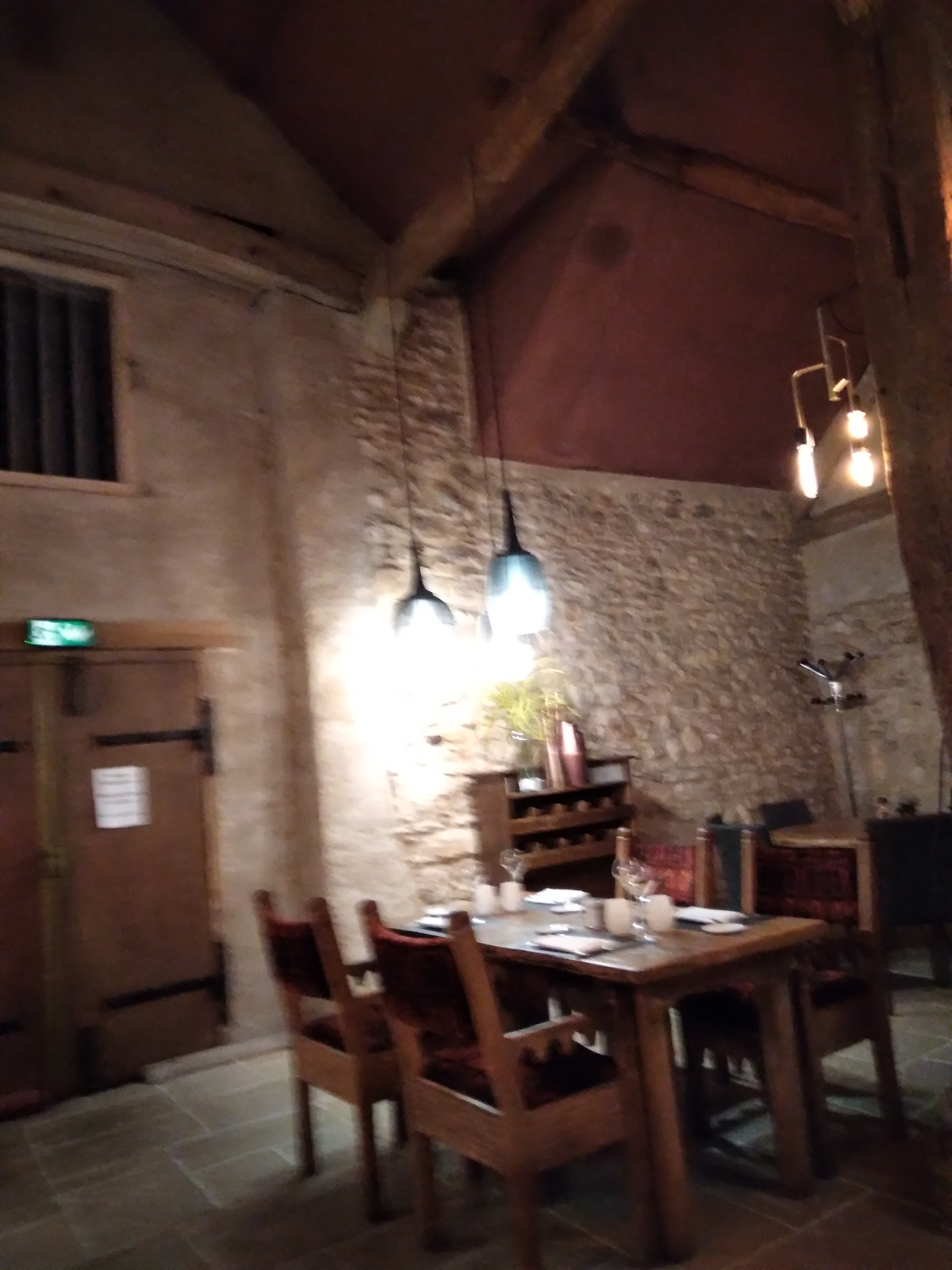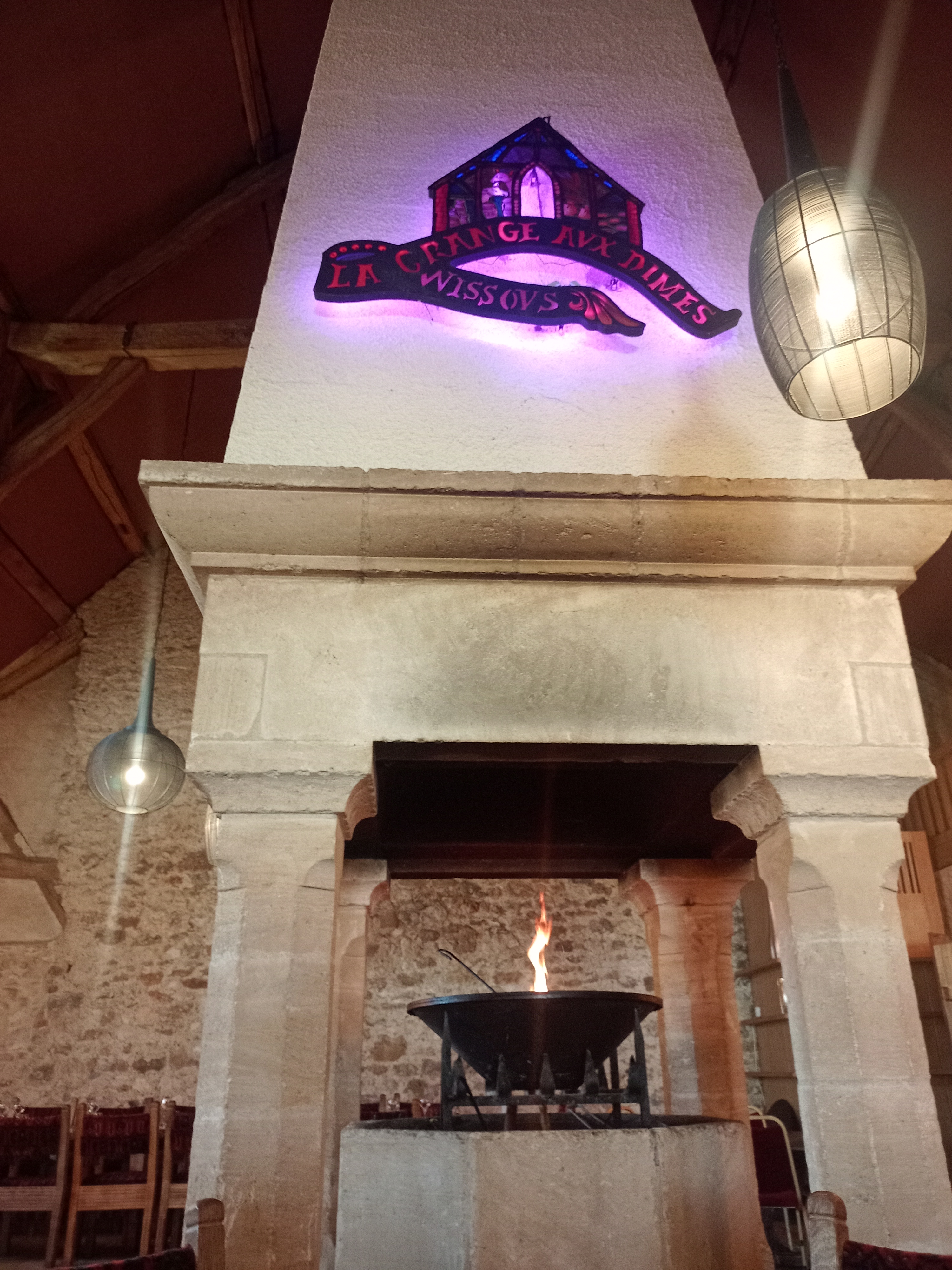 Très beau cadre pour une cuisine inventive. Dès l'entrée dans cette grange du 13ème siècle bien restaurée, le regard est irrésistiblement attiré par la monumentale cheminée qui trône au milieu de l'immense salle. Elle fonctionne surtout le soir mais elle reste parfois encore active le lendemain midi. Le mobilier est en accord avec les lieux : tables massives en chêne et chaises médiévales. La cuisine connaît des hauts et des bas. Les mises en bouches sont vraiment indignes d'un restaurant gastronomique. Certains plats sont très réussis (comme les gambas aux houmous), d'autres moins. Mais il y a une certaine recherche. Les desserts sont quant à eux bien travaillés et délicieux. D'aucuns diront que la cuisine n'est pas à la hauteur des prix pratiqués...