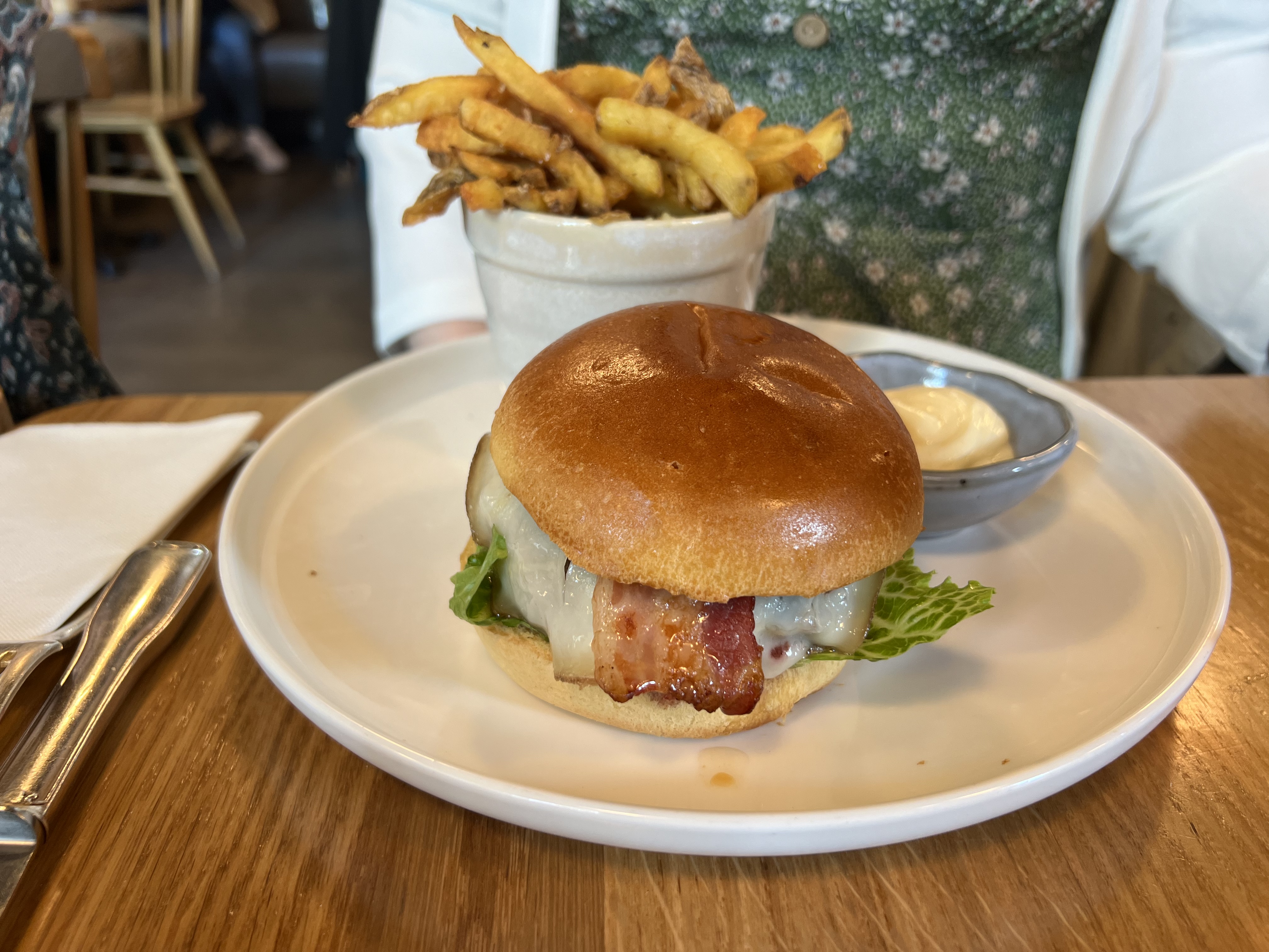 Déçus par rapport à la dernière fois (aout 2022) Nous avons pris 2 menus à 34 € : -entrée œufs panés avec endives,œuf et panures très durs à couper et à manger - terrine de porc servie avec entame (on ne sert pas l'entame! ) - burger : on ne m'a pas demandé la cuisson - frites trop cuites et toutes petites - parmentier de joue de boeuf : pas assaisonné et très gras - brioche perdue avec caramel beurre salé et glace : brioche pas assez grillée Pour le service , a revoir car très long et certains étaient servis bien avant les autres dans l'ordre d'arrivée Avons fait un petit sondage aux 2 tables à coté : déçus également