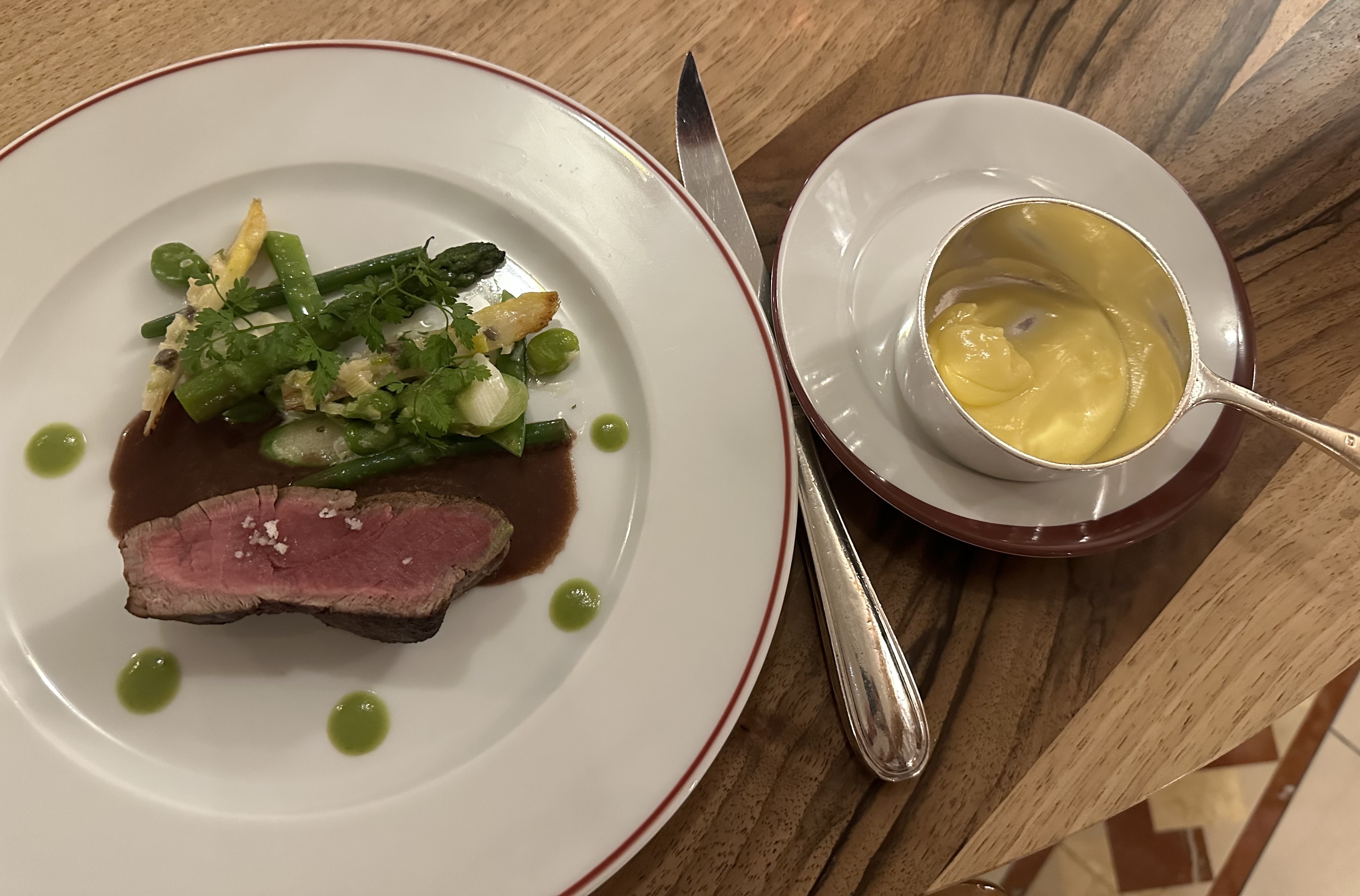 Cadre et cuisine raffinée Que demander de plus pour un déjeuner à part des plats succulents, un service propre et délicat, des conseils du sommelier excellent. Nous avons passé un. Moment très très agréable.