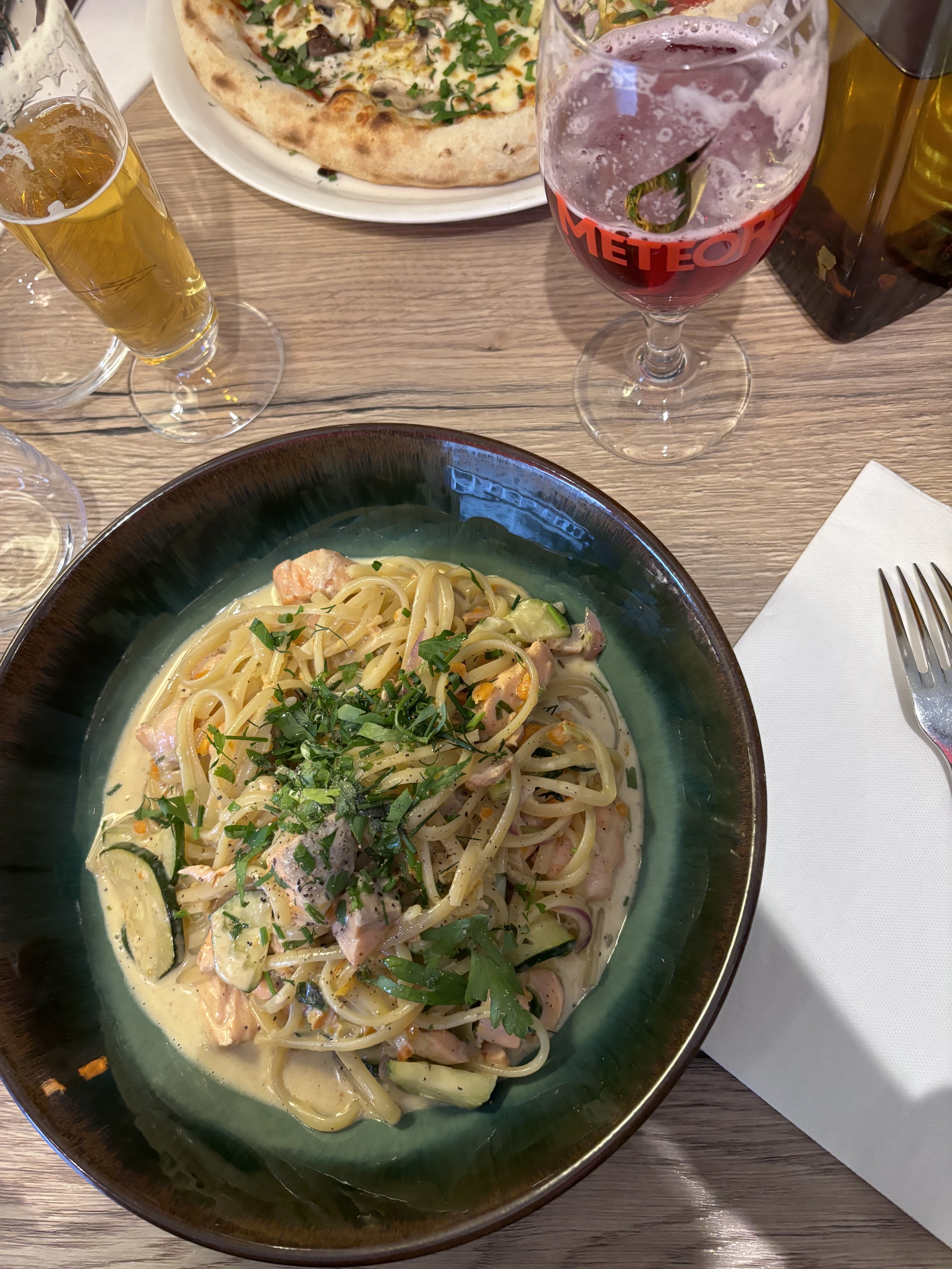 Les pâtes au saumon et à la courgette étaient sans saveur et la pizza était salée à cause du jambon. De plus, l'attention était un peu précipitée et l'endroit était trop petit et pas très confortable.