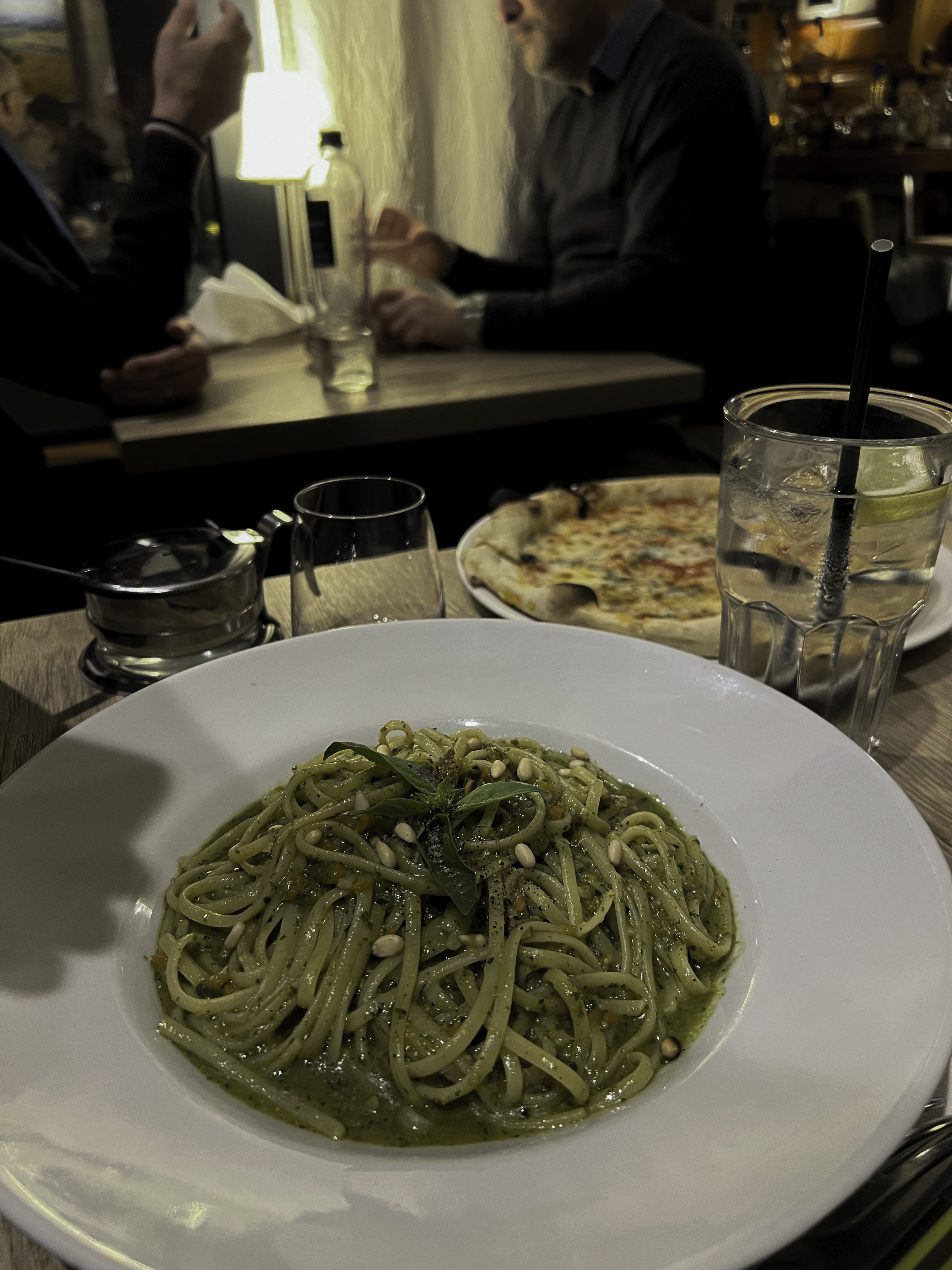 Le type qui nous servait a fait un travail formidable mais notre commande n'était pas tout à fait celle attendue. Nous avons eu une lasagne absolument incroyable, mais les deux commandes de pesto de linguini étaient épouvantables, trop d'ail, ce qui rendait le pesto amer. J'ai dû égoutter toute l'assiette avec du parmesan pour la rendre mangeable. Pas de sel ni de poivre, aucune saveur à part l'ail. Pas impressionné.