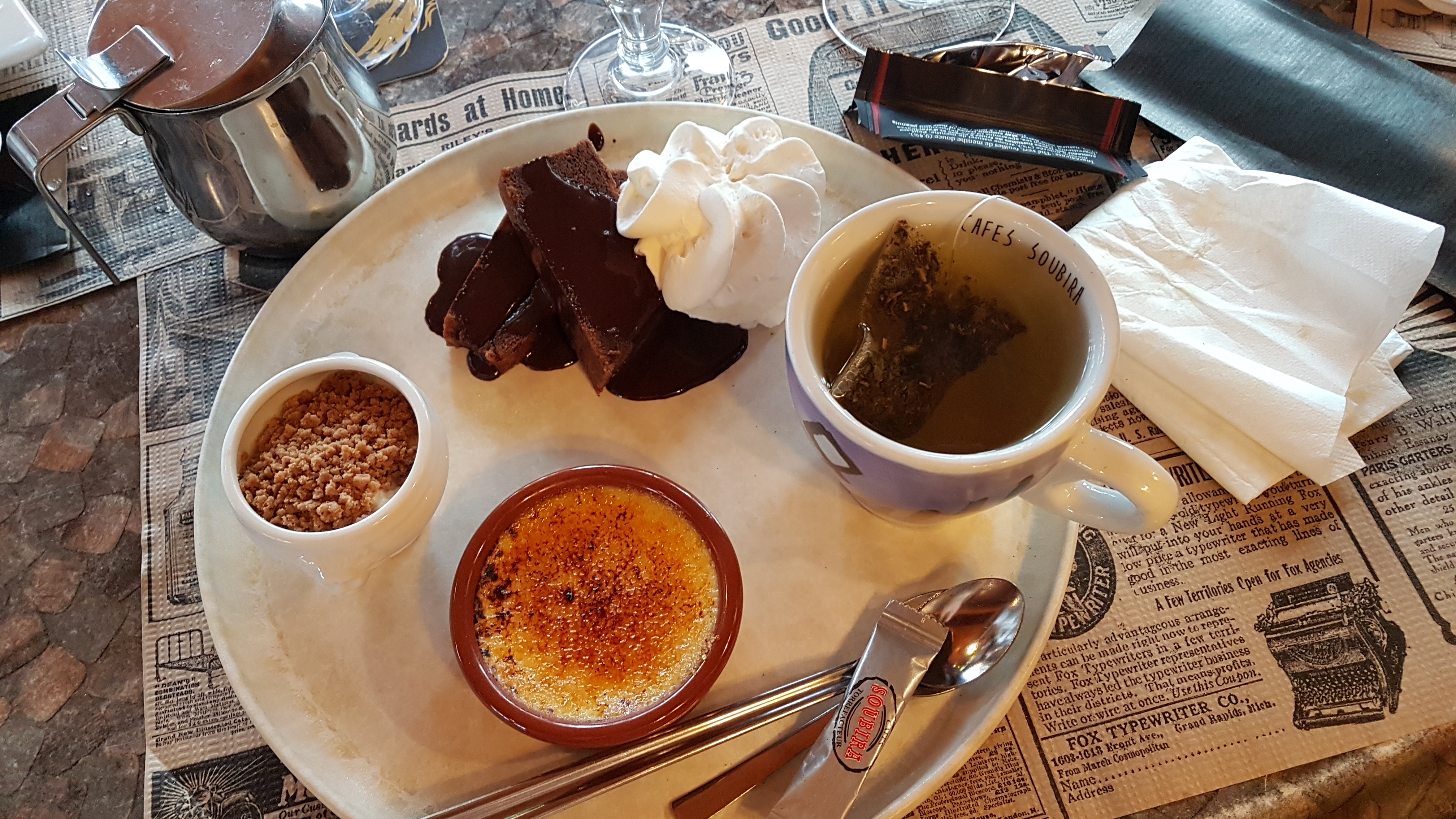 Arrivés à 14h30, nous étions septiques quant à pouvoir manger... Mais non, nous avons été très bien accueillis et celà est suffisamment rare pour que je les en remercie. Pour la nourriture, les portions étaient copieuses et les plats et sauces travaillés mais juste ce qu'il faut... Efficacité sans tralala. Pour les desserts nous n'en avons pas pris ( portions copieuses 😏) mais en avons vu passer de toutes sortes et celà donnait vraiment envie, la prochaine fois certainement... Et les desserts sont servis toute l'aprem. En bref, bon rapport qualité-prix, bel emplacement, nous recommandons