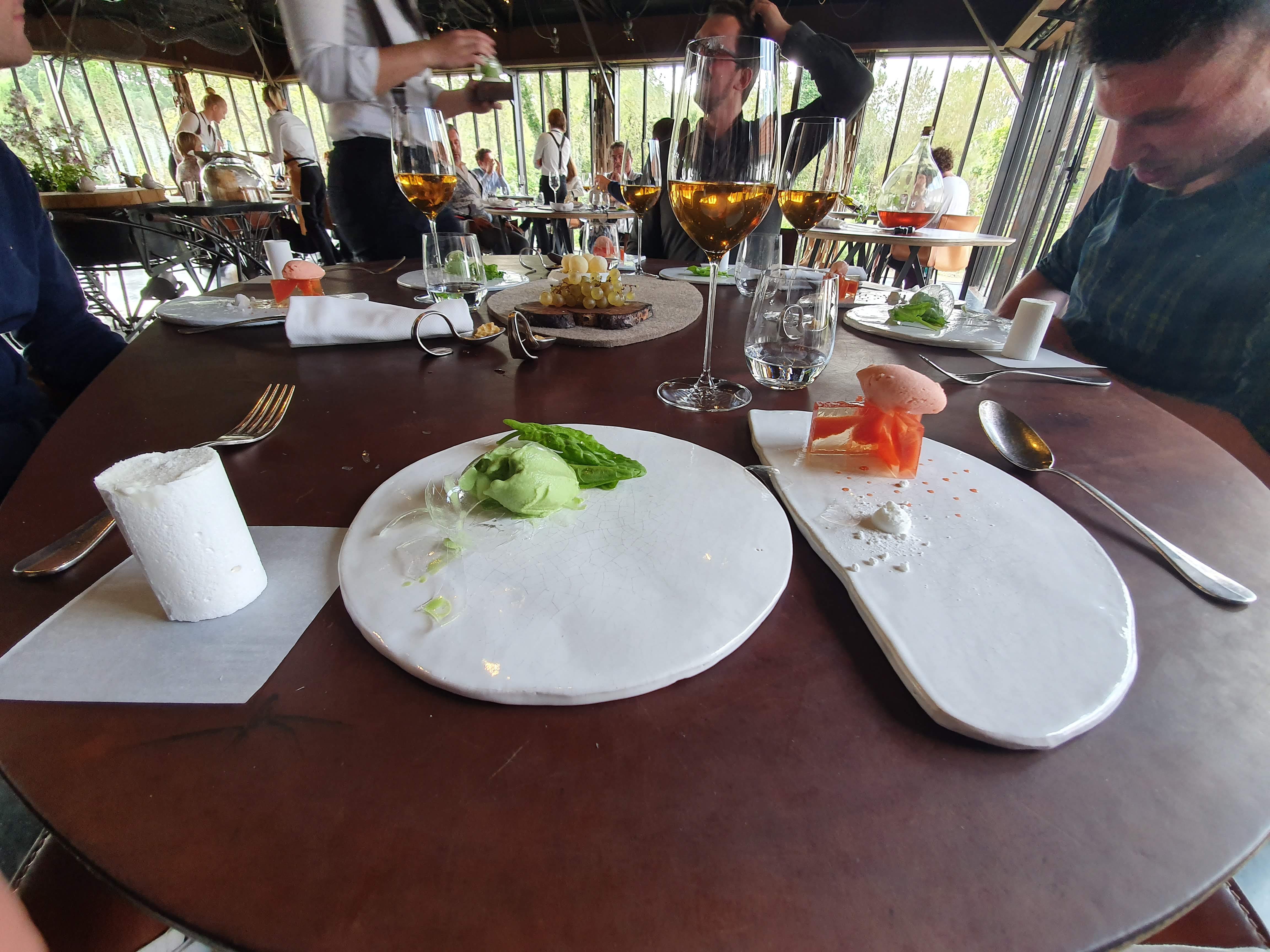 La note générale est dure mais à la hauteur de la déception compte tenu de la réputation du lieu. Le site est incroyable, rien à dire. C’est très beau, tout est chiadé, classe, bien que l’acoustique du restaurant puisse être à revoir… les chambres en pleine nature son cosy, élégantes, un peu sombres mais pas choquant, au contraire ce sont des huttes! Le service est prévenant, gentil, simple mais professionnel. Jusque là, rien à dire. L’assiette en revanche… on reconnaît à Alexandre Gauthier (qui n’était pas là ce soir là…) la mise en avant de notre terroir et de la gastronomie du Nord. Il fait partie des chefs emblématiques qui ont permis un essor de la région et des autres chefs… mais quand on a une telle réputation, il faut la tenir. Or, les assiettes se sont succédées, sans fil conducteur, avec souvent une incohérence voire des fautes de goût. On est déstabilisés, pas toujours dans le bon sens du terme. On sent qu’il y a une tentative de recherche, peut être trop et du coup… est-elle pleinement aboutie?… un boulot monstrueux sans nul doute, avec un résultat peut être pas tout à fait à la hauteur. Et les desserts… ceux d’un cuisinier peut être mais clairement insuffisants pour un deux étoiles.