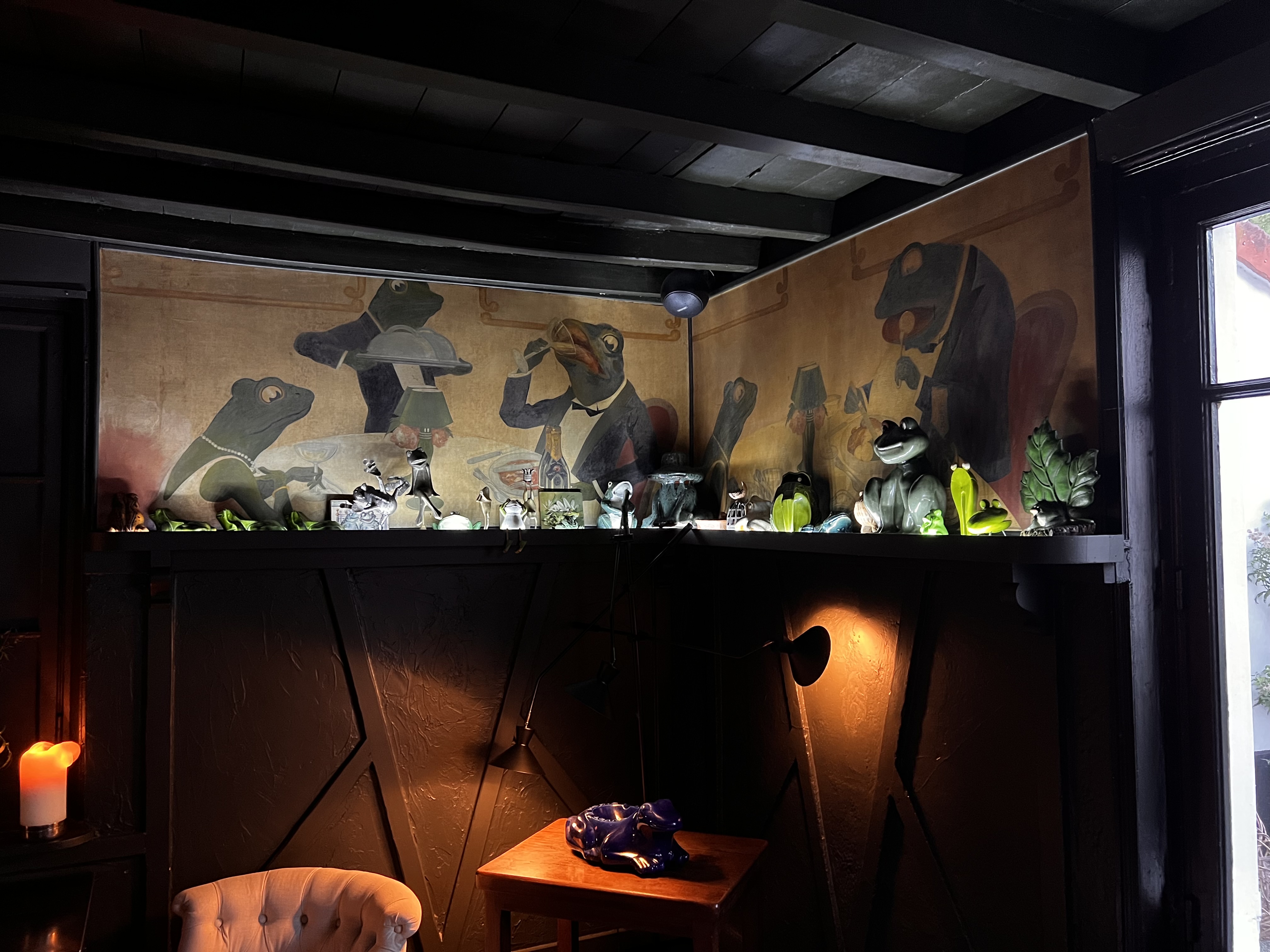 Expérience sensorielle totale pour ce restaurant qui mérite bien plus que son unique étoile. Dans une salle baignée de lumière et donnant sur un jardin au charme sauvage, le décor de béton brut et le poêle central créent immédiatement un contraste saisissant. On observe alors la cuisine ouverte: des cuisiniers s'agitent sans faire de bruit, sous l'oeil attentif du chef Gauthier. Le service se montre chaleureux, complice et synchronisé. L'eau est proposée à discrétion. La carte est au premier abord limitée et peu bavarde. Pour la bonne cause: les ingrédients principaux sont mentionnés, sans les poncifs de certaines maisons. Ainsi la surprise de ce qui arrive effectivement dans l'assiette n'est que plus grande. Les produits sont sublimés, le simple devient exceptionnel et l'exceptionnel... incroyable. A la fin du dîner en 9 services, le café dans les les salons permet de s'imprégner de l'histoire du lieu aux centaines de grenouilles. Au moment du départ, les quelques mots échangés avec le Chef finissent de me convaincre: voilà une superbe maison qu'il vous faut visiter.
