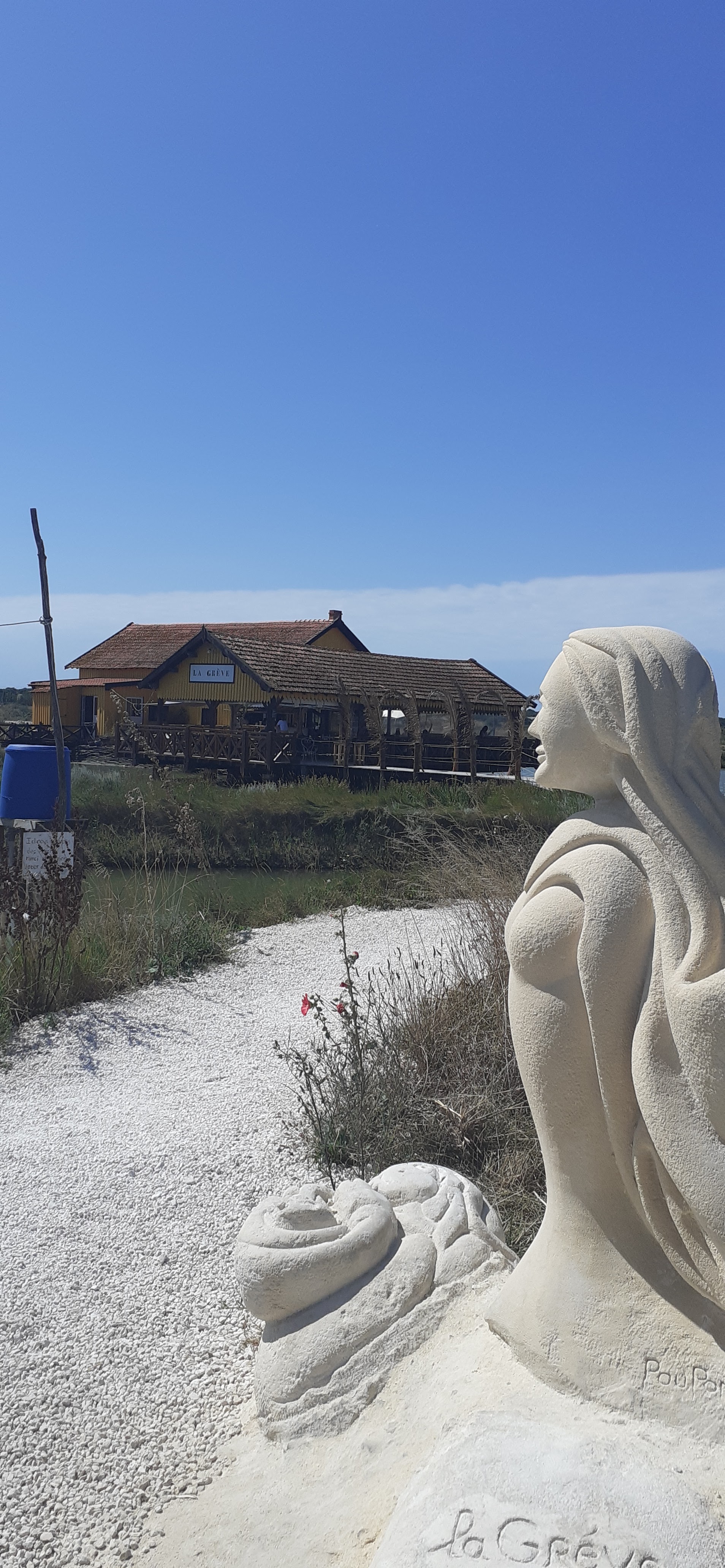C'est au bout d'un chemin de cailloux bordé de sculptures de David Pouponnot que se dresse en retrait de la route le restaurant La Grève. À l'abri du bruit et du passage des voitures l'endroit se compose de terrasses en bois, l'une protégée et l'autre à l'air libre. Le cadre est donc fort agréable. Le service est impeccable, avec le sourire. Les plats sont à un certain prix, sans que cela ne soit excessif. Nous avons choisi les huîtres gratinées, des moules au Pineau et des moules à la fourme d'Ambert, le tout avec frites maison et Mayo maison, très bons ! Je conseille !