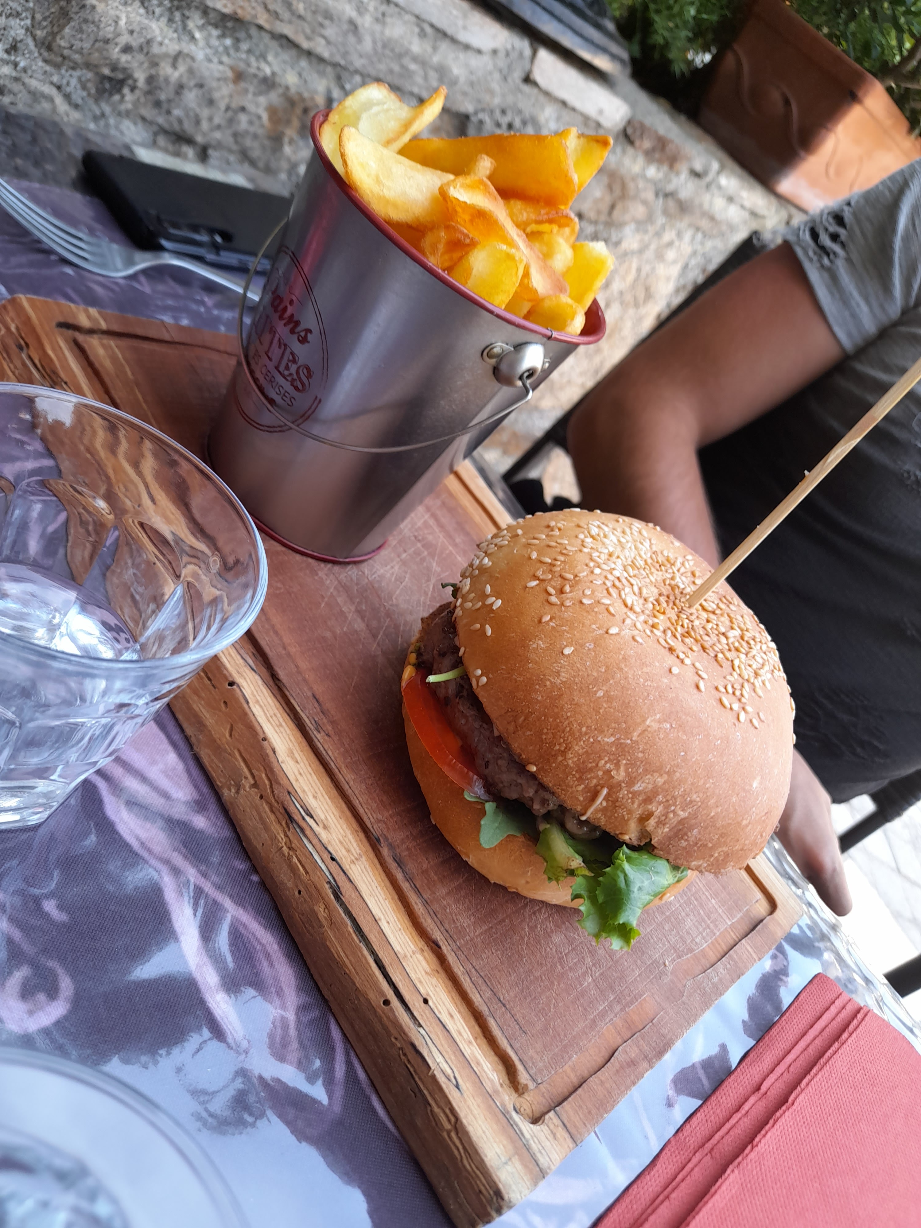 Super hamburger. Je suis allé au bacon. Pas de regrets. Un guitariste chantonne. La vieille ville. Ambiance géniale sur la terrasse de la rue en pierre.