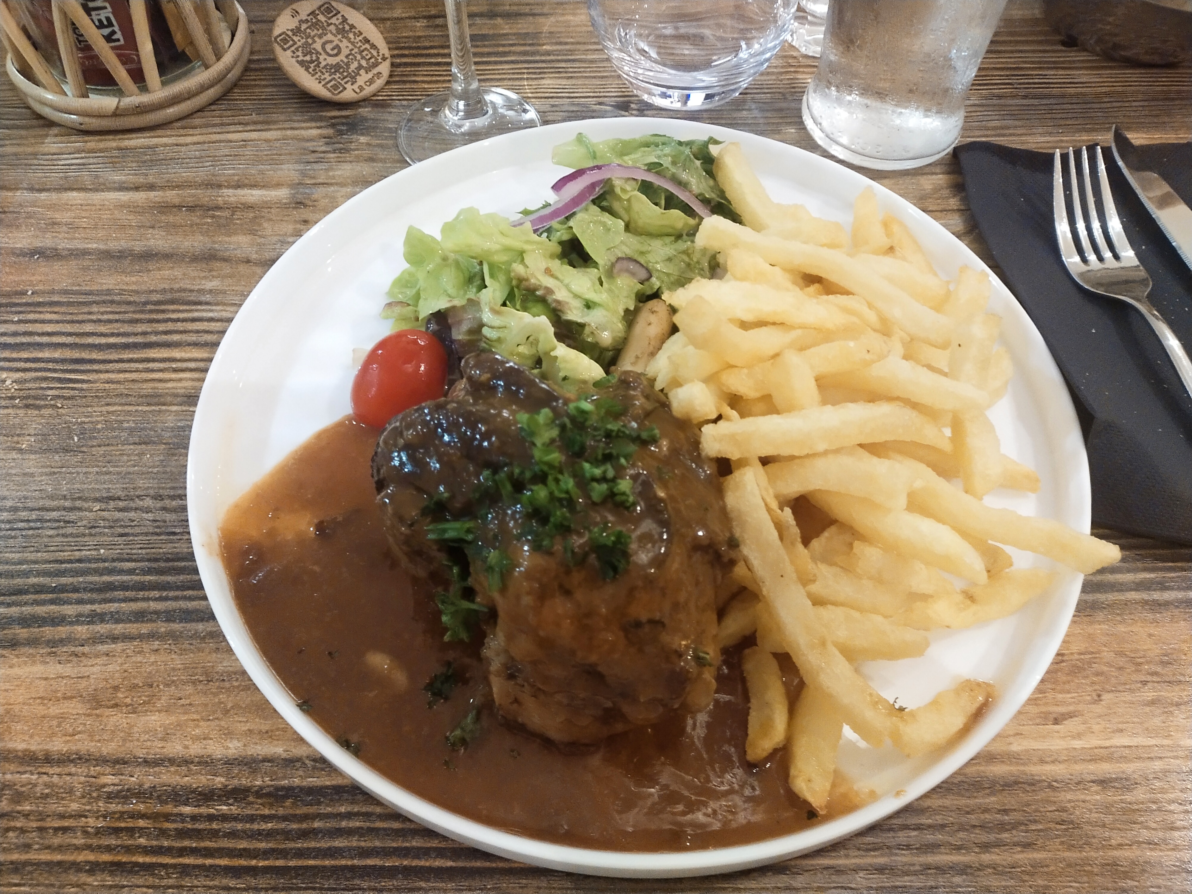 Super bien , assiettes chaudes, couverts changés entre les plats et frites maison. Je recommande sans hésiter. Souris d agneau servie avec saucière à jus, salade