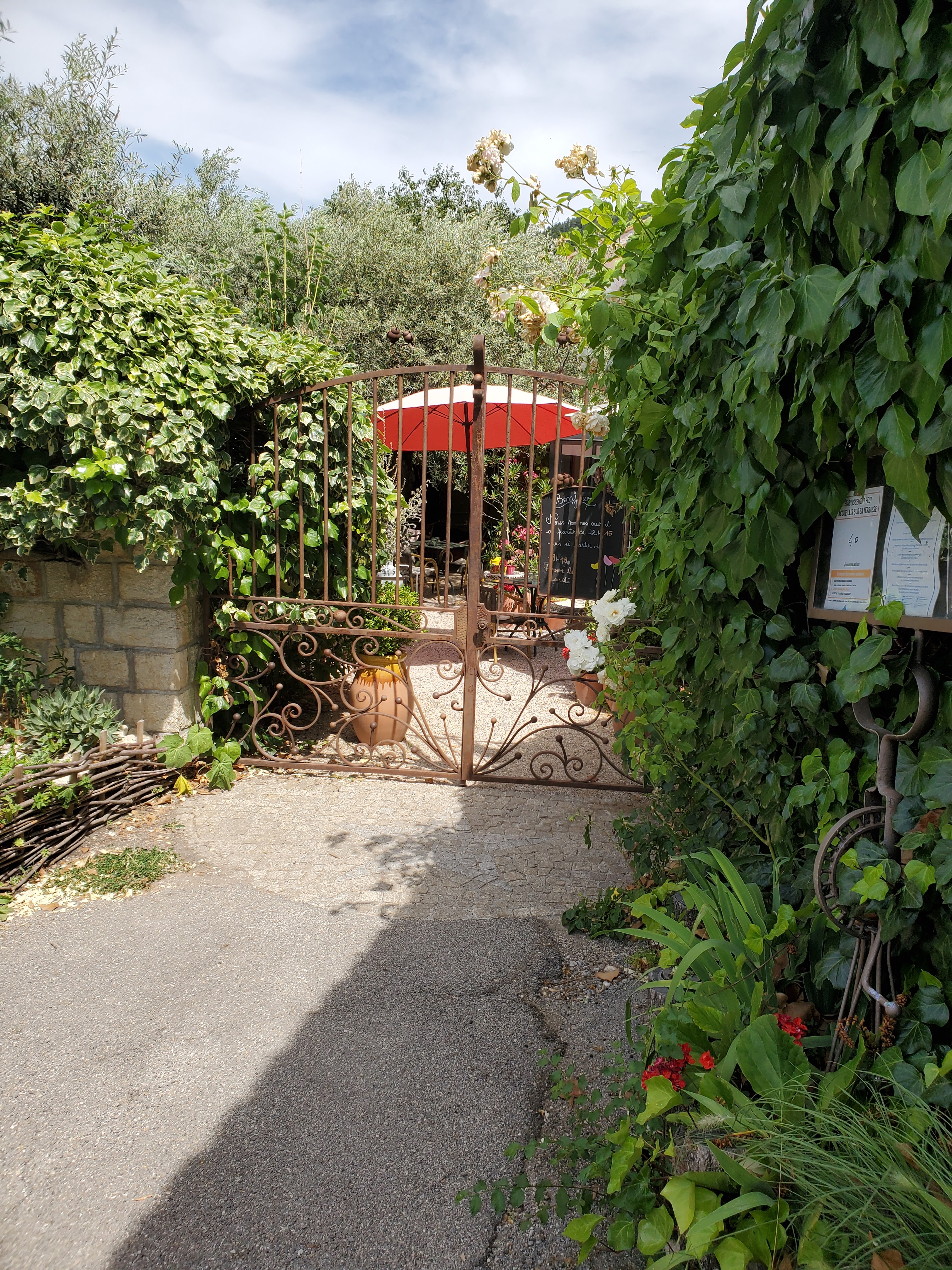 Pas forcément facile à trouver lorsqu'on remonte du centre ville mais idéalement placé lorsque vous êtes au parking en haut du village, vous passez la grille et vous changez d'univers... Le temps se suspend et la poésie du lieu se mélange avec la gentillesse des patrons. Et ensuite l'efficacité de la carte : un choix qui tient en quelques lignes mais des assiettes qui ne demandent qu'à vous retenir à table afin de faire durer le plaisir. Alors soyez frustrés si vous n'avez pas réservé et s'il n'y a plus de place quand vous viendrez leur rendre visite !