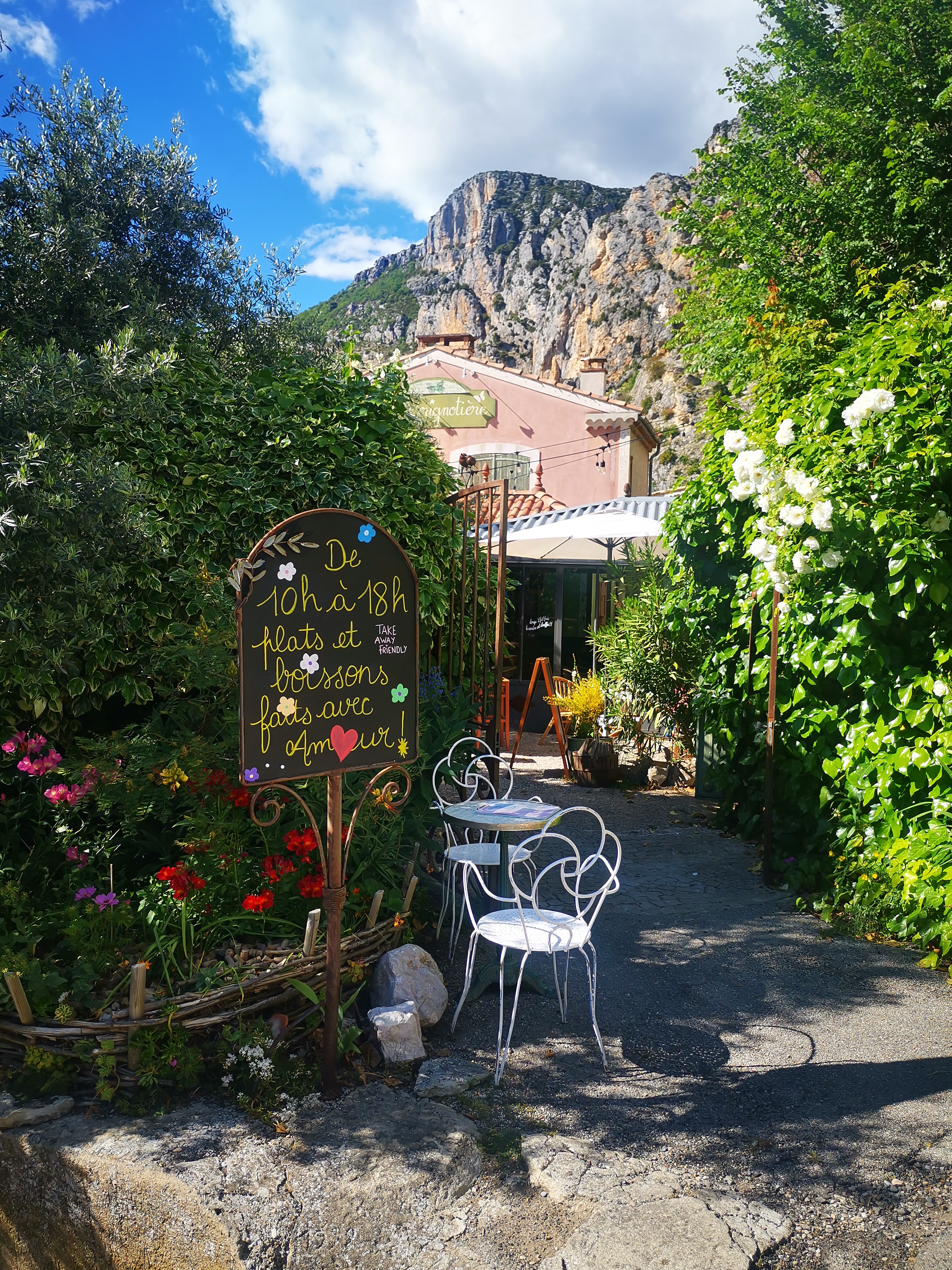 Restaurant avec un beau cadre, jardin décoré par Sandrine avec des peintures fait main (bravo Sandrine!), le service était très agréable même si il y avait un peu d’attente, la nourriture fait maison, gouteuse et de saison et les cocktails originaux. Une très bonne option dans une ville touristique comme Moustiers! Réservez !!