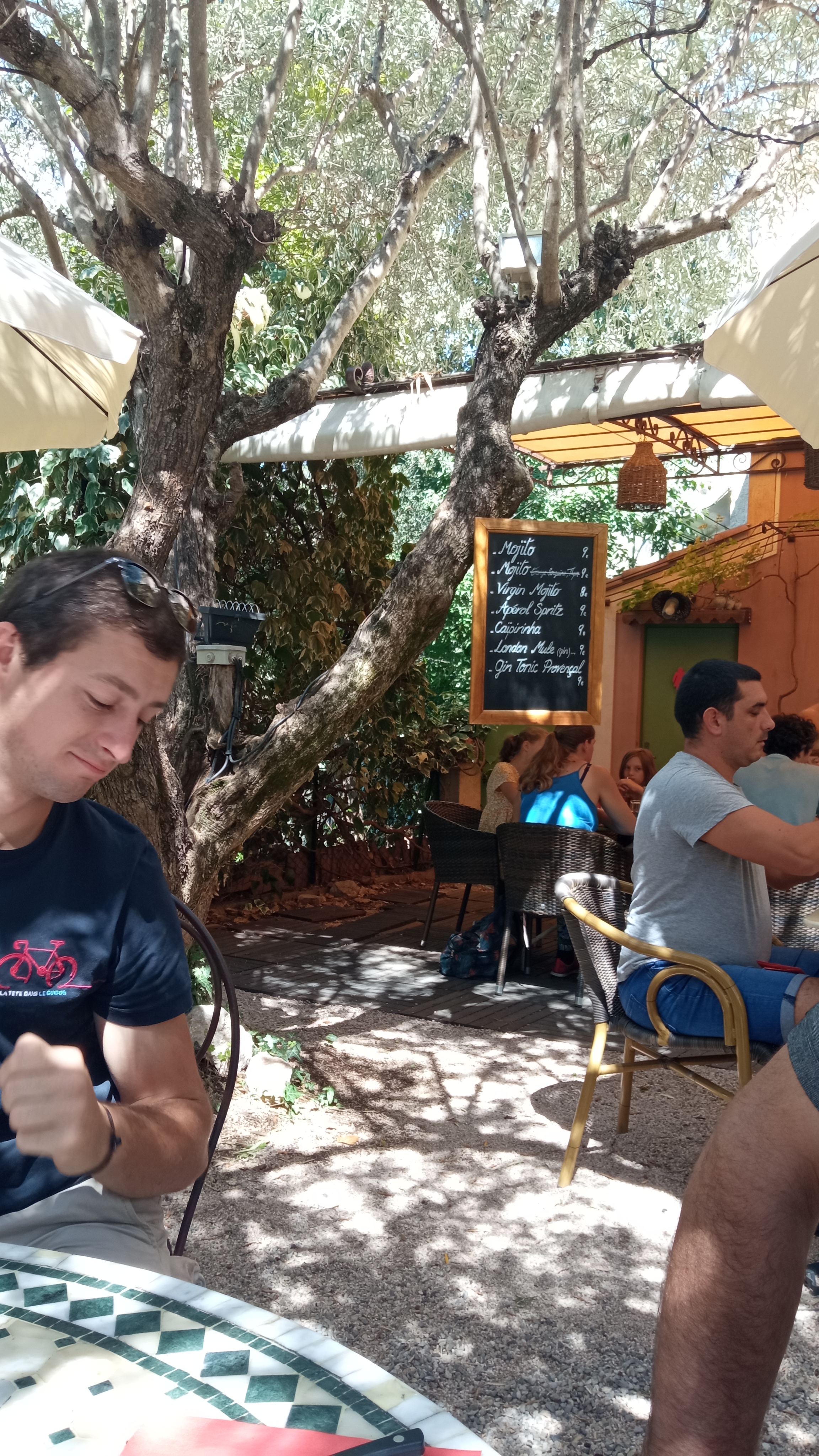 Repas à 6 entre amis le midi sur une terrasse ombragée très sympa. Bons petits plats très frais délicieusement préparés. La serveuse (tatouée) est souriante et sympa. Belle étape à Moustier.