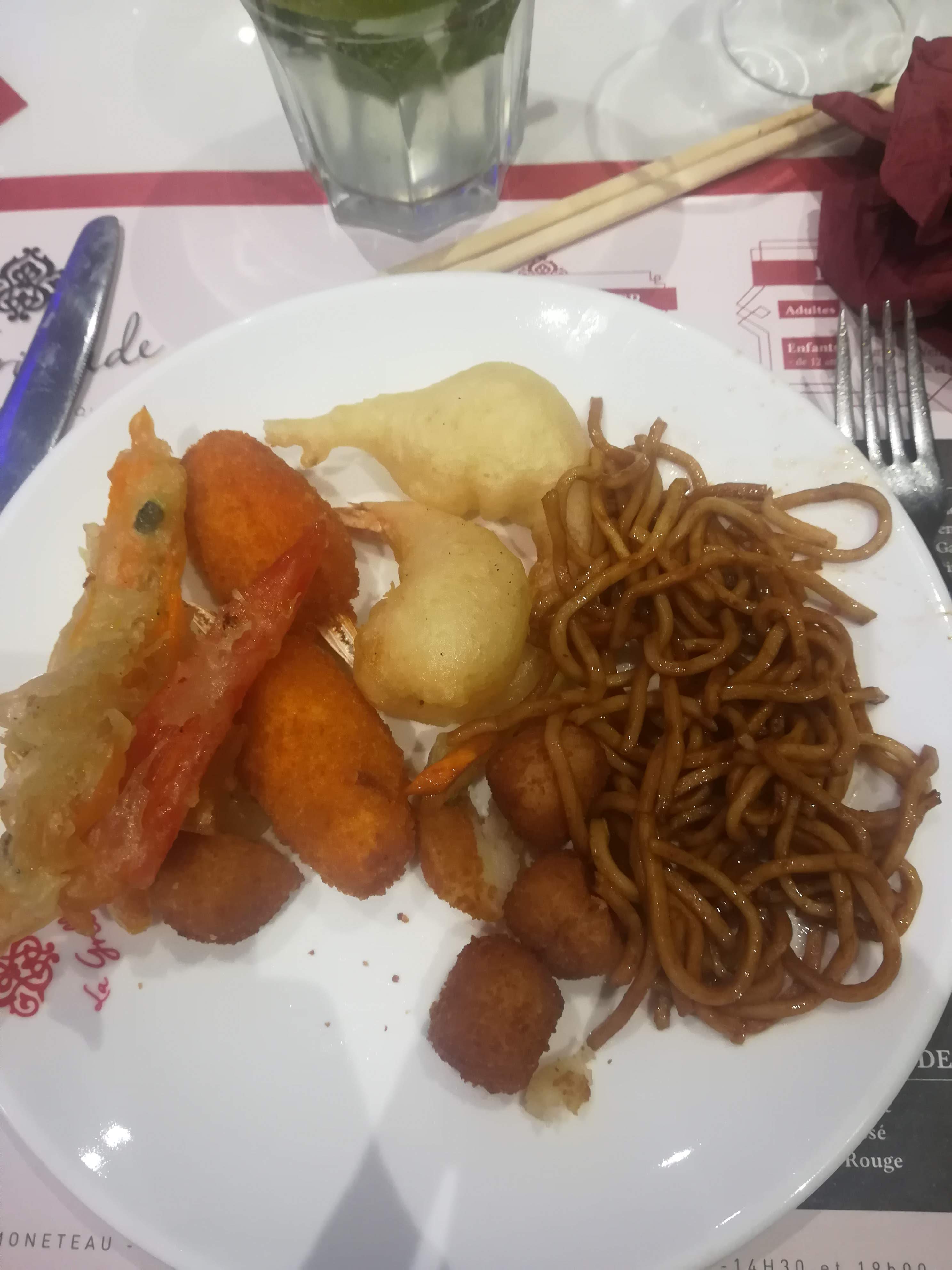 Très grand restaurant chinois . Point positif : énormément de choix niveau alimentation beaucoup plus que dans les autres resto du même type . Point négatif : certains plats sont froid (frite de patate douce, poulet curry, bouchées et d'autres encore ) . La plupart des brochettes de poulets n'étaient pas cuites ! Viande rose au milieu et les crevettes cuisinées ou en beignets n'ont absolument aucun goût . C'est très dommage il faudrait faire attention à ça. Cela dit j'y retournerai volontiers pour goûter d'autres bonnes choses 😊