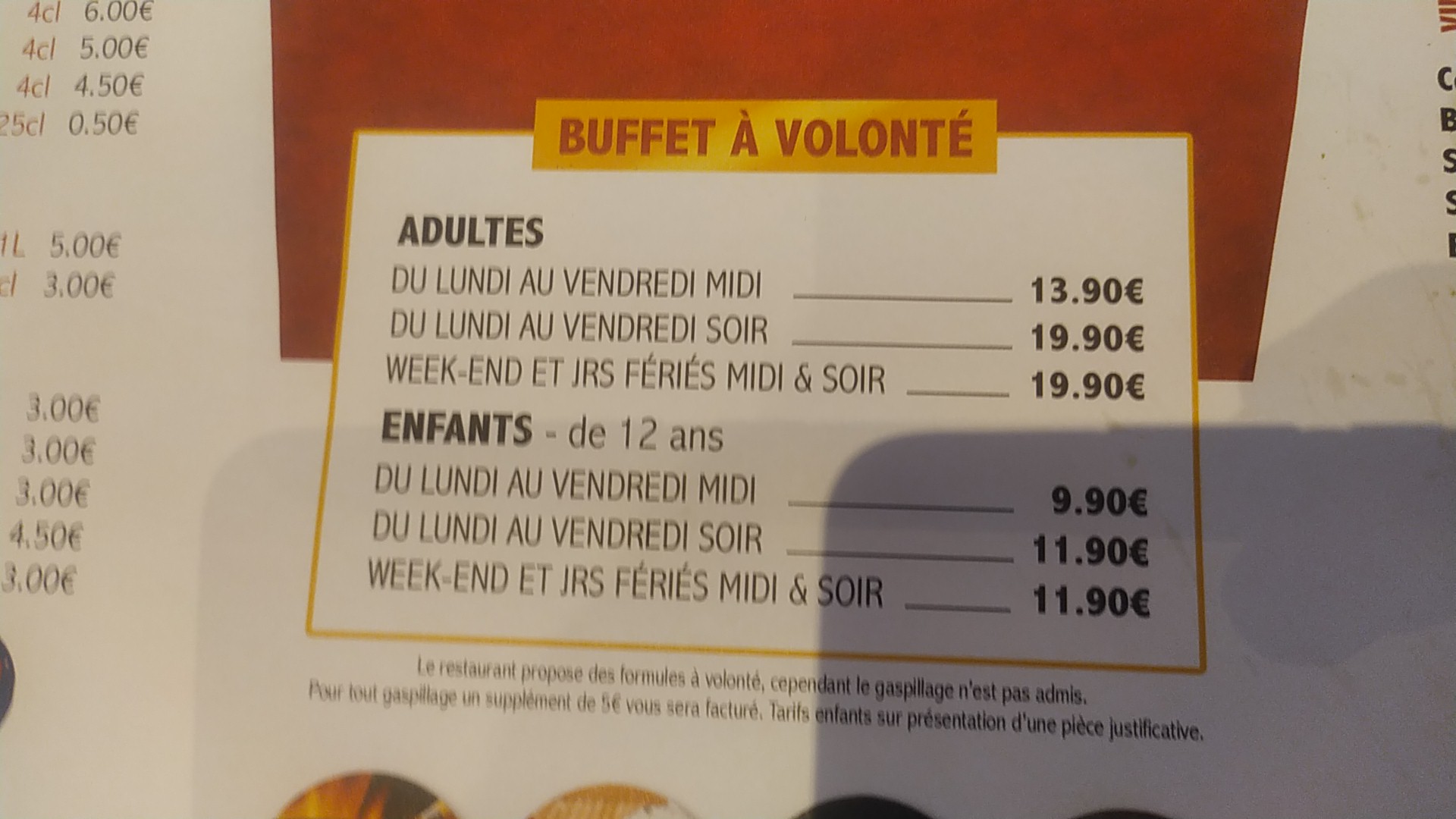 Grosse déception. Les serveurs ne sont pas venus nous proposer de boisson, il a fallu se débrouiller pour trouver une carafe d'eau et le choix des desserts était plutôt médiocre... Quand au prix, c'est affiché en gros BUFFET À 15,90 € à l'extérieur du restaurant, mais vous payez 16,90€ ! Verifiez vos tickets de caisse ! Nous en avons informé l'employé à la caisse mais il n'a rien voulu savoir. C'est l'arnaque !
