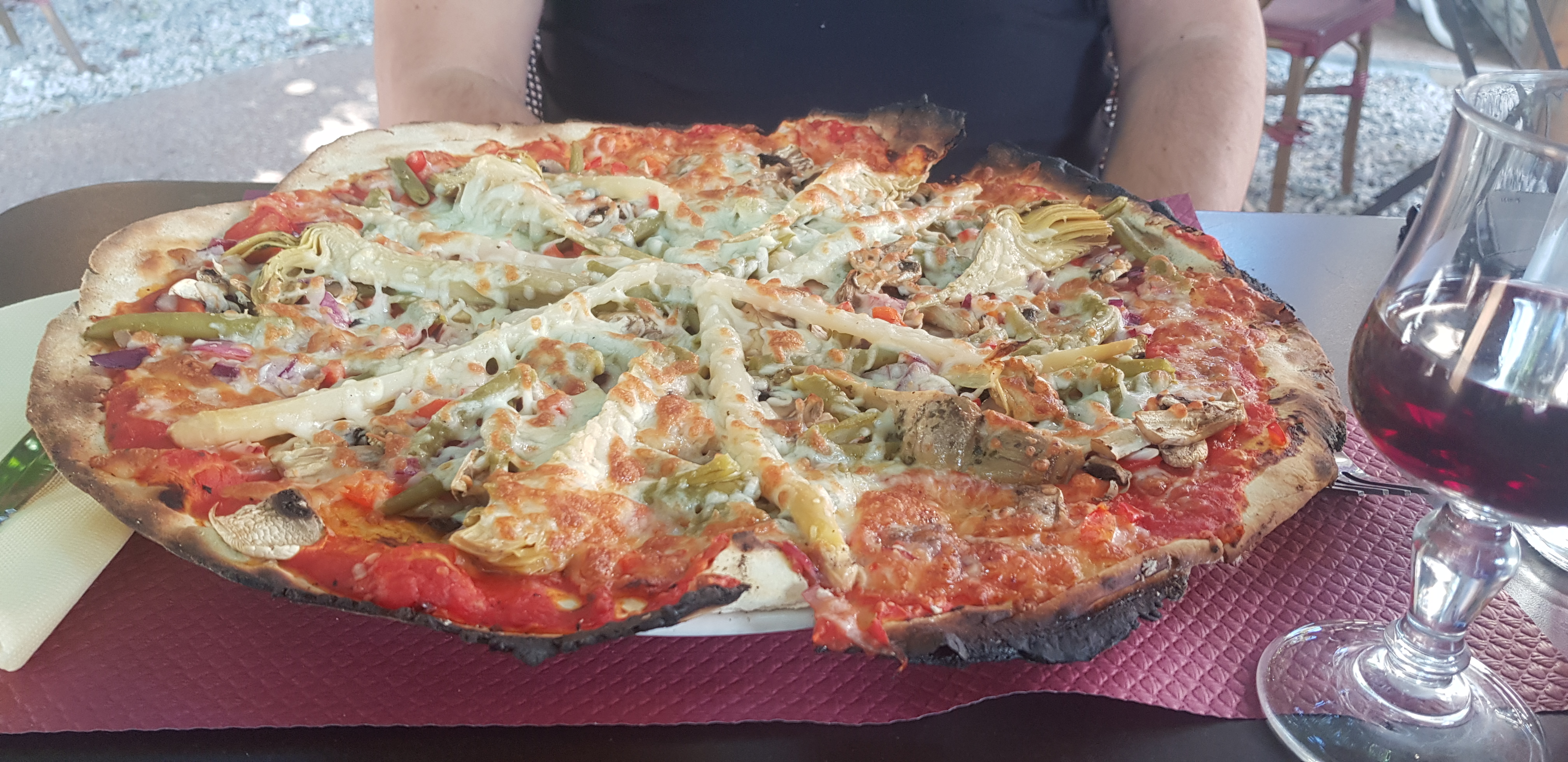 Le cadre est très sympa, dans le style guinguette : sous les platanes avec des lampions multicolores. Deux poules se baladent en liberté entre les tables pour quémander quelques grains pour subsister... L'ambiance est détendue et les serveuses sont souriantes. Les assiettes sont copieuses et les pizzas très garnies. Le tout pour un prix raisonnable. Pour passer un bon moment en famille ou entre amis, essentiellement pendant les beaux jours car le restaurant ferme de début octobre à début mai...